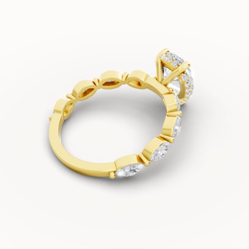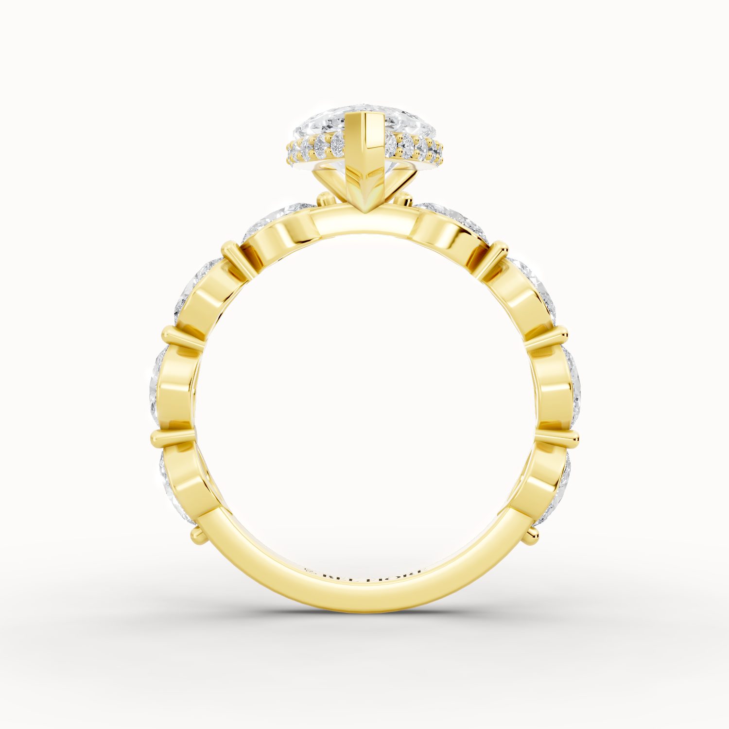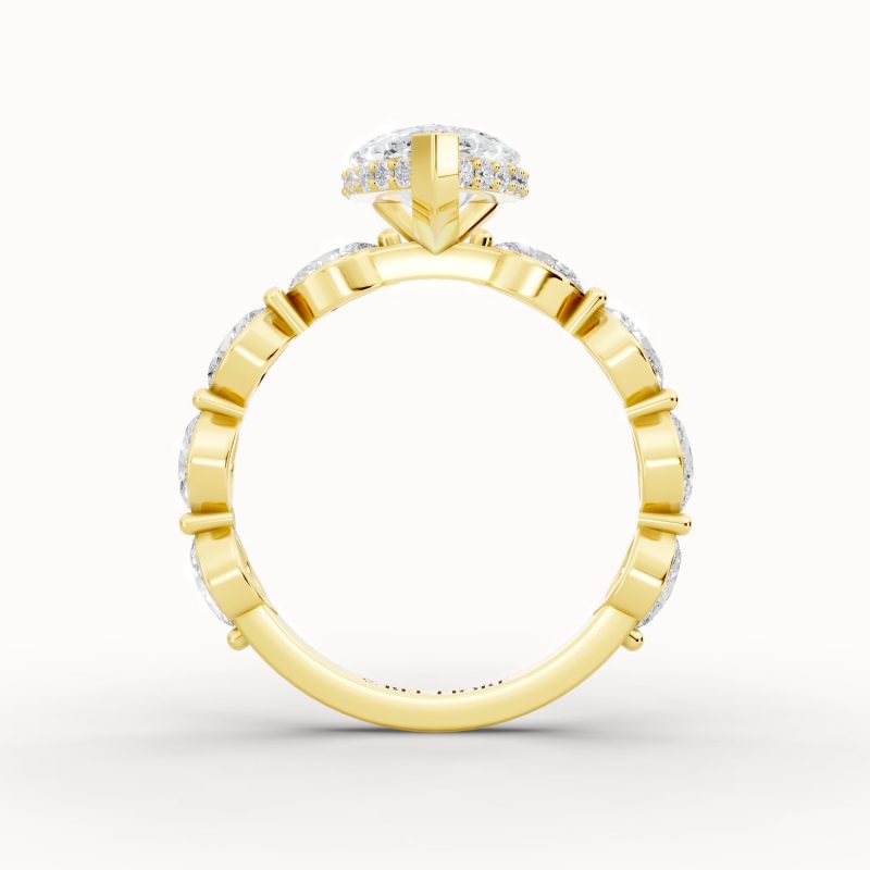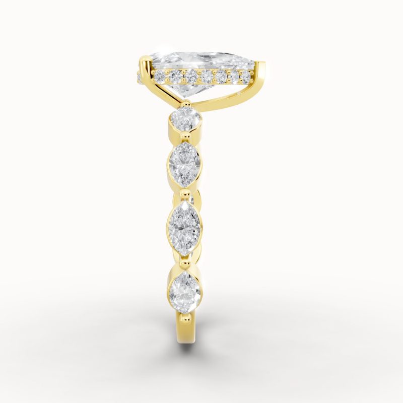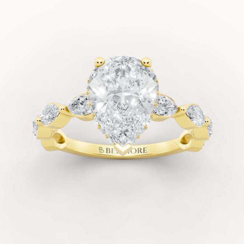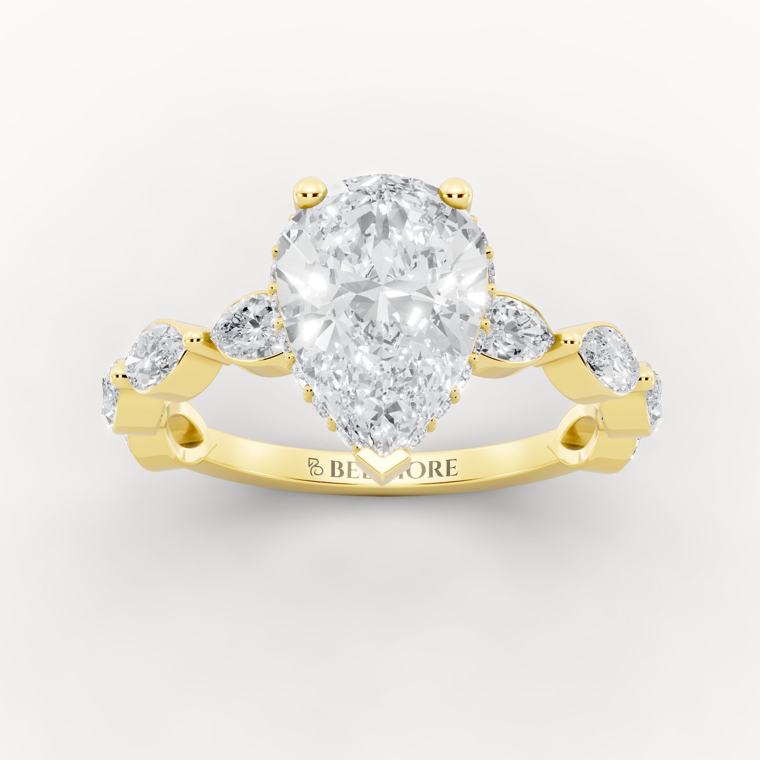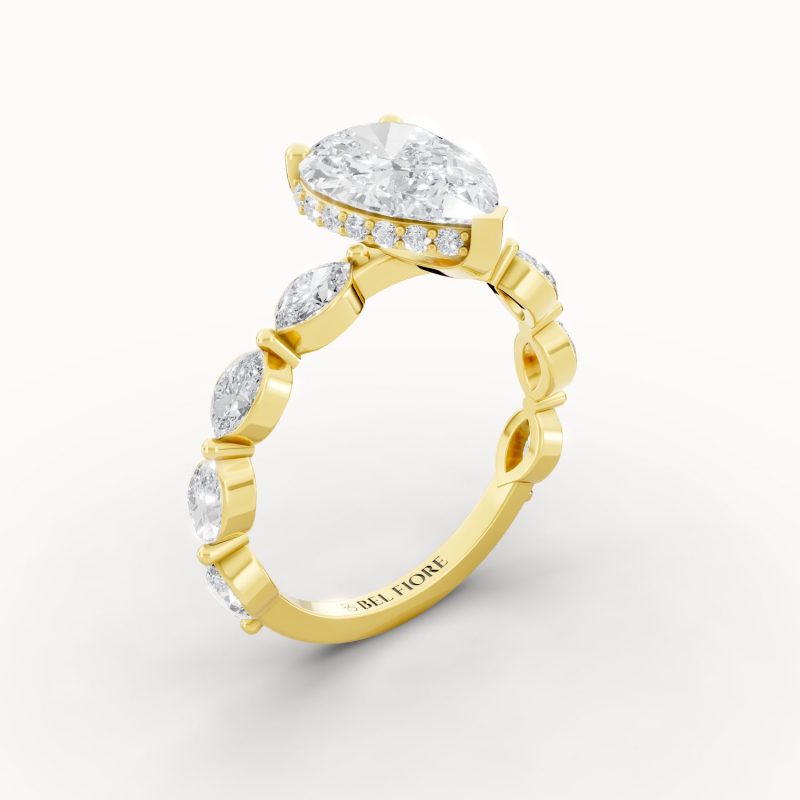 Crafted in radiant yellow gold, this exquisite ring showcases a dazzling pear-shaped center diamond accented by a shimmering row of side stones. The golden warmth complements the brilliance of the diamonds, making it a timeless celebration of love and light.
