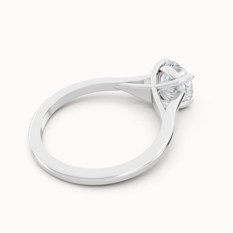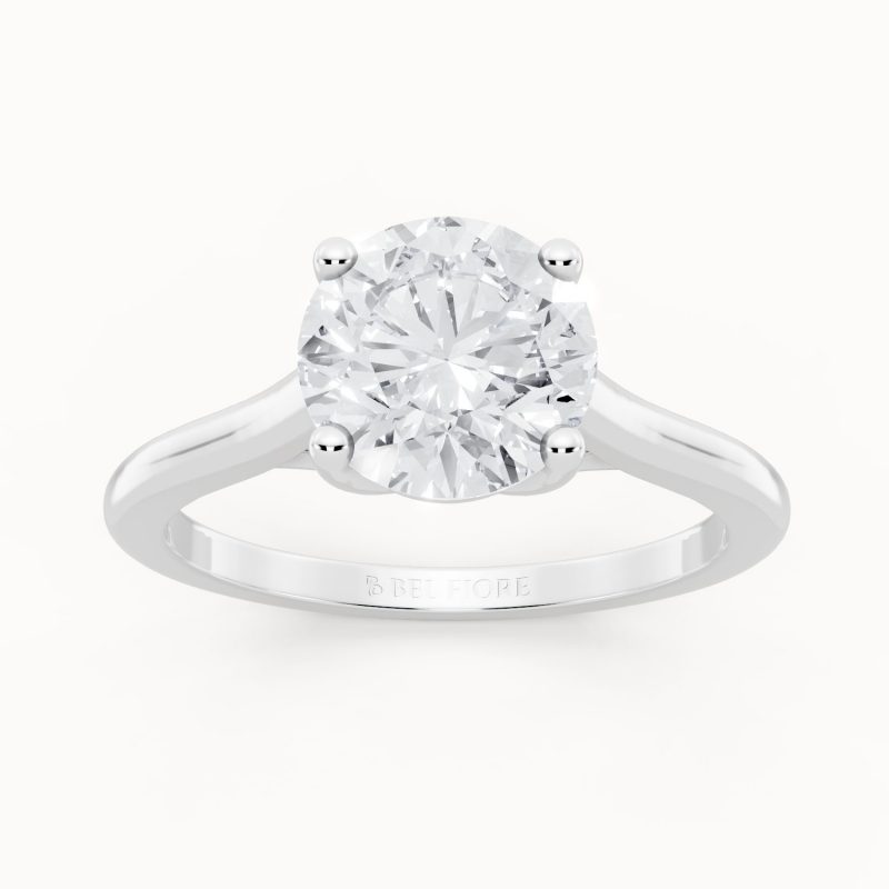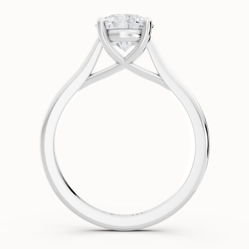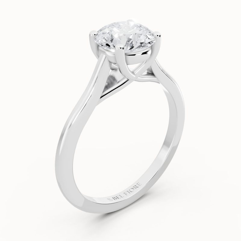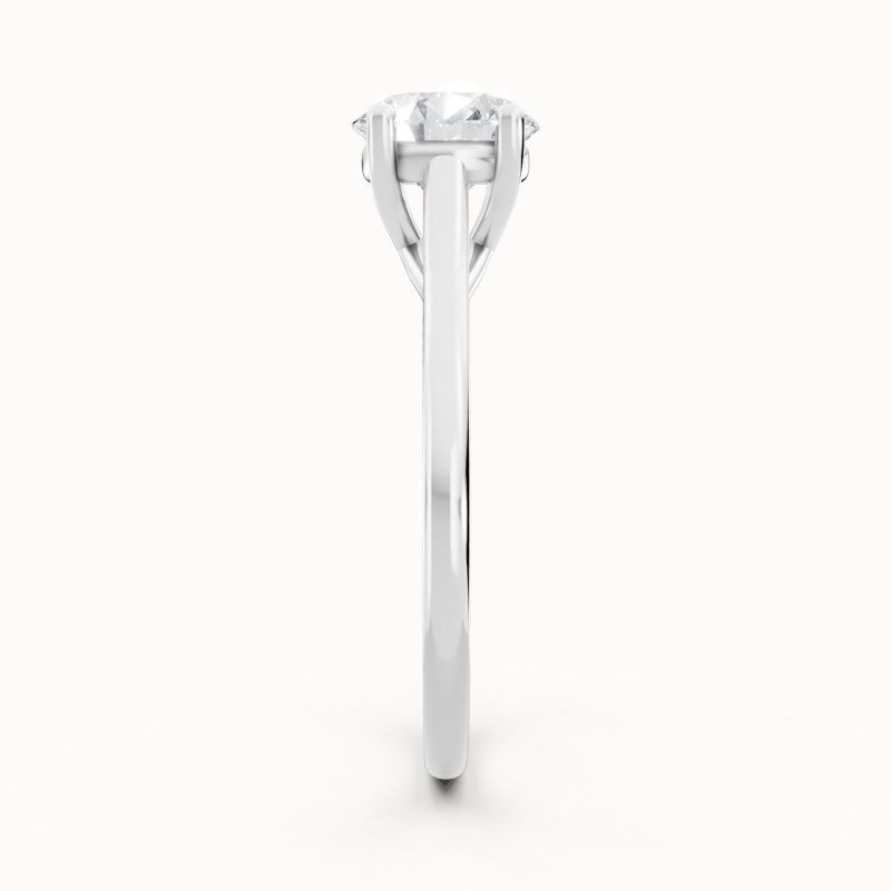 Set in sleek white gold, this solitaire design enhances the brilliance of the round-cut center diamond. The cool, polished finish provides a contemporary appeal, allowing the diamond’s fire and sparkle to take center stage.