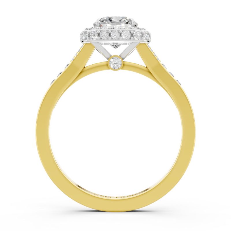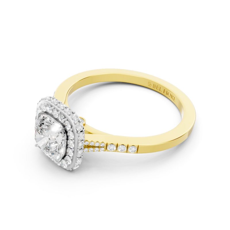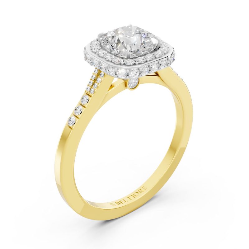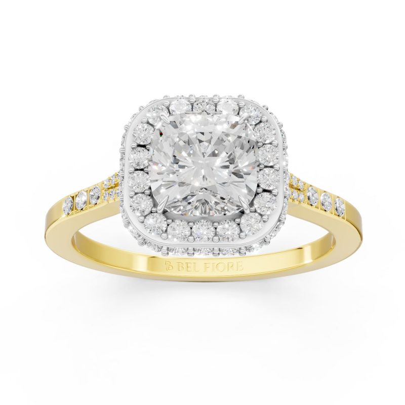 This Bel Fiore masterpiece features a brilliant cushion-cut diamond framed by a dazzling double halo of round diamonds, perfectly set in a white gold head. The warmth of the 18K yellow gold band contrasts beautifully with the cool elegance of the white gold setting, enhancing the sparkle and dimension of the design.