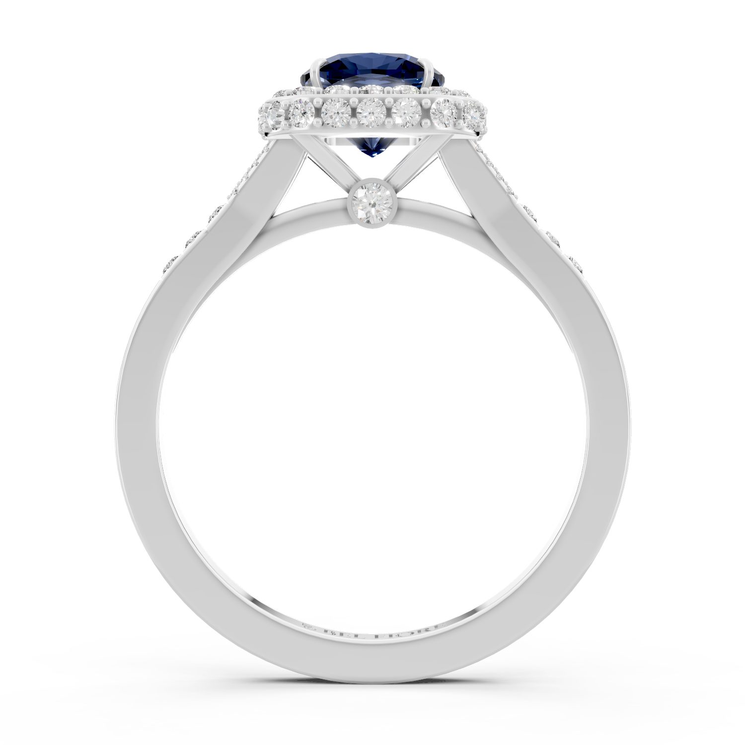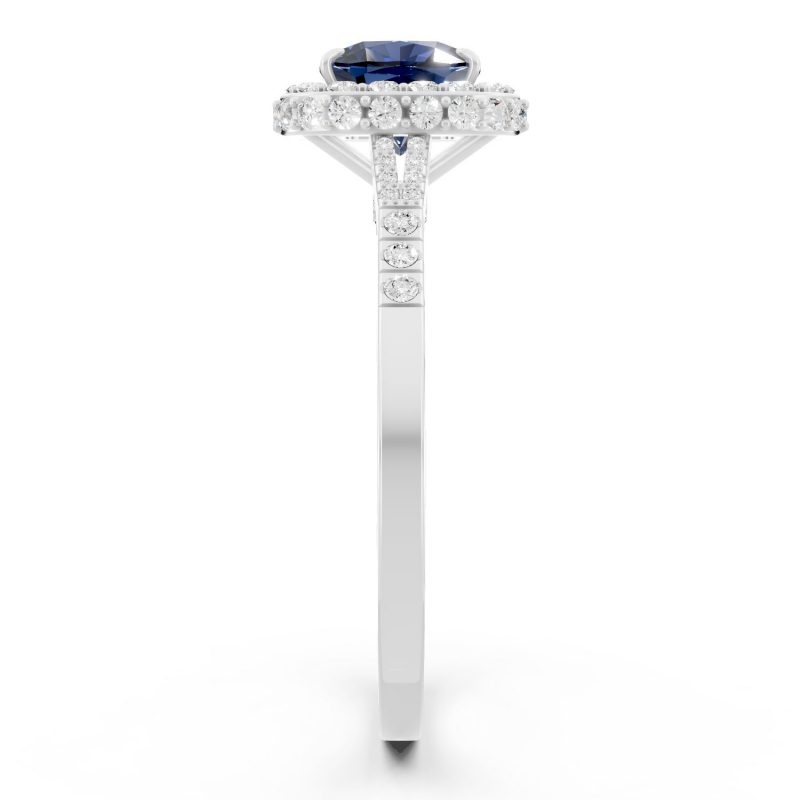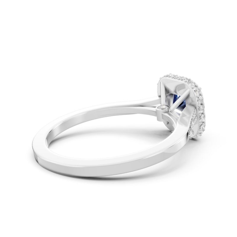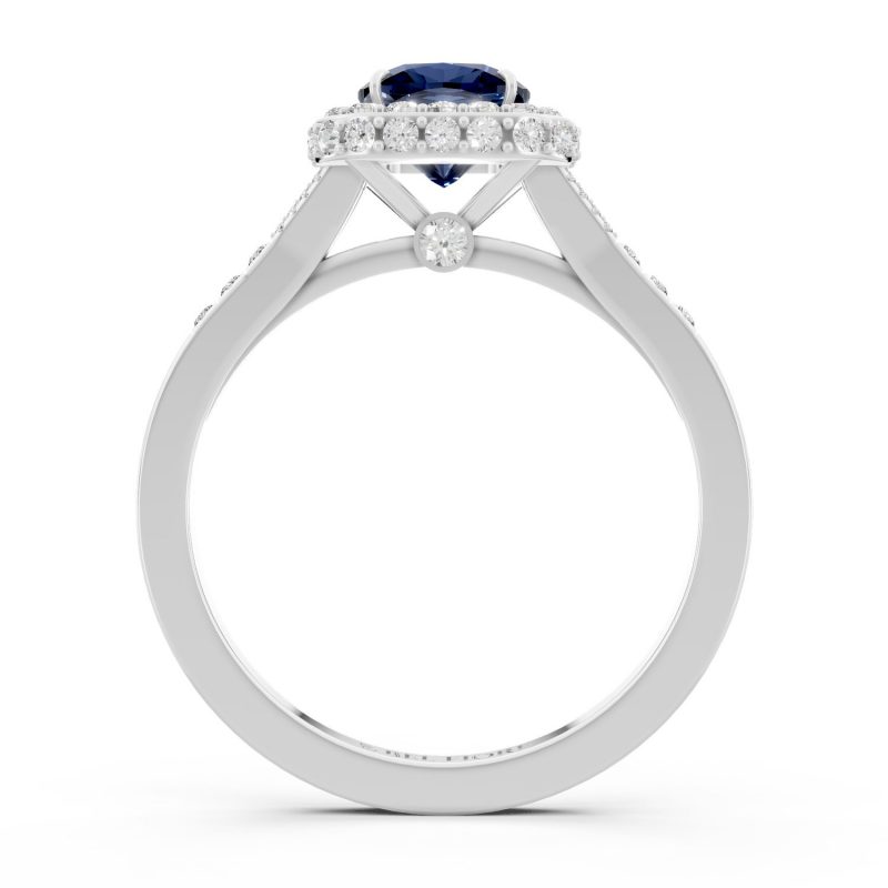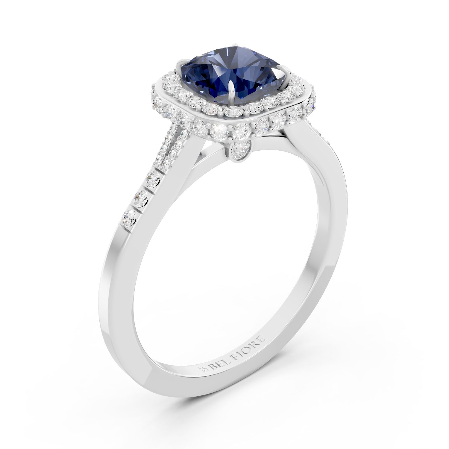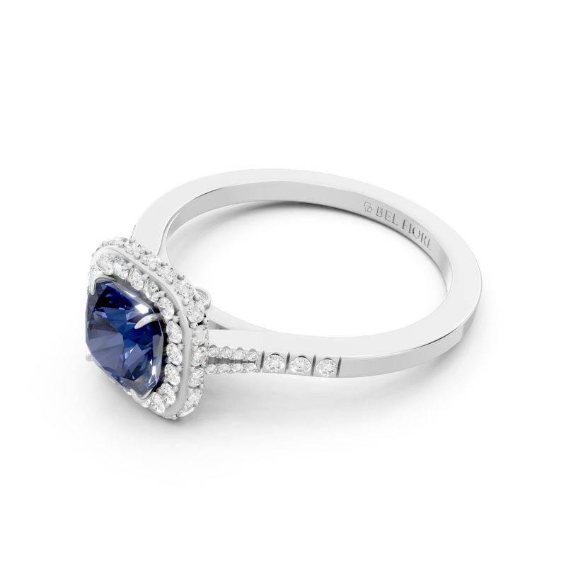 Timeless and luminous, this Bel Fiore ring features a deep blue cushion-cut gemstone, gracefully embraced by a double halo of round brilliant diamonds. Set in 18K white gold, the cool metal accentuates the sapphire-like stone’s depth, creating a refined and elegant silhouette with striking clarity.