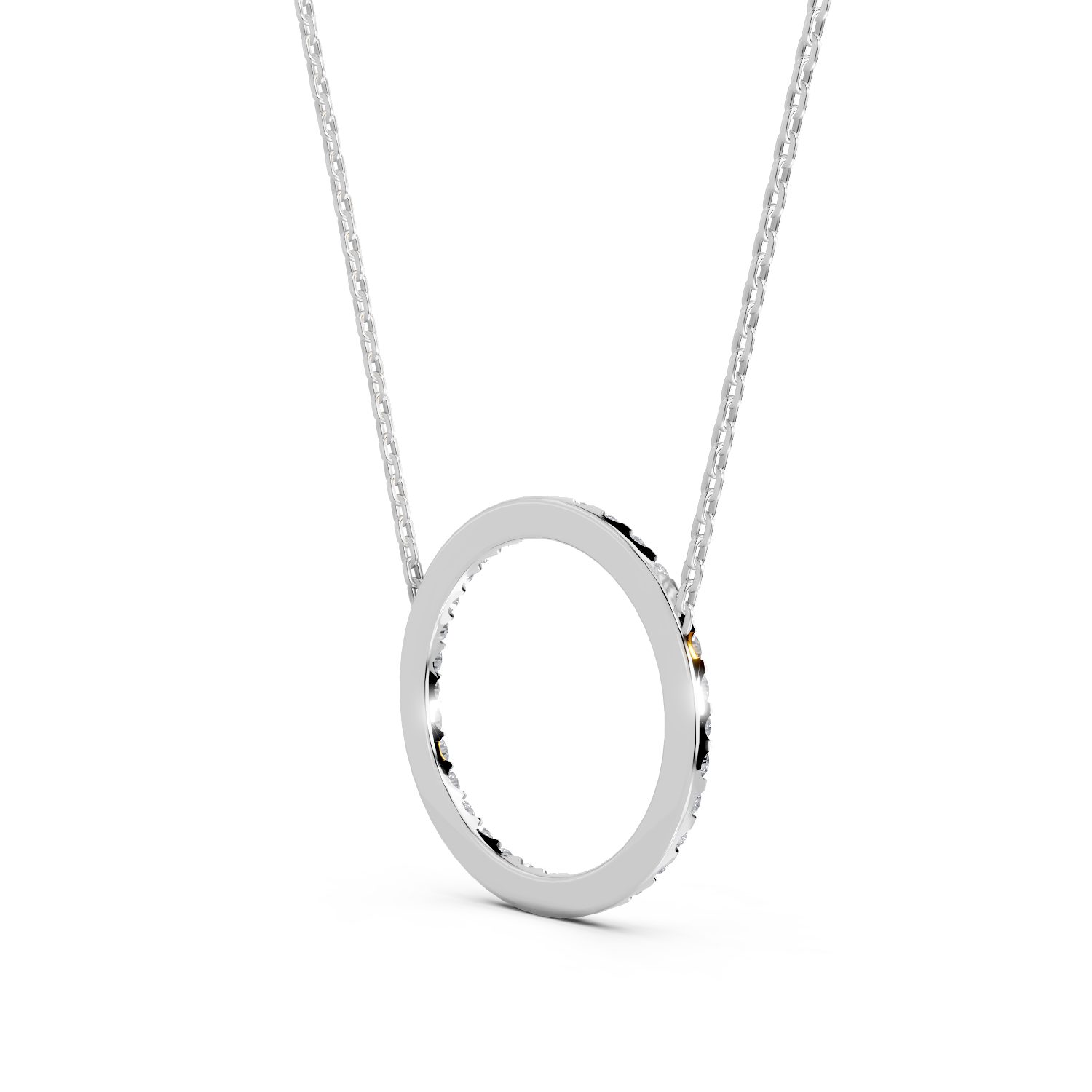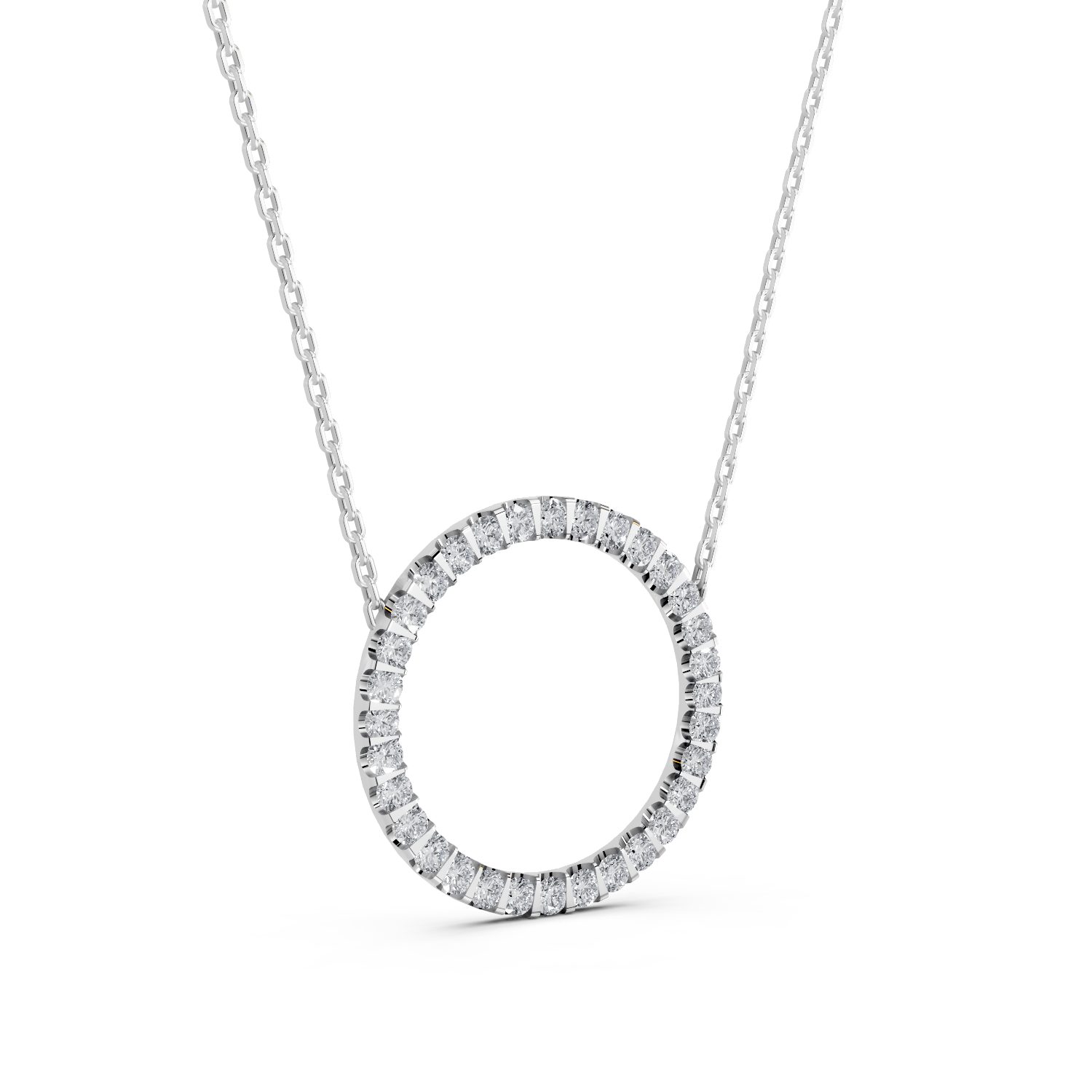 The Diamond Circle Pendant features a continuous ring of delicate pavé-set diamonds forming a graceful open circle. Symbolising eternity and unity, its balanced design offers subtle brilliance with contemporary appeal. Lightweight and refined, it layers beautifully or stands alone as an understated statement.