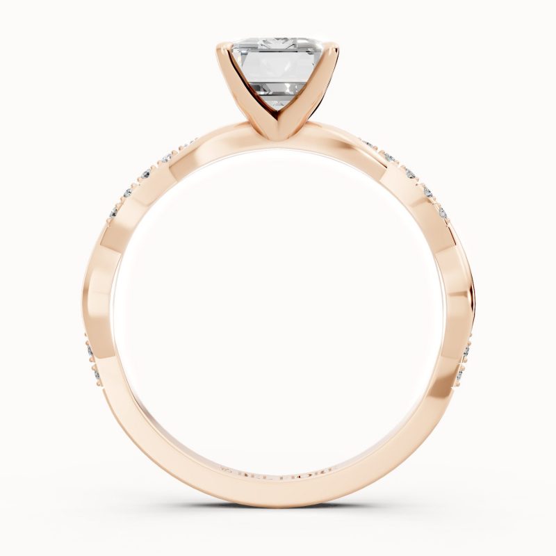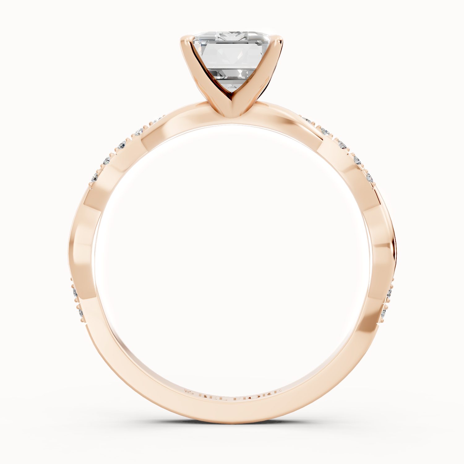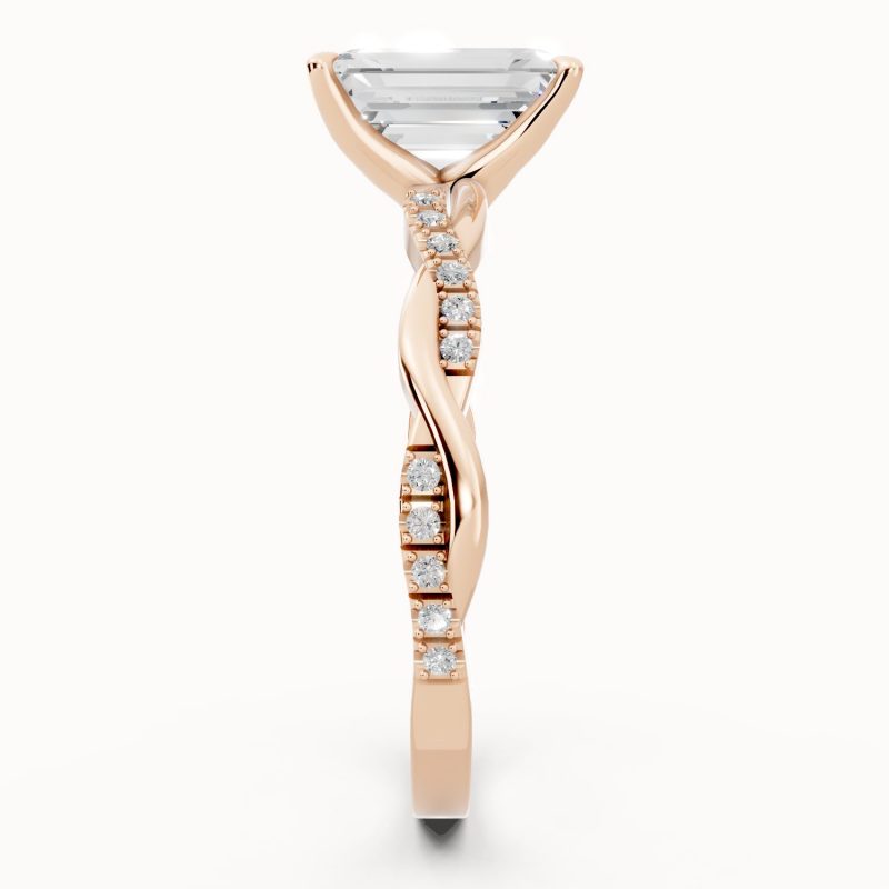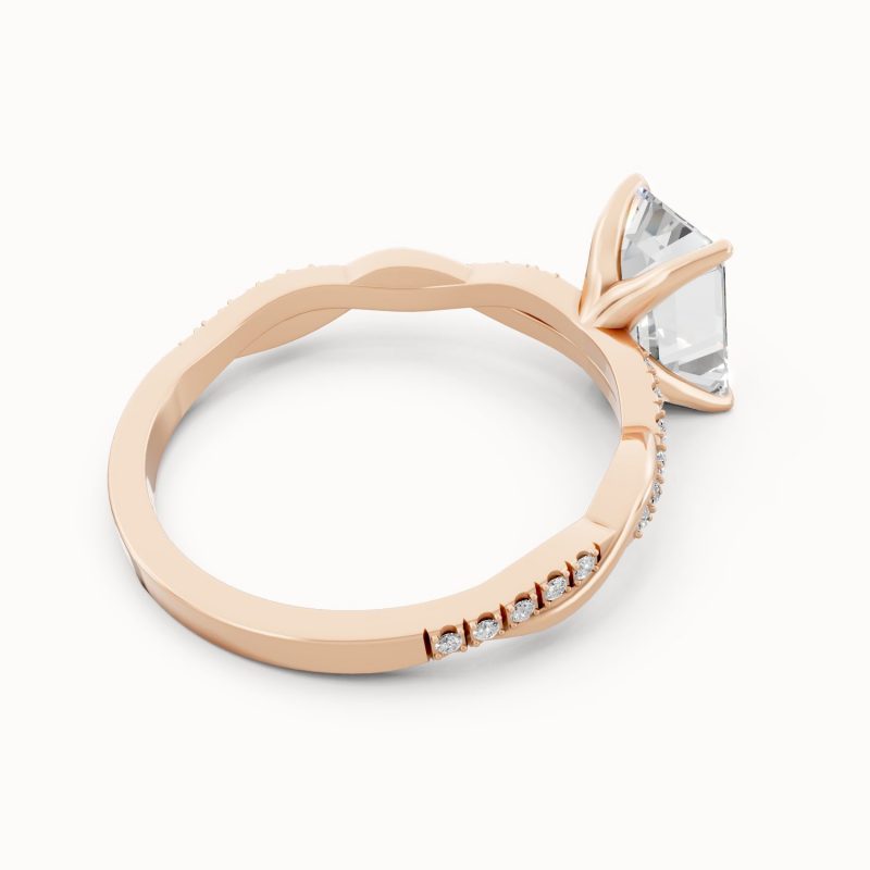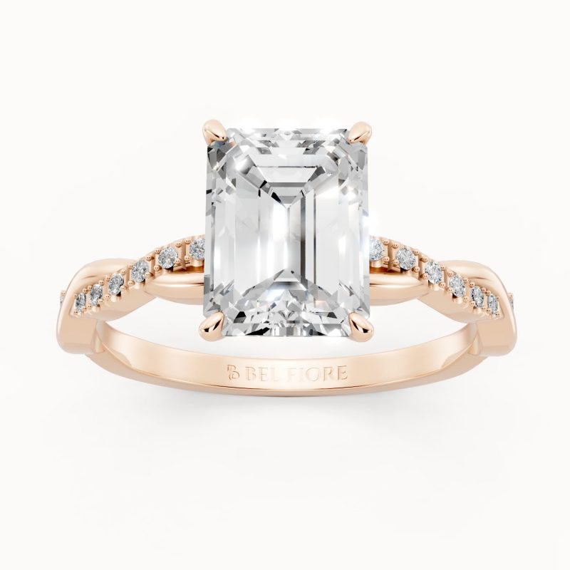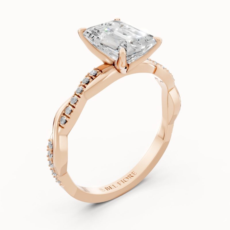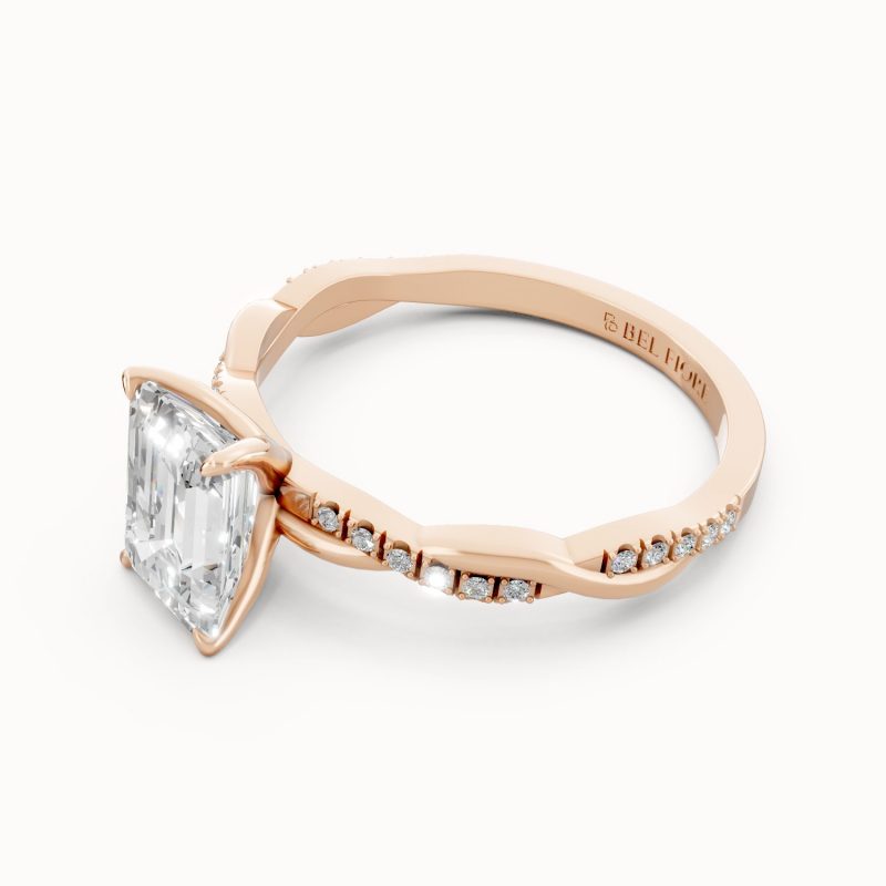 This rose gold ring highlights a stunning emerald-cut center diamond, set atop a delicately twisted pavé band that sparkles with every turn. The romantic blush tone adds softness and warmth to the elegant silhouette, creating a perfect harmony of vintage charm and modern sophistication.