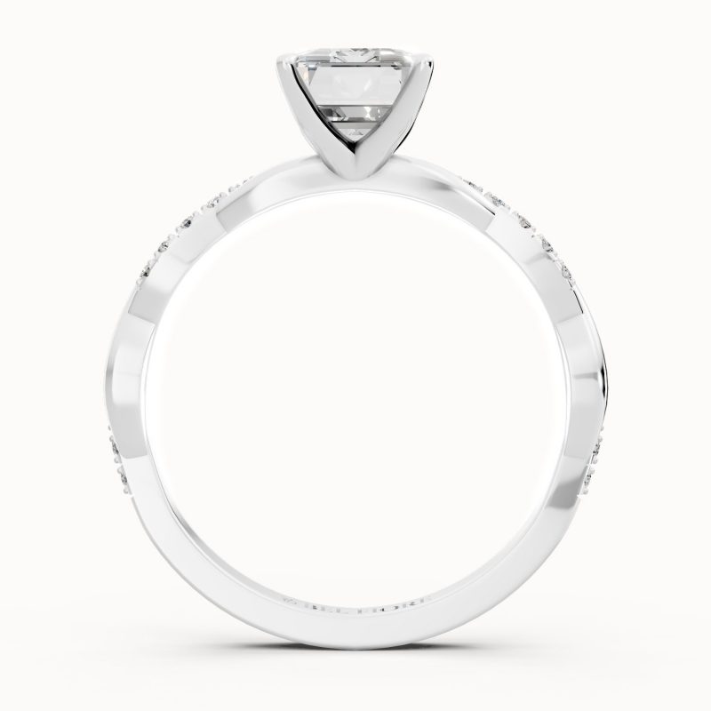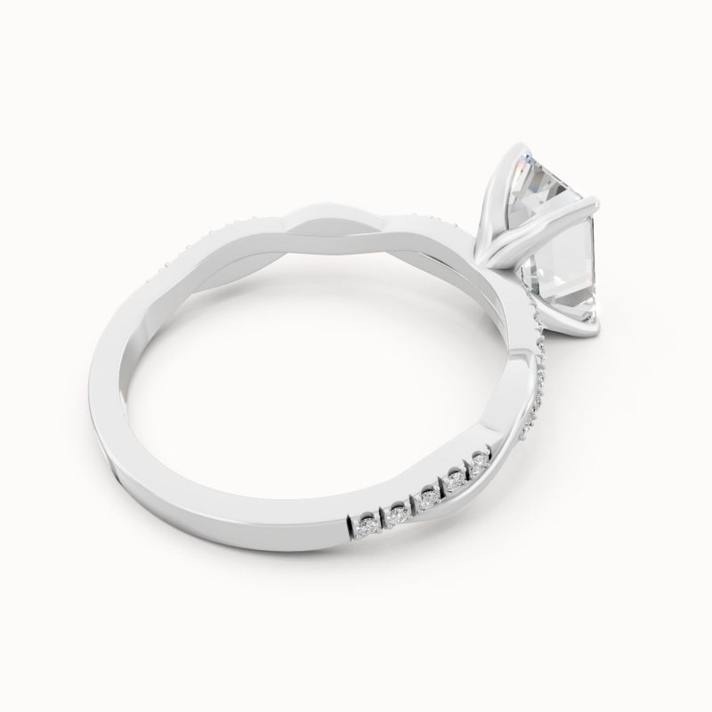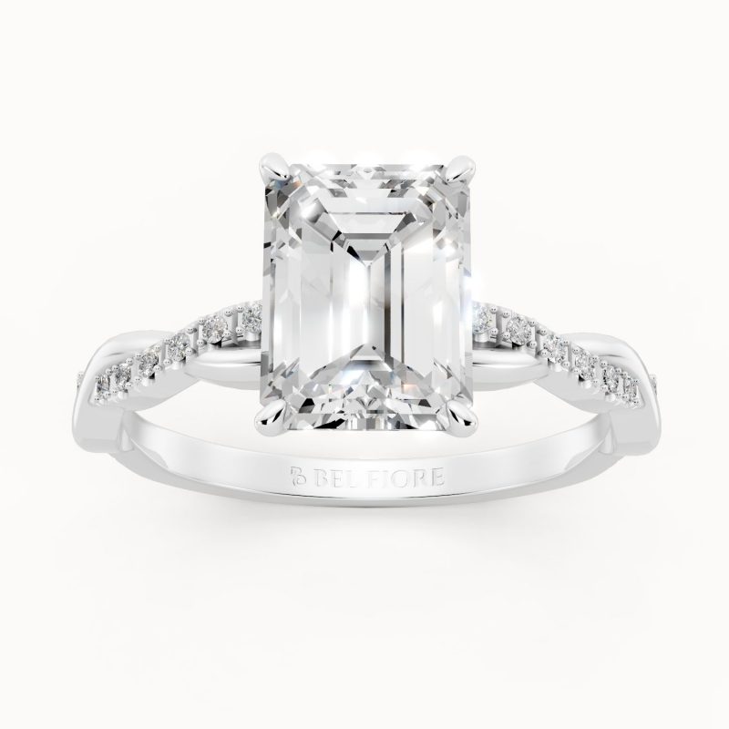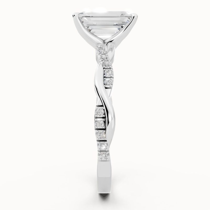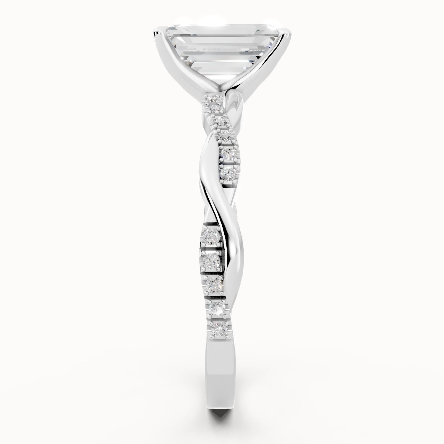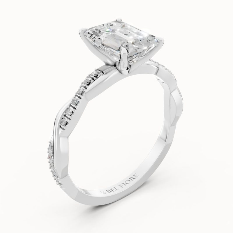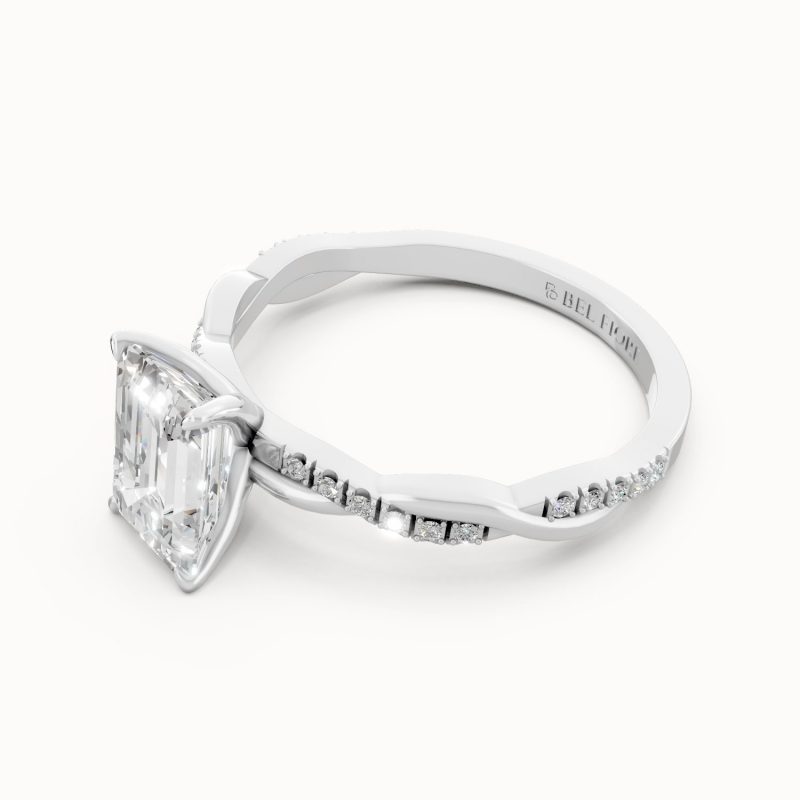 Crafted in sleek white gold, this emerald-cut diamond ring exudes timeless grace. The clean geometry of the center stone is elevated by the gently twisted pavé band, creating a contemporary look that celebrates classic beauty with refined sparkle.