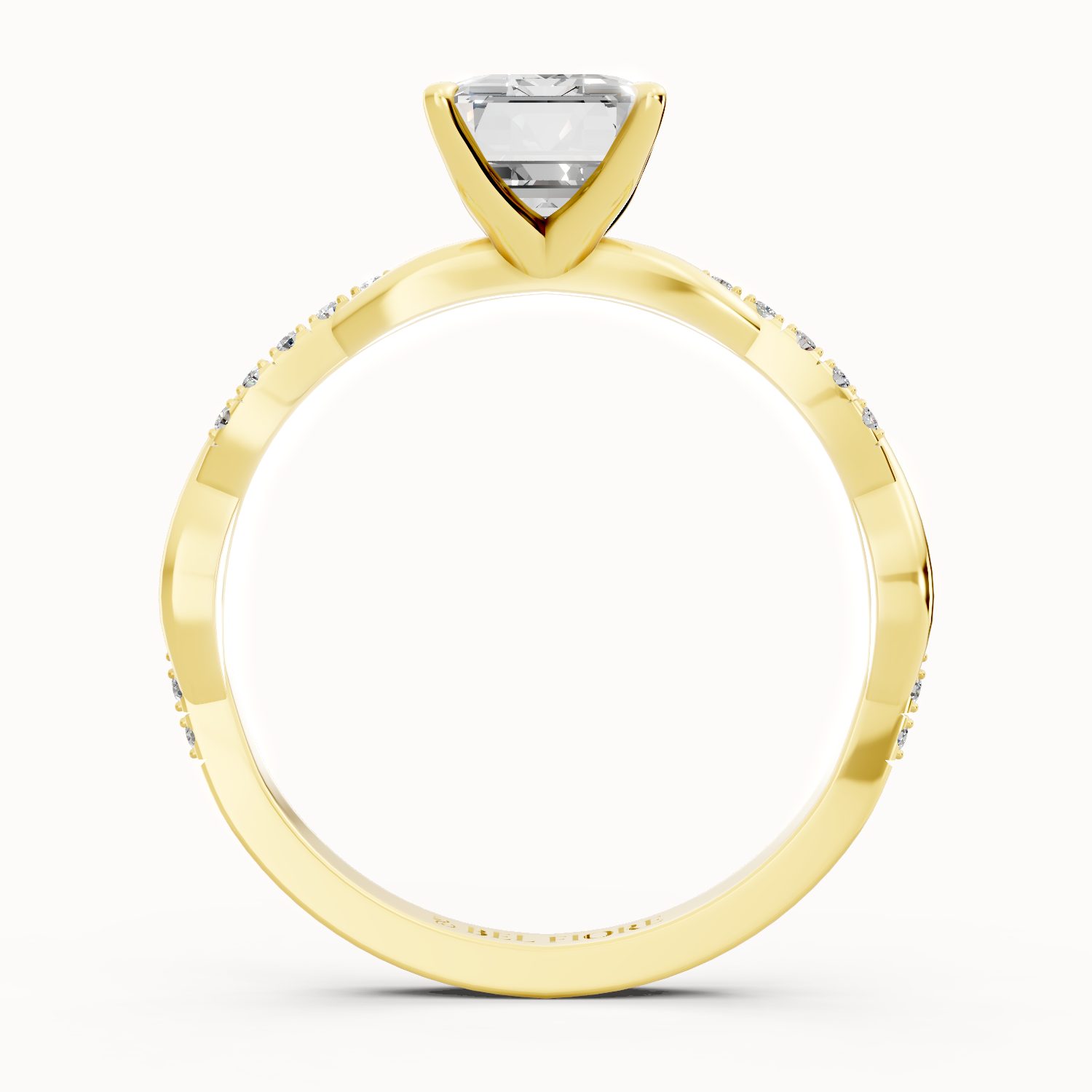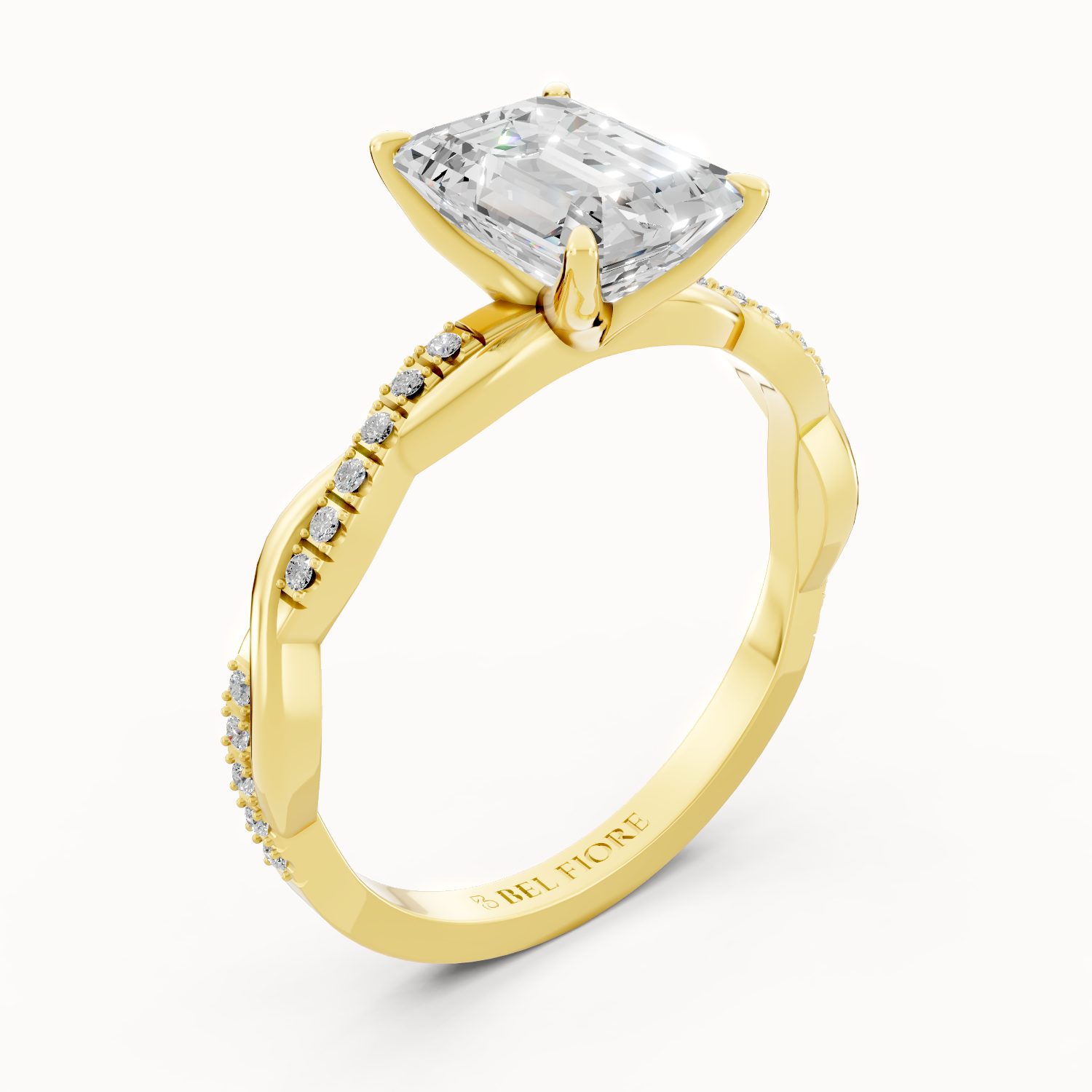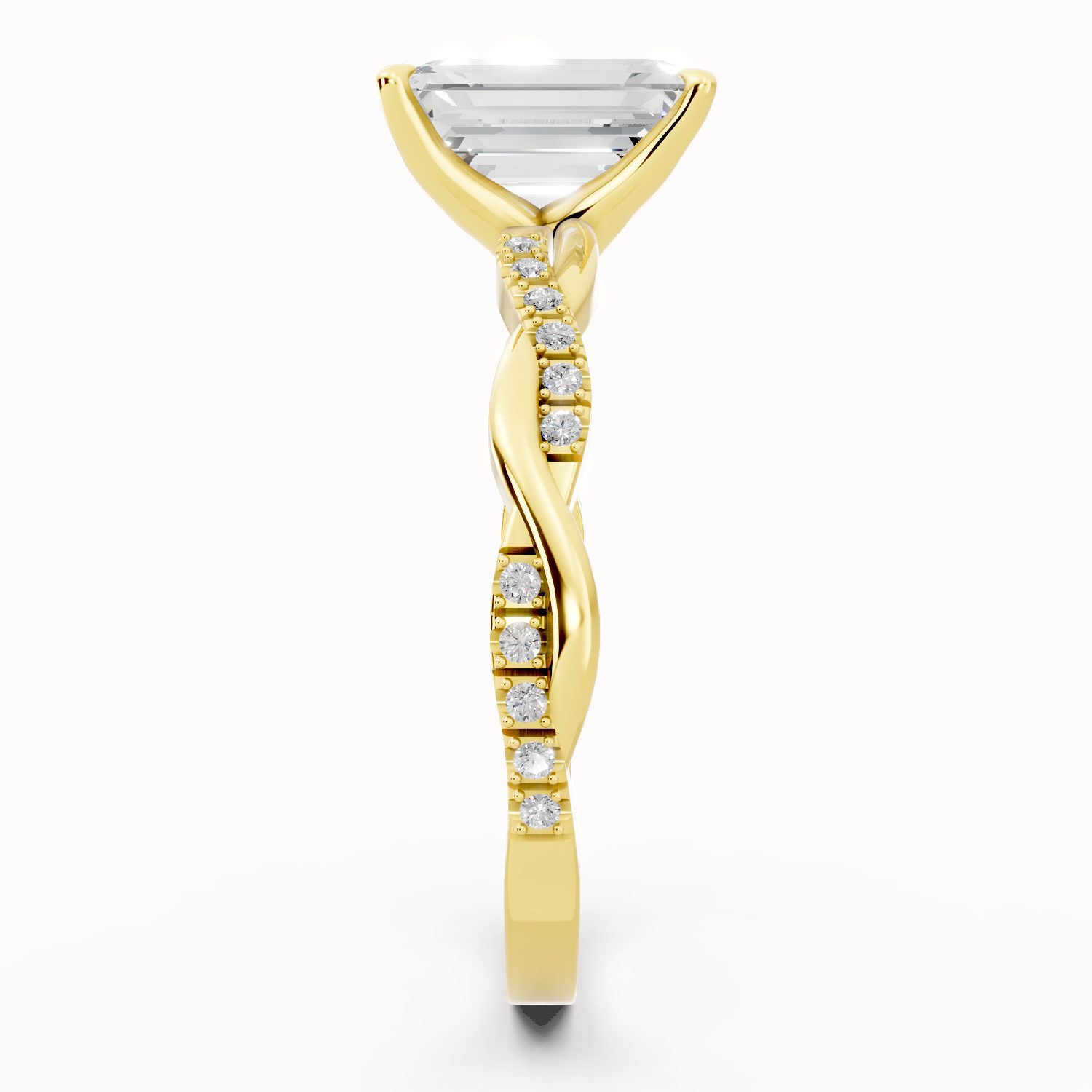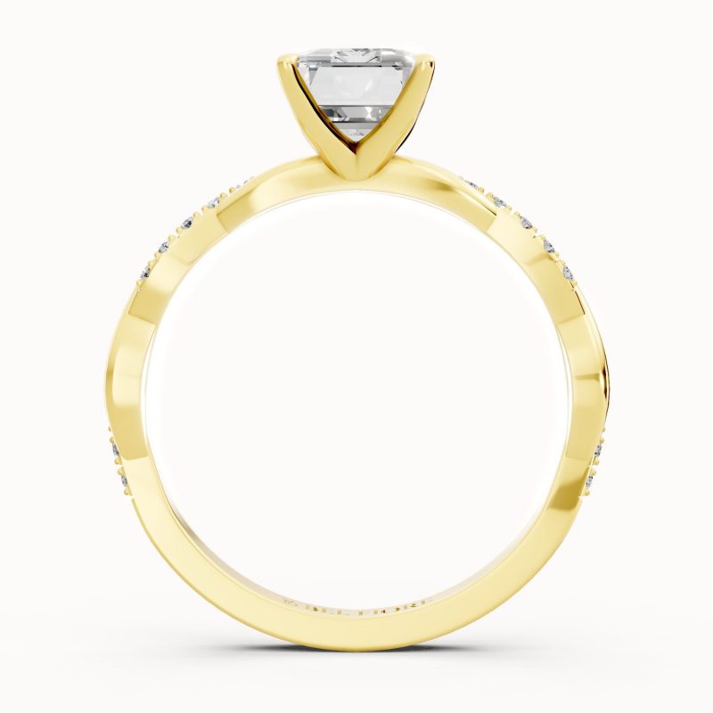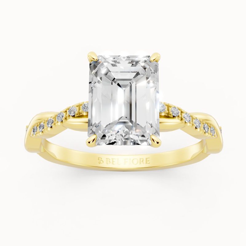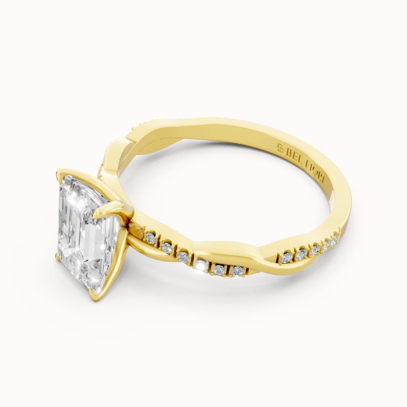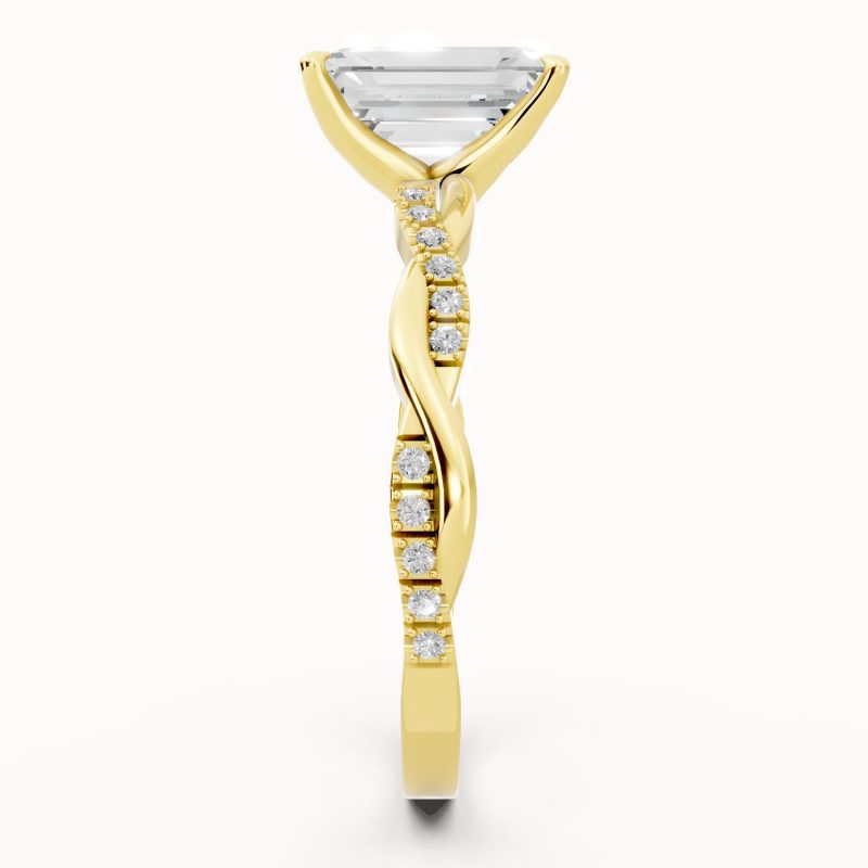In radiant yellow gold, this emerald-cut diamond ring captures the essence of old-world glamour. The gracefully twisted pavé-set band enhances the brilliance of the center stone, making it a bold yet sophisticated symbol of everlasting love.