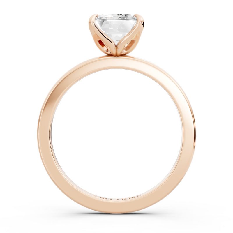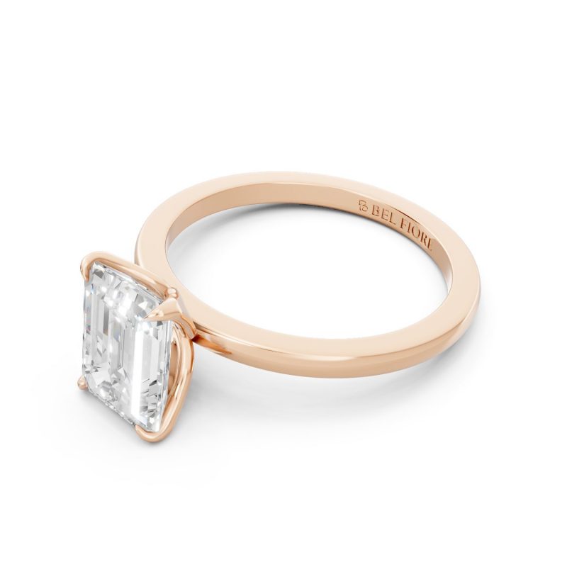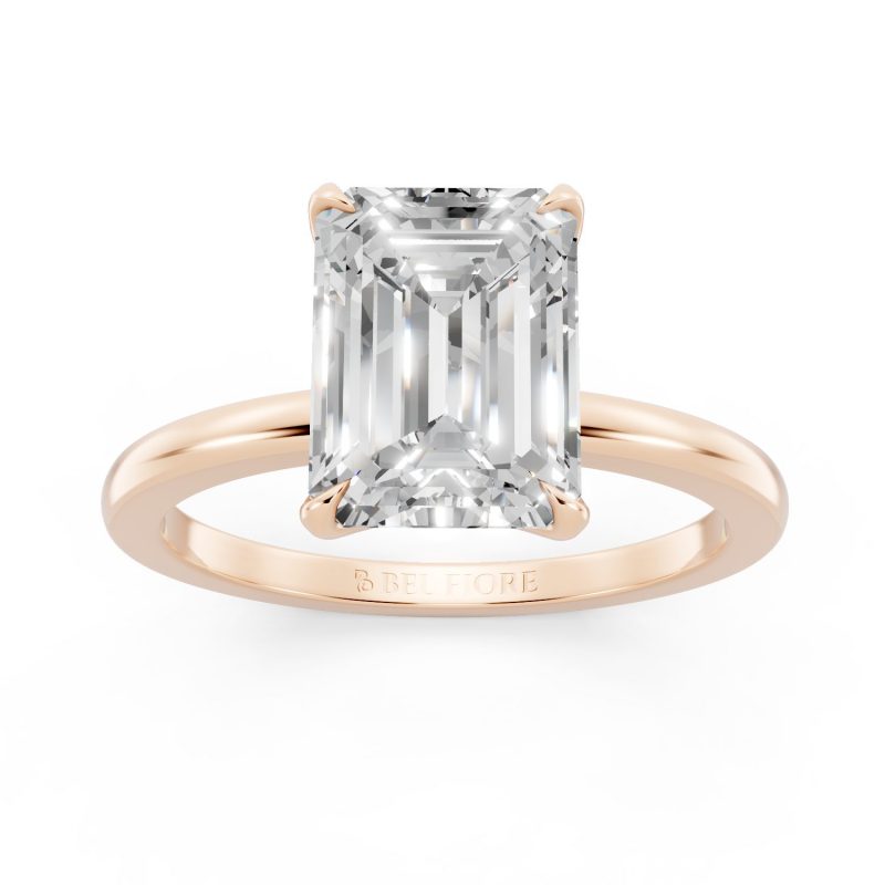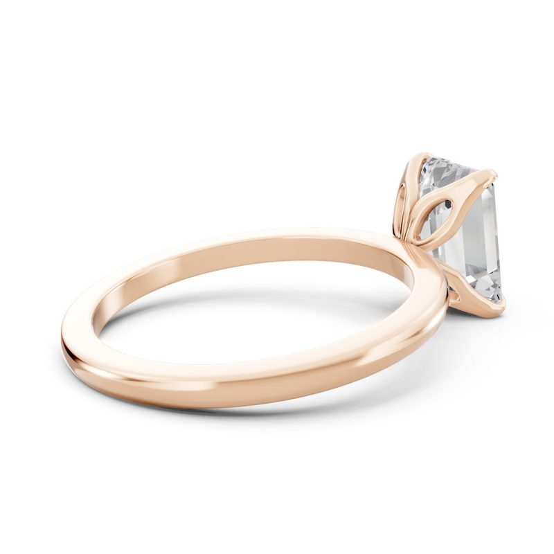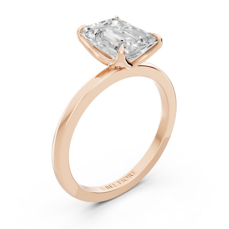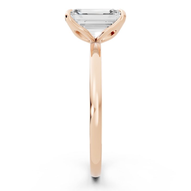 This radiant solitaire ring features an emerald-cut clear gemstone, beautifully framed in a soft rose gold setting. The elongated facets of the stone create a hall-of-mirrors effect, enhancing its brilliance and elegance. A perfect harmony of modern geometry and romantic warmth.