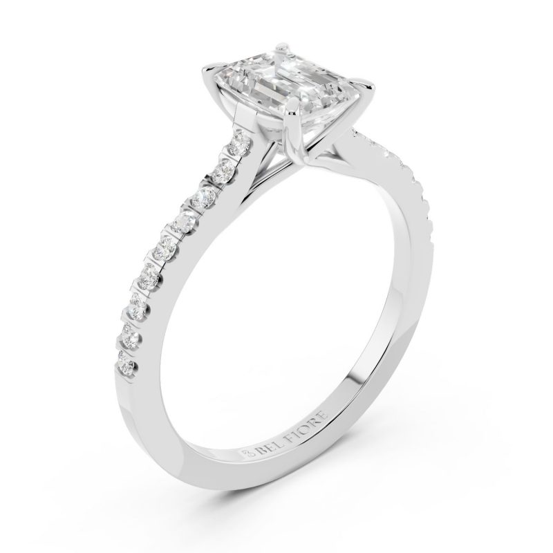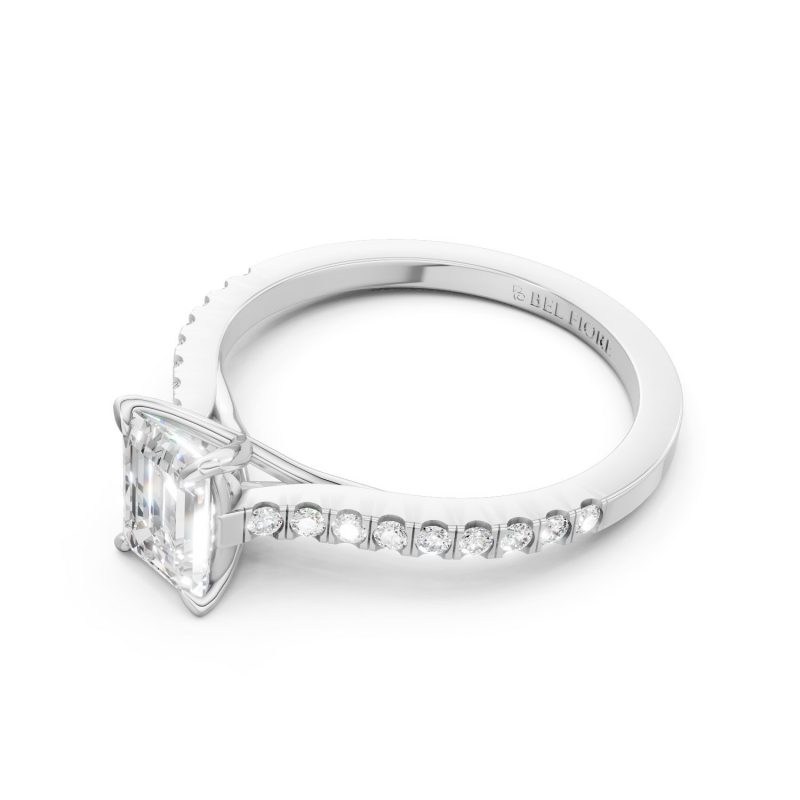 A symbol of pure sophistication, this Bel Fiore ring features a striking emerald-cut colorless diamond, expertly set in luminous 18K white gold. Known for its elegant hall-of-mirrors effect, the step-cut center stone is enhanced by a band of pavé-set round diamonds that shimmer with understated grace.