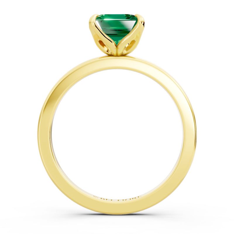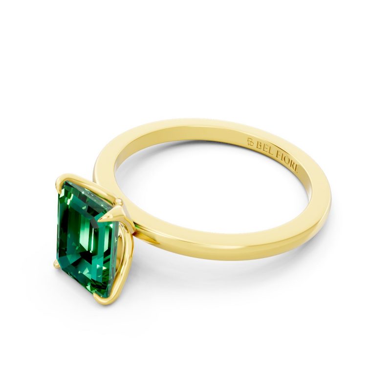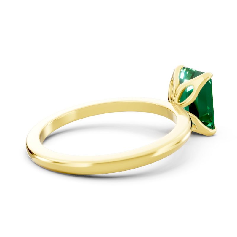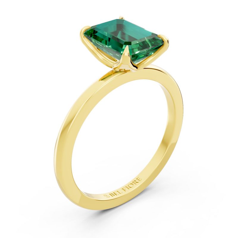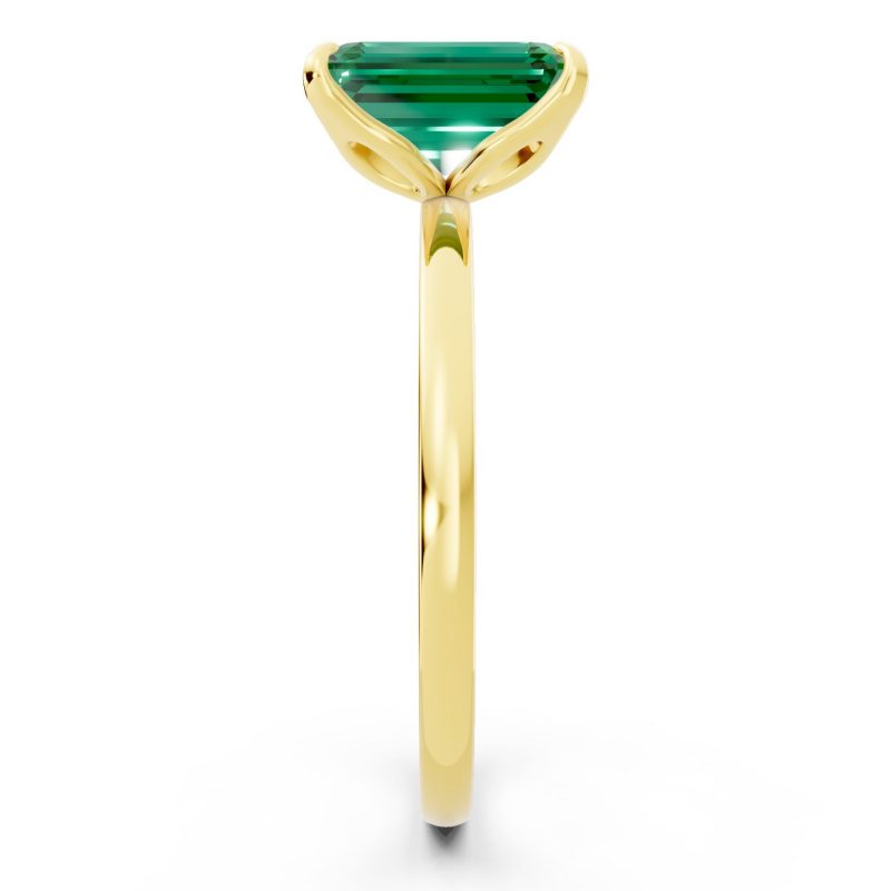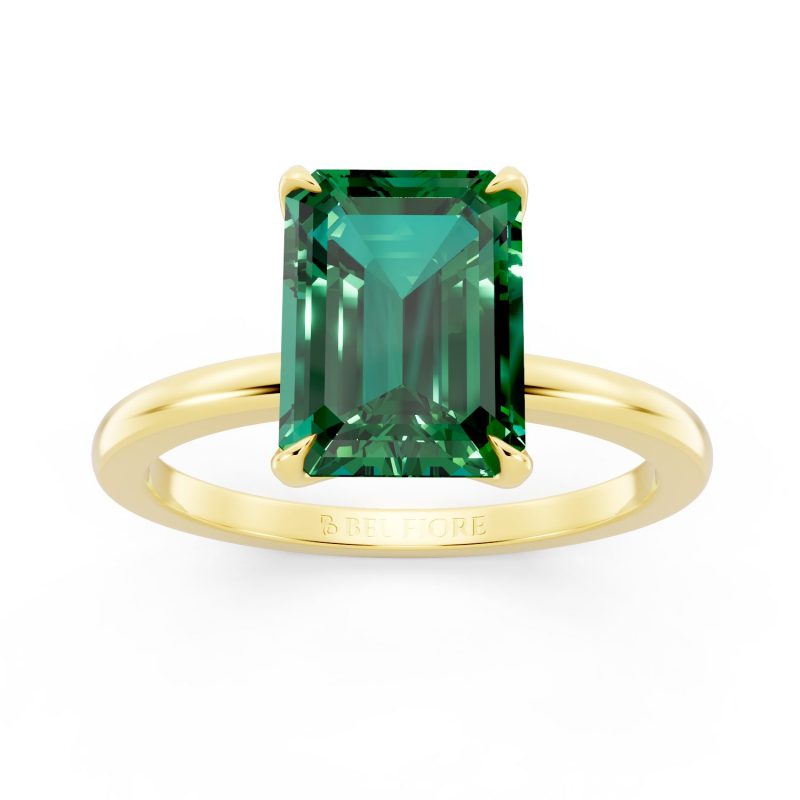 A mesmerizing emerald-cut green gemstone sits proudly atop a radiant yellow gold band in this striking solitaire ring. The crisp lines of the cut highlight the stone’s natural depth and vibrance, while the warm golden setting adds a classic touch of luxury. A bold and graceful piece for those with refined taste.