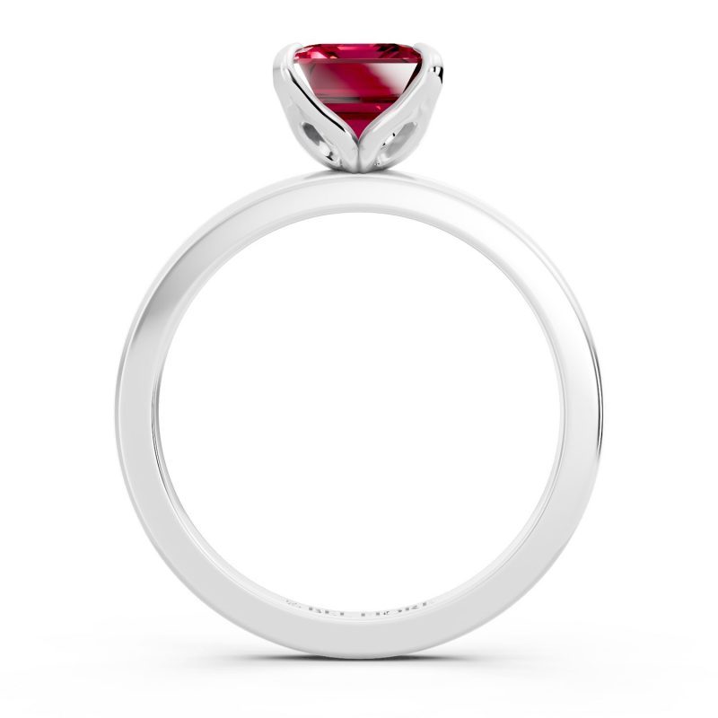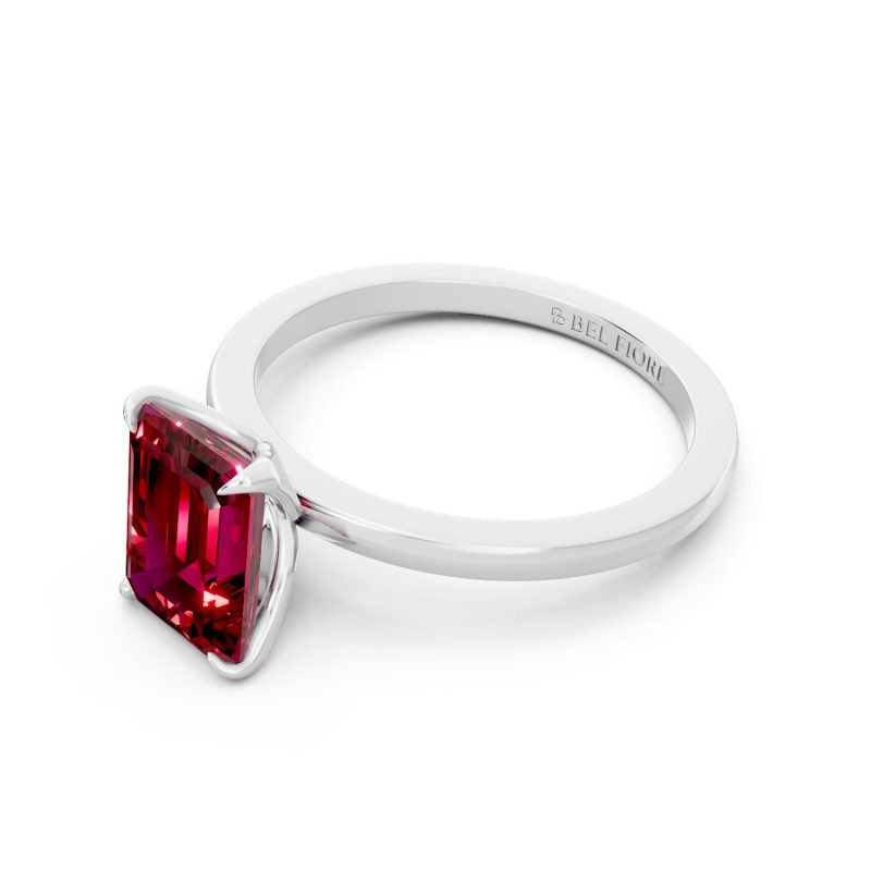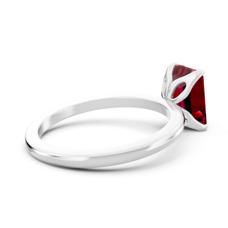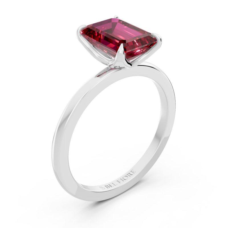 This bold emerald-cut red gemstone radiates intensity and grace, set in a polished white gold band that enhances its vivid brilliance. The clean, elongated facets of the stone reflect fiery depth, while the sleek metal setting adds a crisp, contemporary contrast. A refined and powerful statement piece.