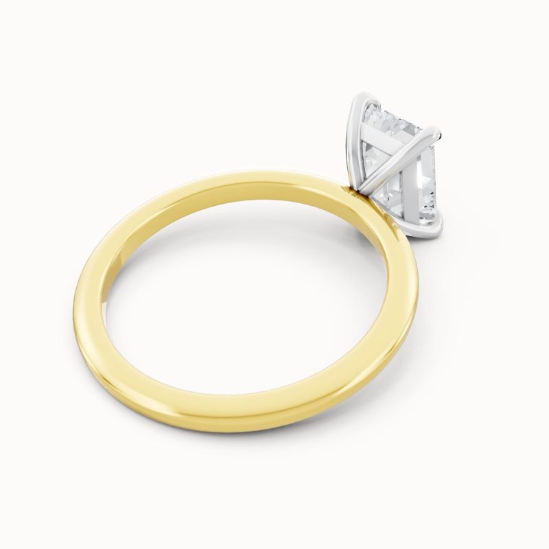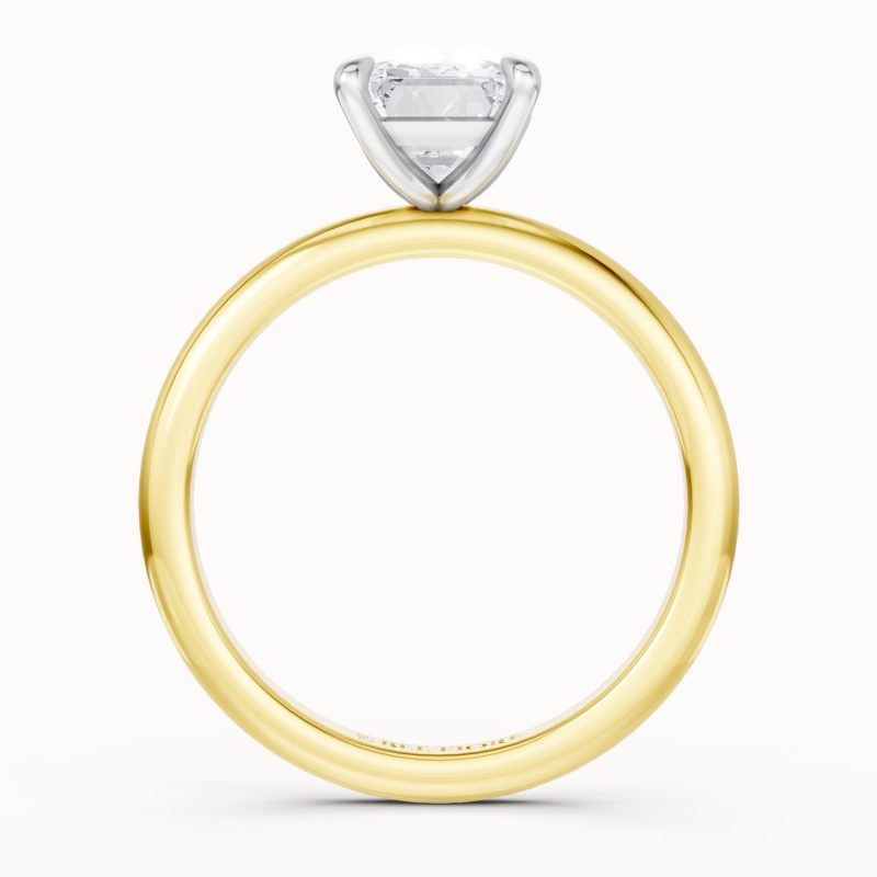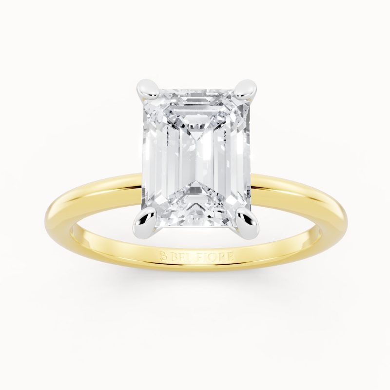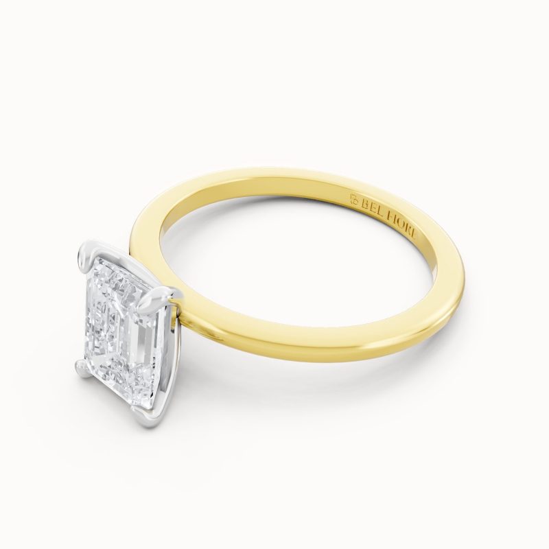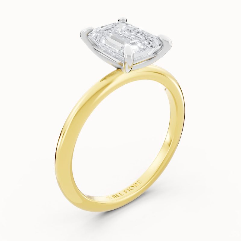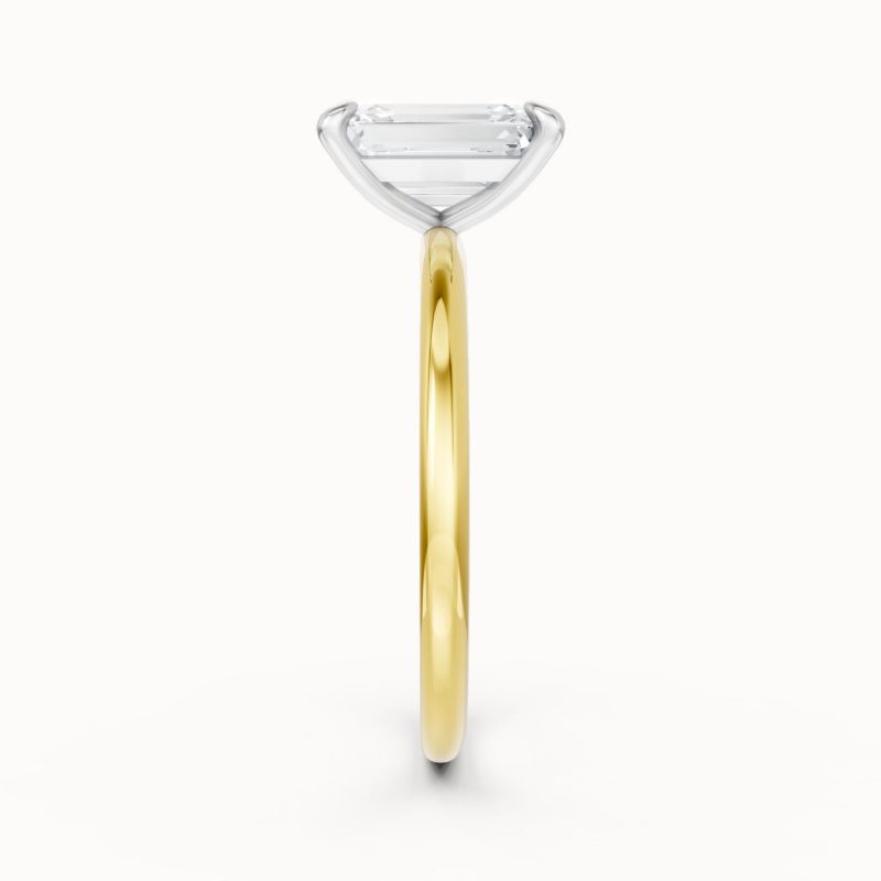 Designed with a white gold head atop a warm band, this variation draws the eye to the emerald-cut diamond with extra brilliance. The subtle contrast between tones adds depth and a unique character to the ring.