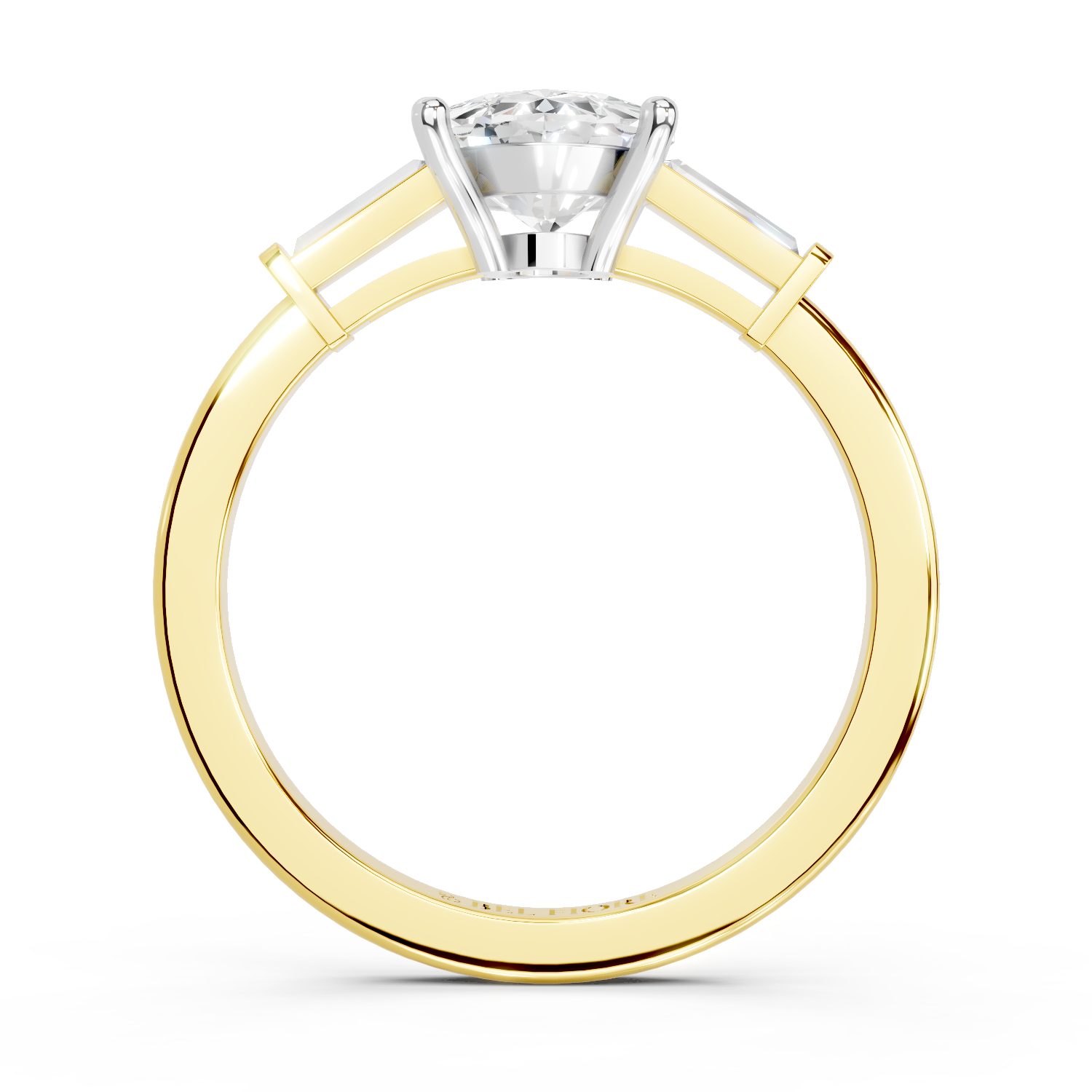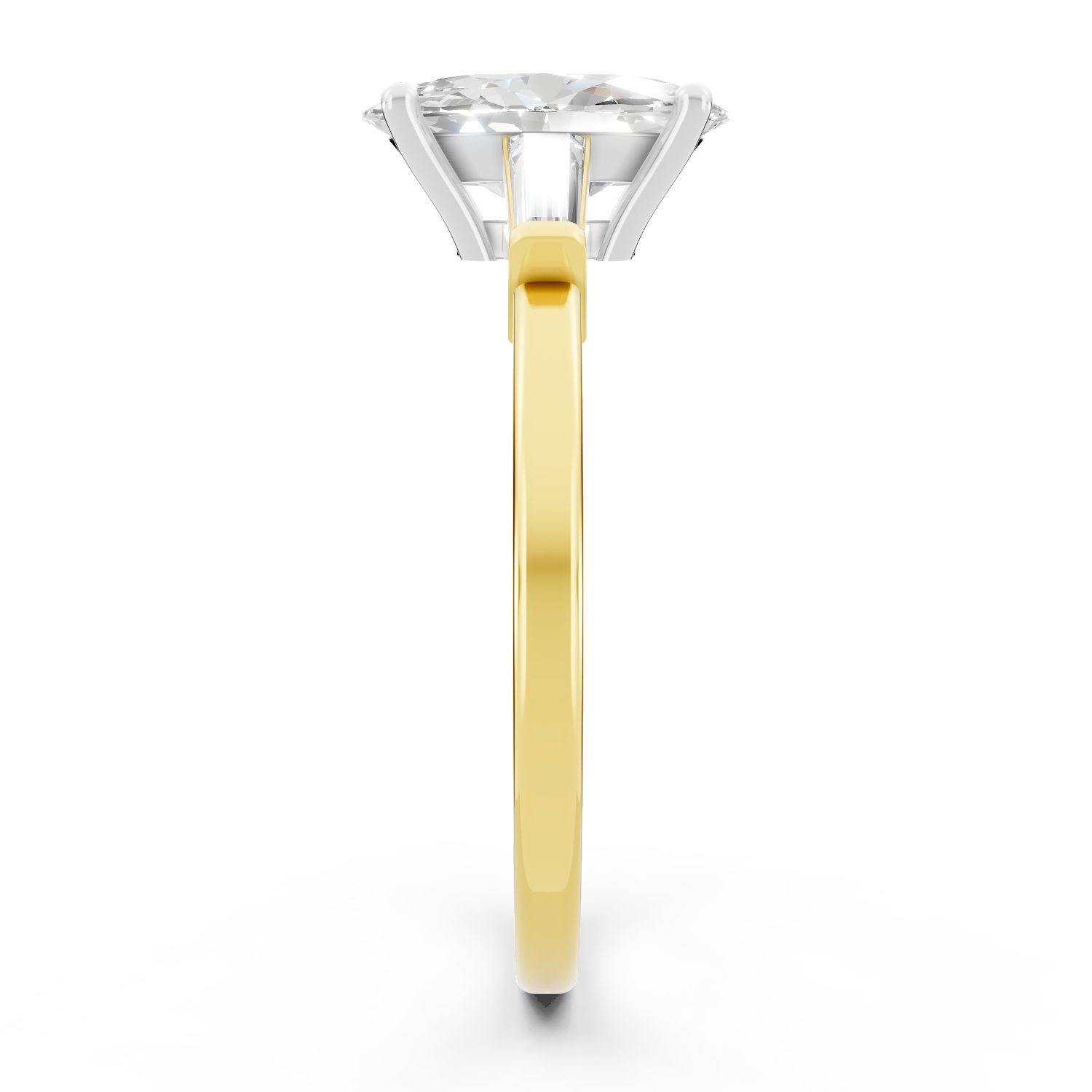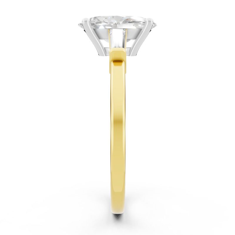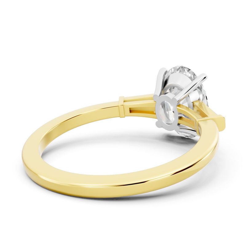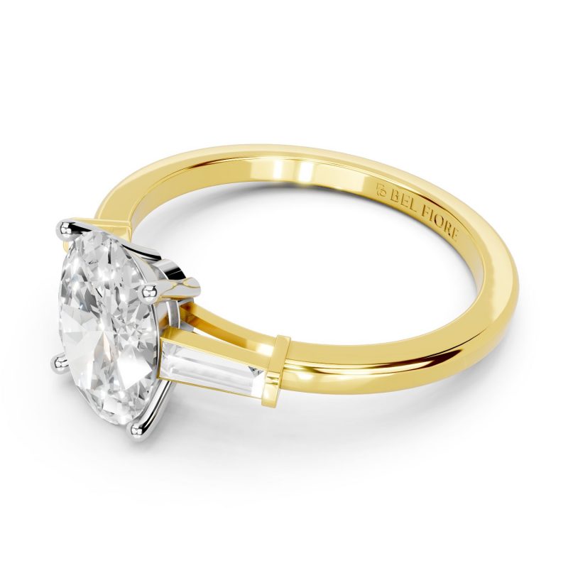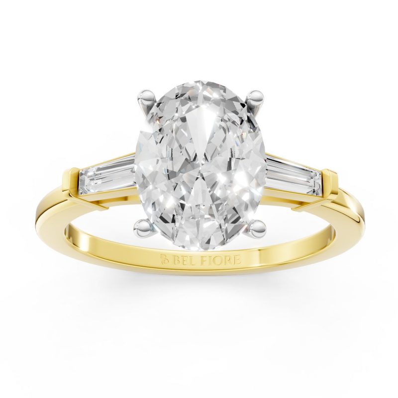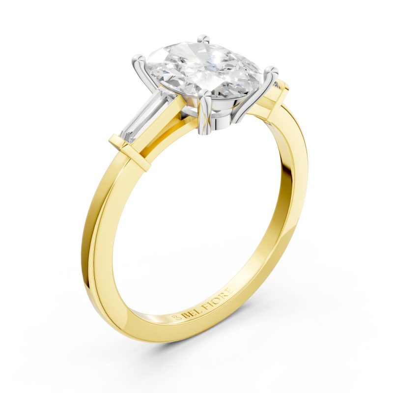 This stunning Bel Fiore creation brings together the richness of yellow gold with the crisp elegance of a white gold head. At its heart is a breathtaking oval-cut center stone, delicately secured by white gold prongs to amplify brilliance and clarity. Flanked by tapered baguette-cut diamonds, the design radiates vintage elegance with a contemporary twist.