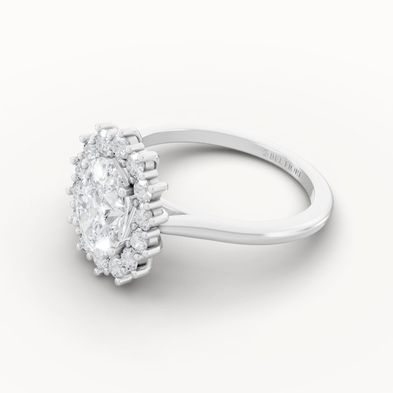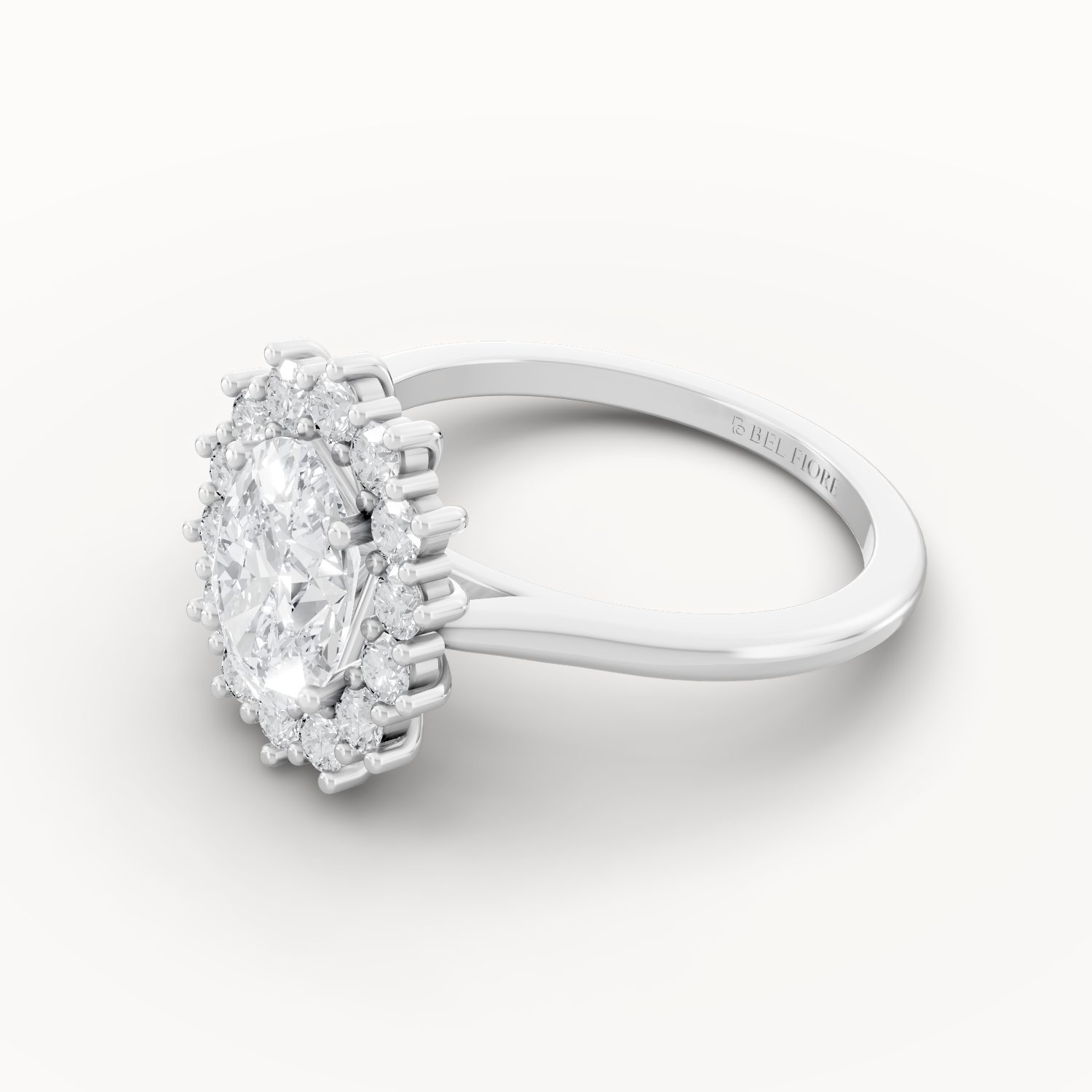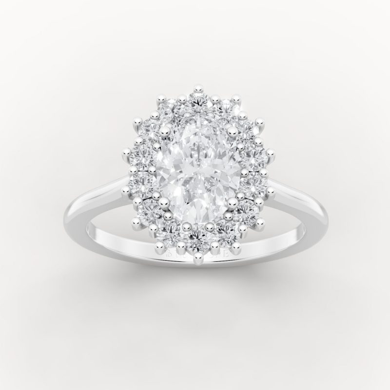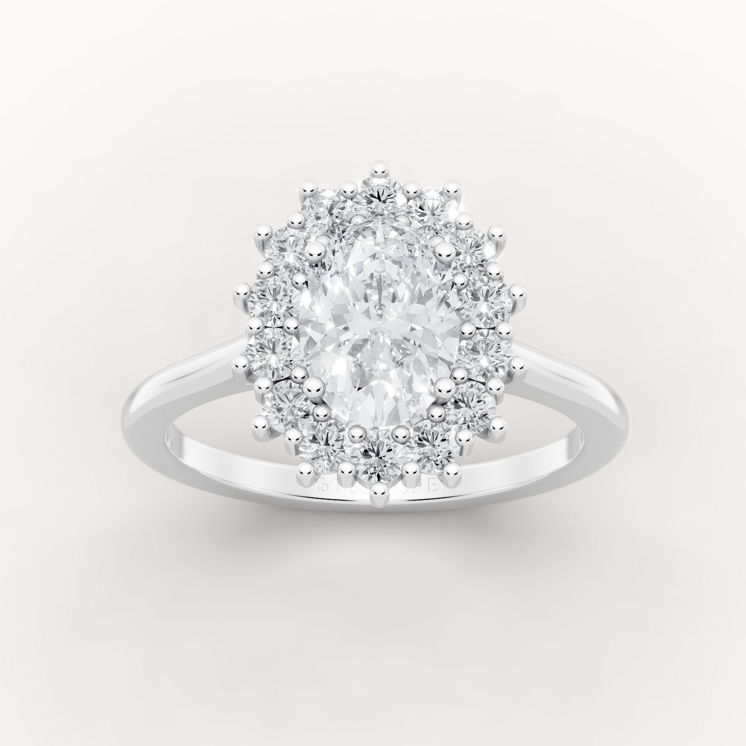 Set in luminous white gold, this oval halo ring showcases a central oval diamond, embraced by a halo of glittering pavé diamonds. Its refined design highlights the brilliance of the stones, making it a timeless piece of elegance for every occasion.