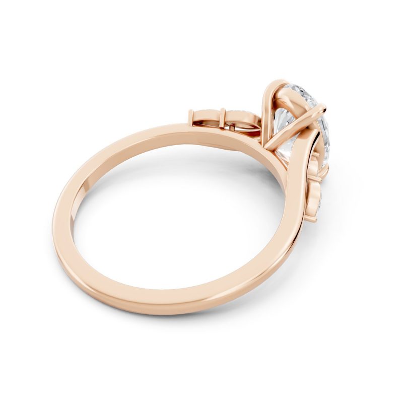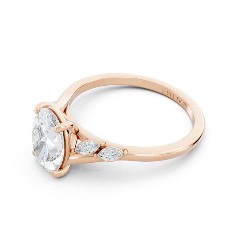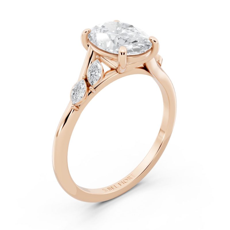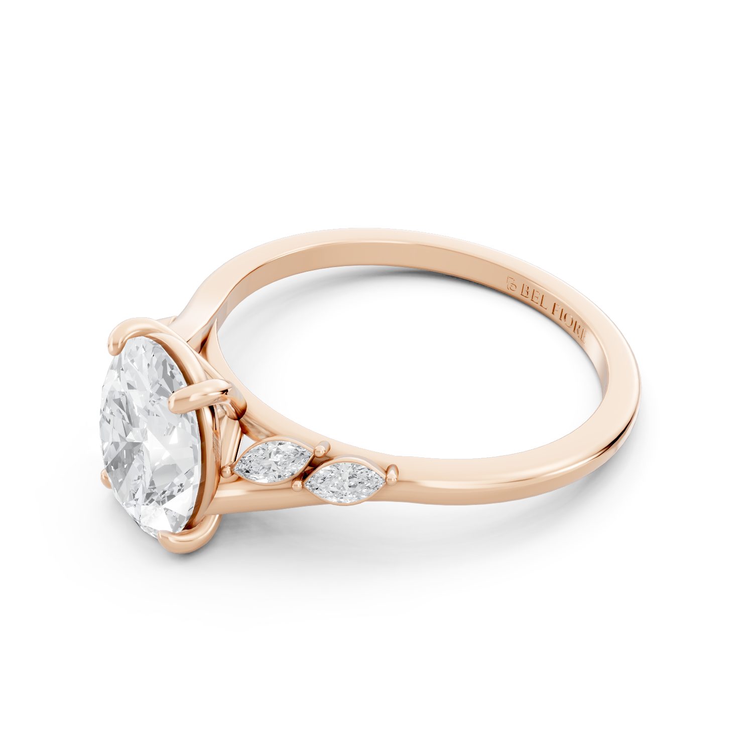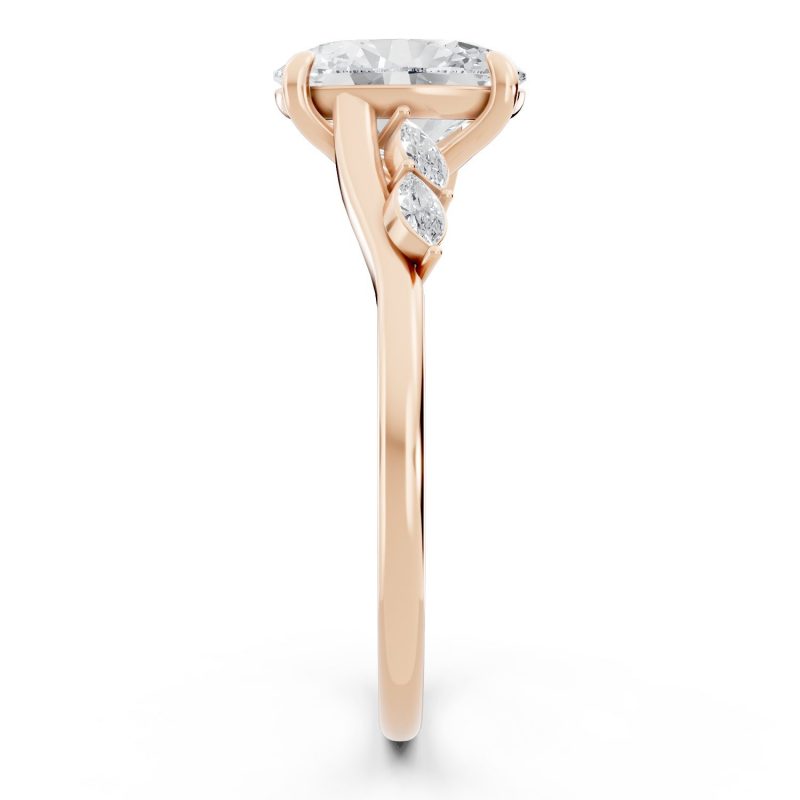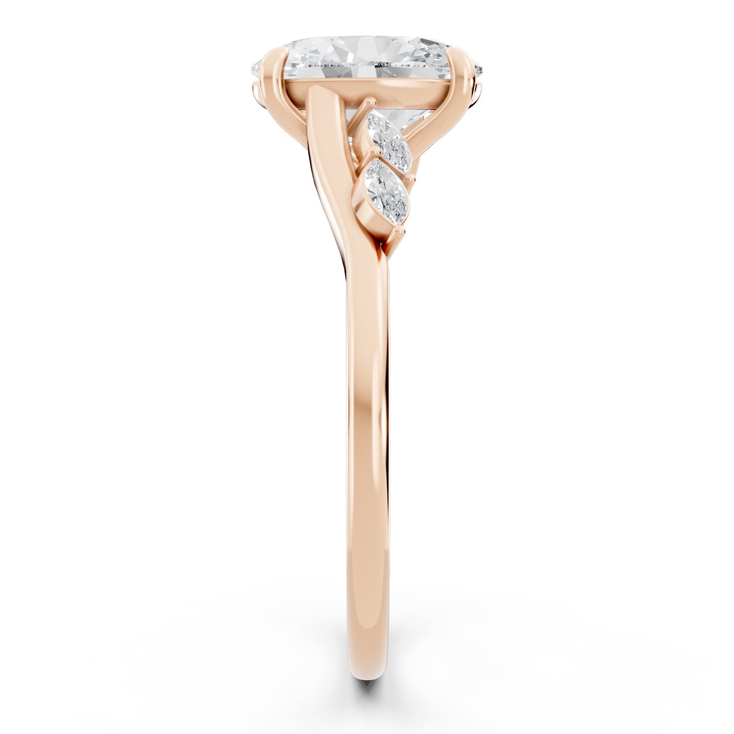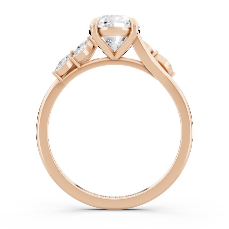 Crafted in glowing rose gold, this elegant ring showcases an oval-cut center diamond embraced by a graceful trio of side stones on each side. The soft blush of the metal enhances the brilliance of the diamonds, creating a design that is both timeless and tender.
