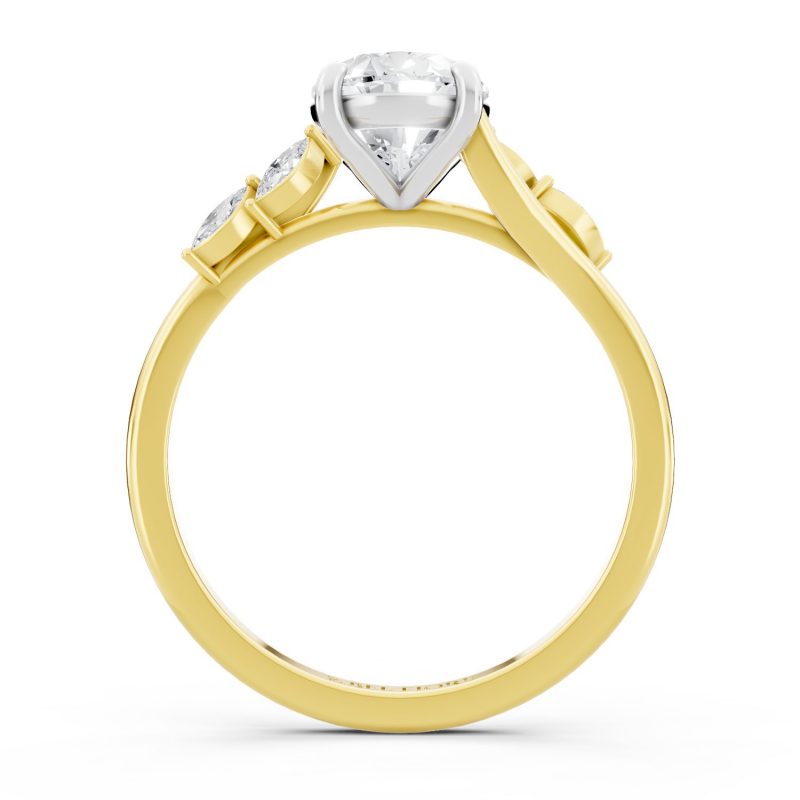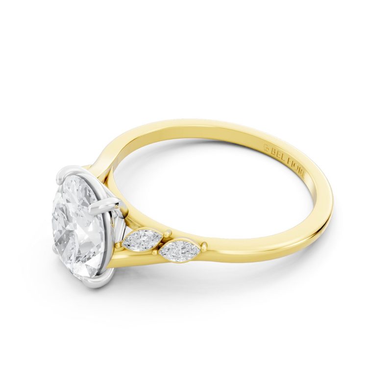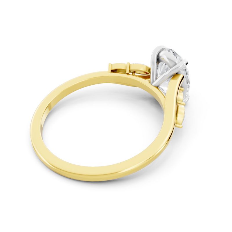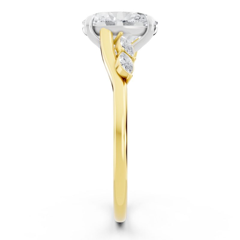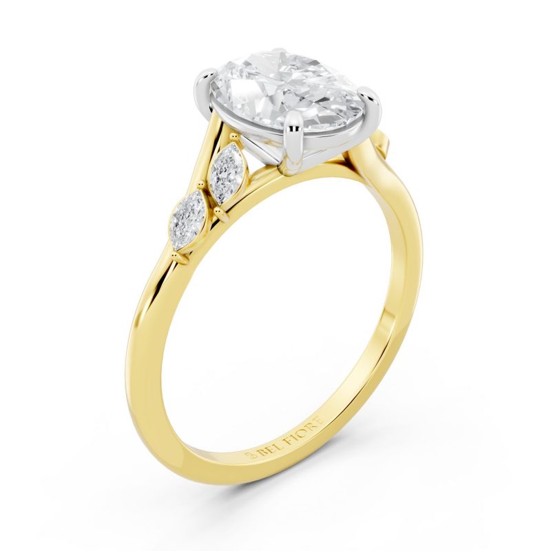 This sophisticated engagement ring blends the classic warmth of yellow gold with the striking brilliance of a white gold head. At the center, a dazzling oval-cut diamond is beautifully framed by a trio of sparkling side stones on either side. The two-tone design enhances the brilliance of the diamonds, offering a refined and elegant statement of love.