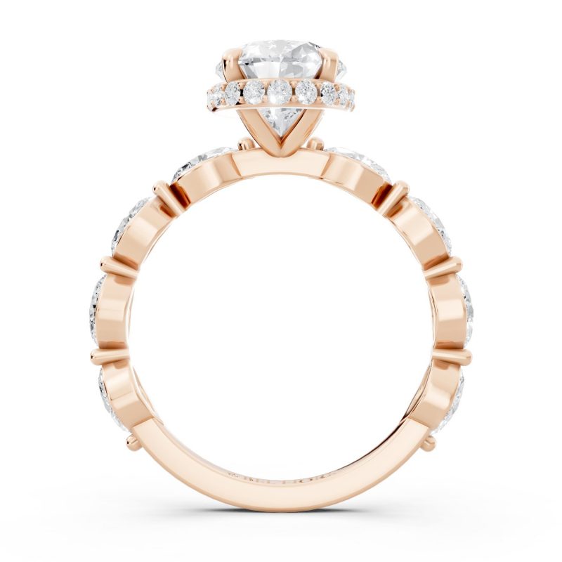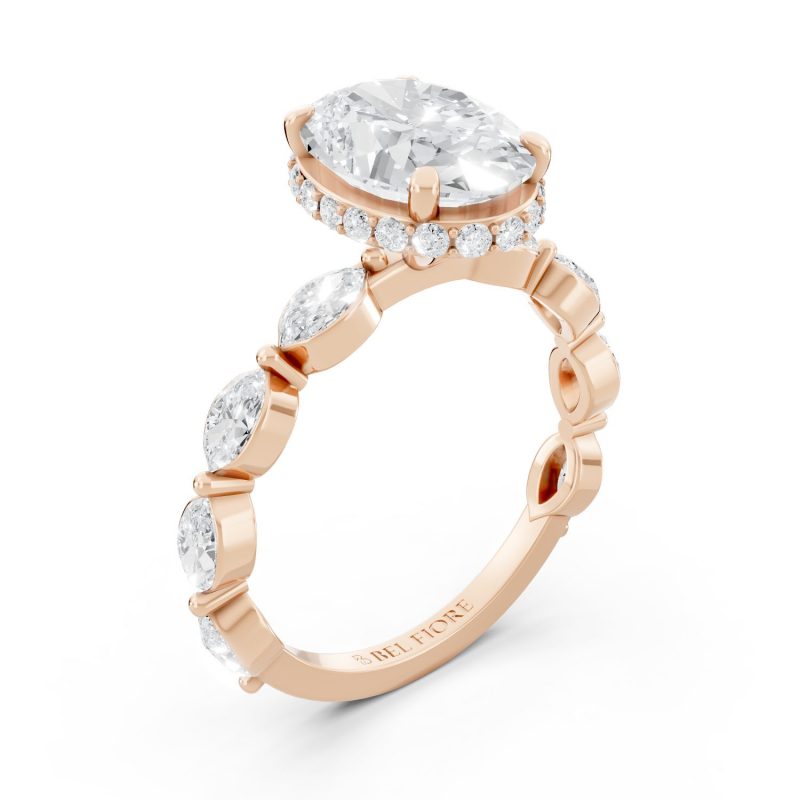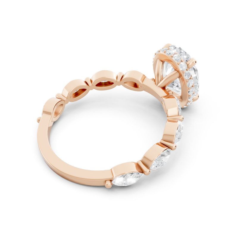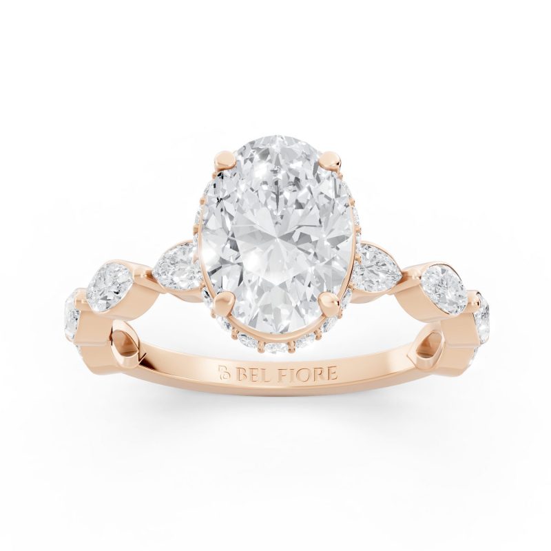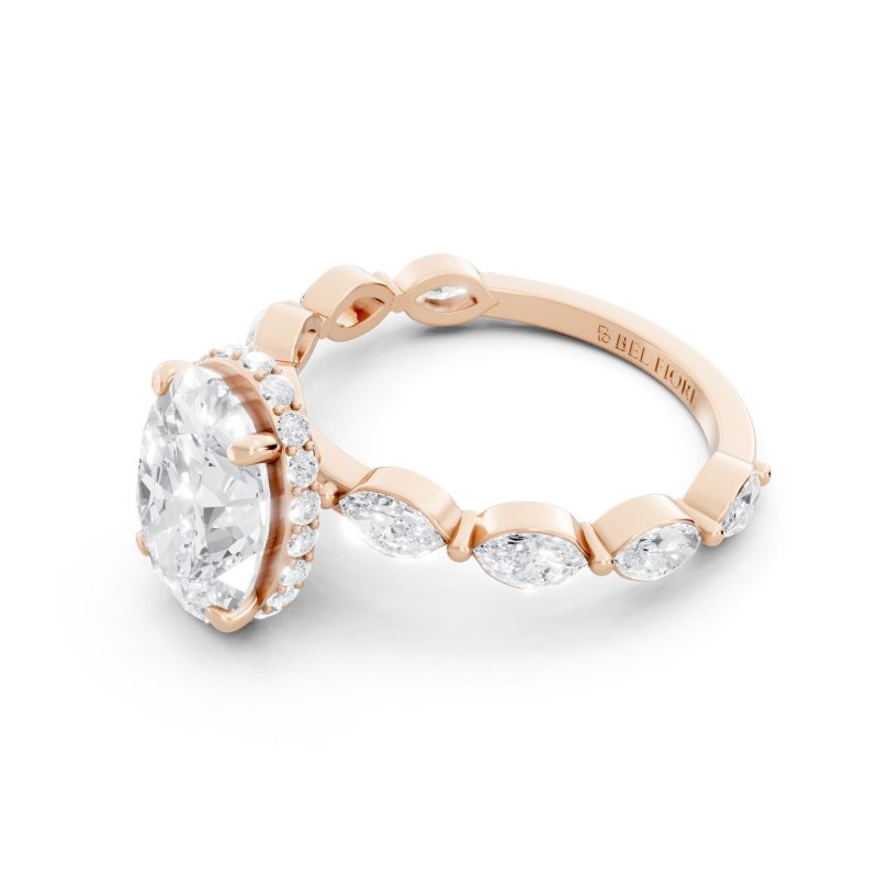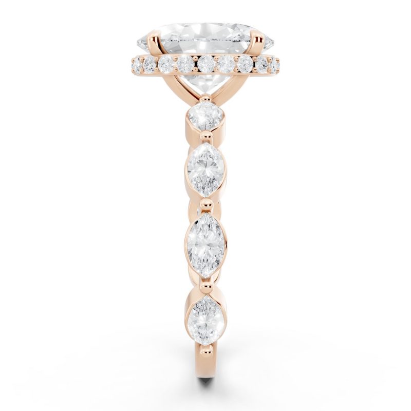 Crafted in warm rose gold, this enchanting ring features a captivating oval-cut diamond embraced by a halo of brilliance from alternating marquise and round side stones. The soft blush tones of the rose gold enhance the diamond’s radiance, creating a romantic and timeless piece perfect for marking life’s most cherished moments.