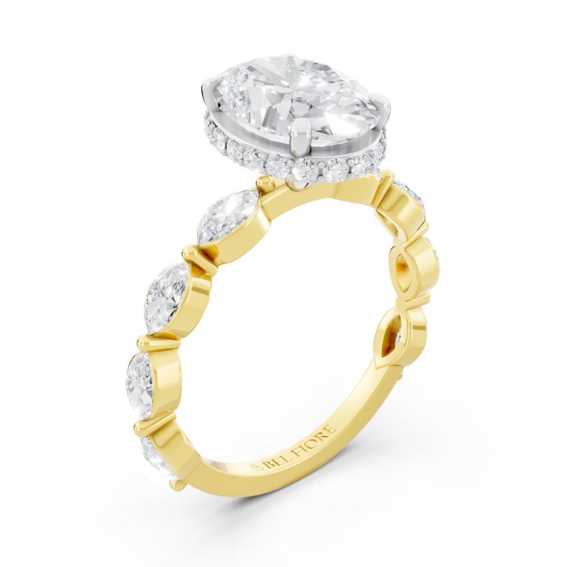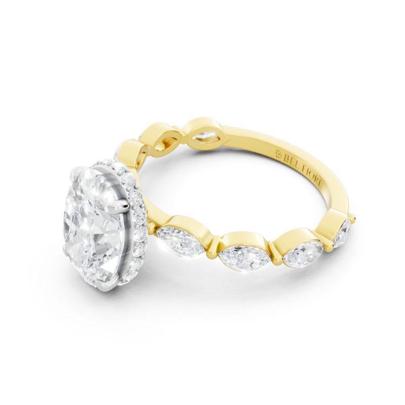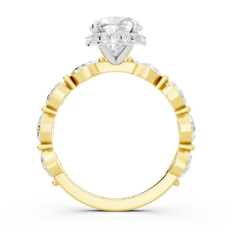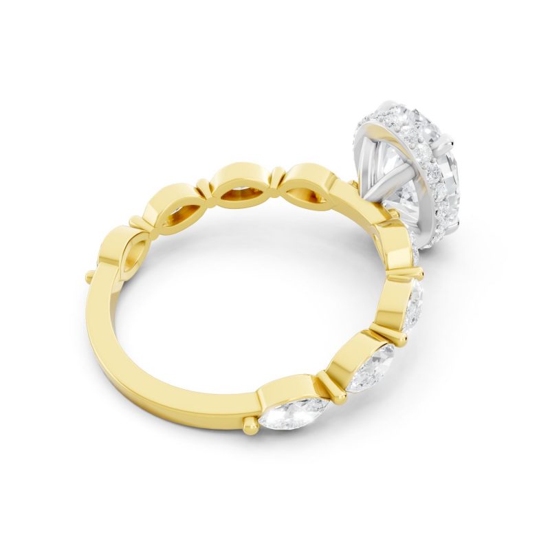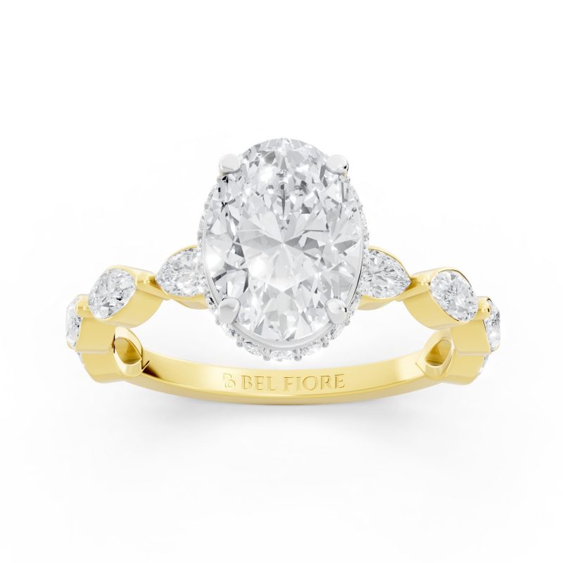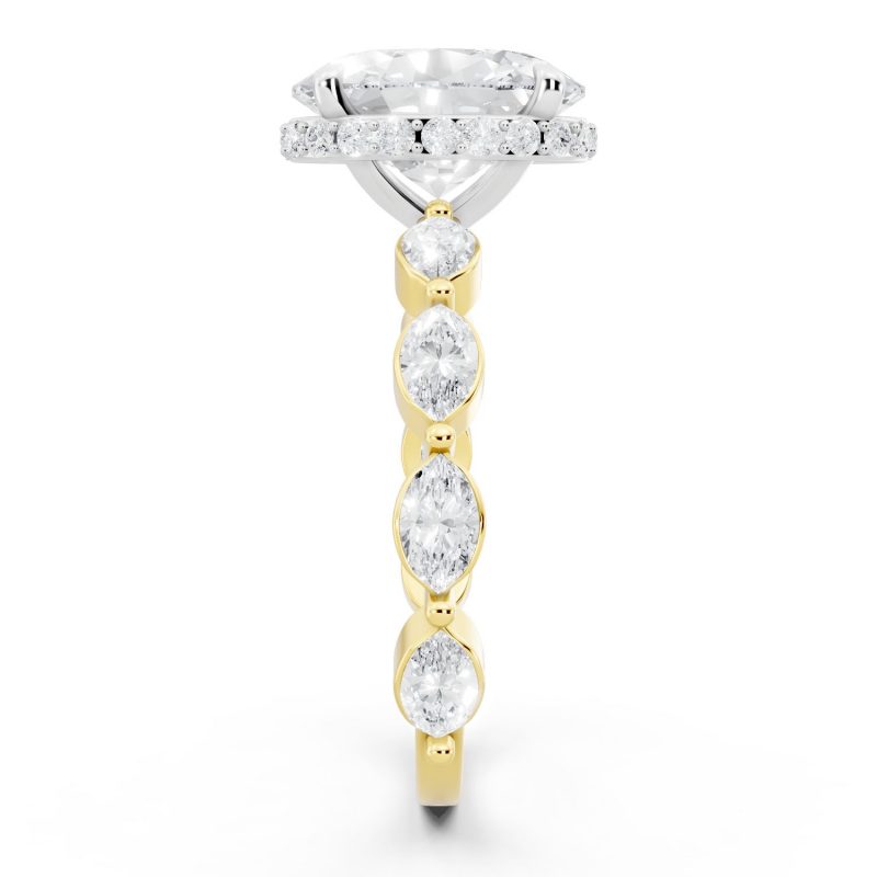 Featuring a radiant oval-cut diamond, this design pairs a gleaming white gold head with your choice of rose gold or yellow gold band. The crisp white gold prongs enhance the diamond’s fire and brilliance, while the contrasting band color adds depth and visual interest. Accented with alternating marquise and round side stones, this ring offers a harmonious balance of classic elegance and modern design.