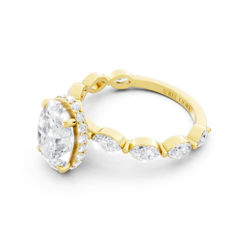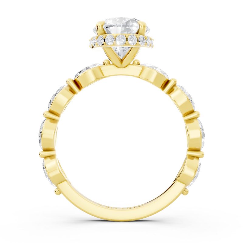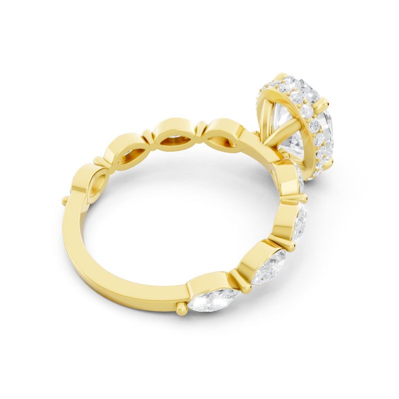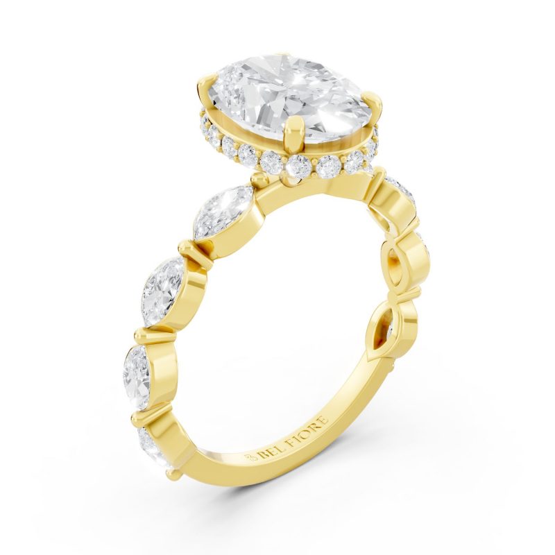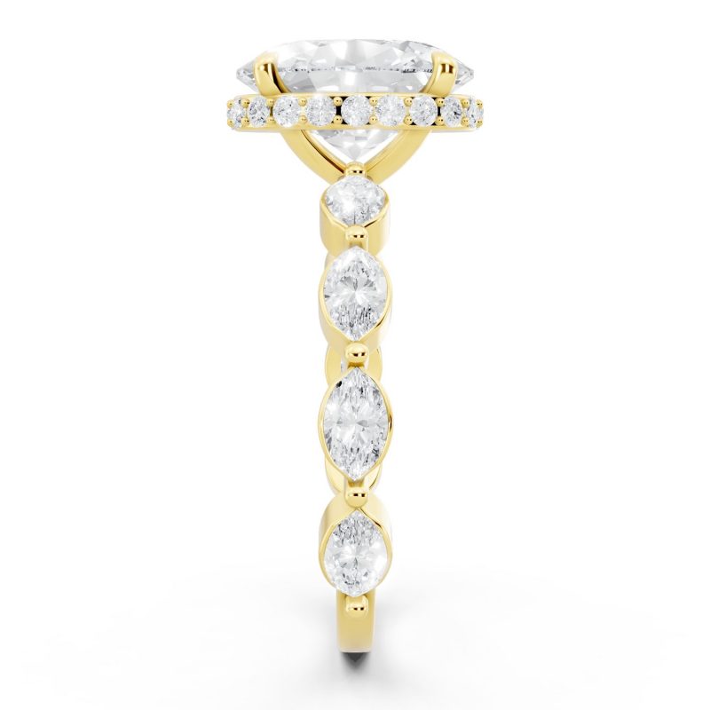 Radiating warmth, this yellow gold ring highlights a breathtaking oval-cut diamond flanked by alternating marquise and round side stones. The rich golden band adds a touch of vintage charm while amplifying the diamond’s brilliance, making it a timeless symbol of enduring affection.