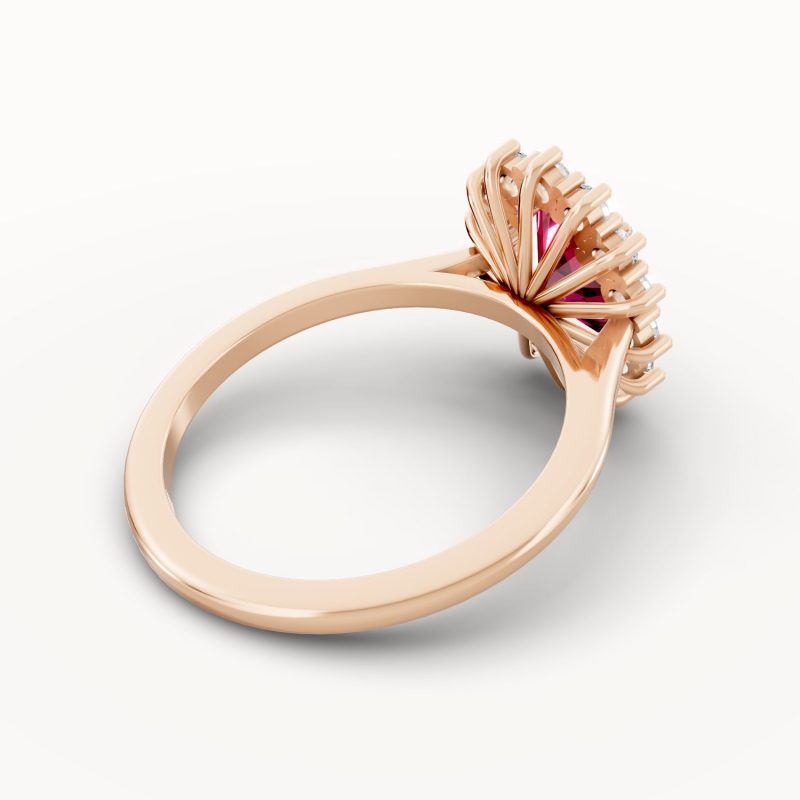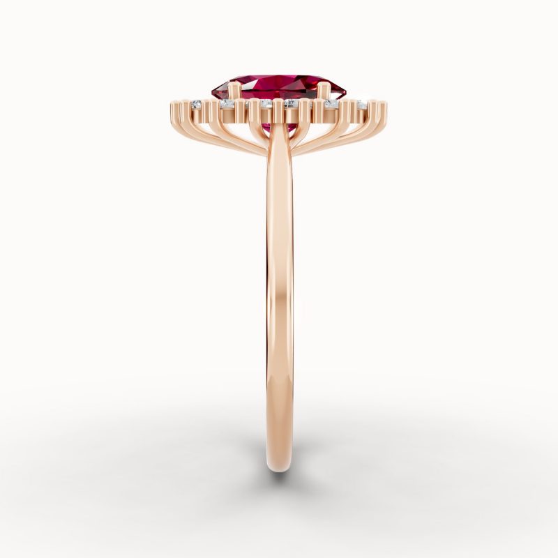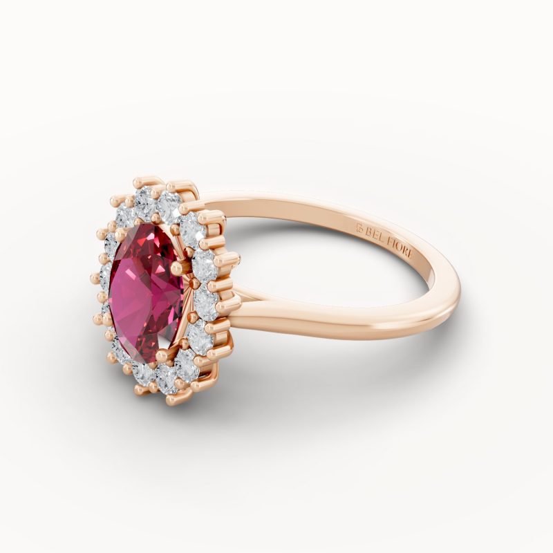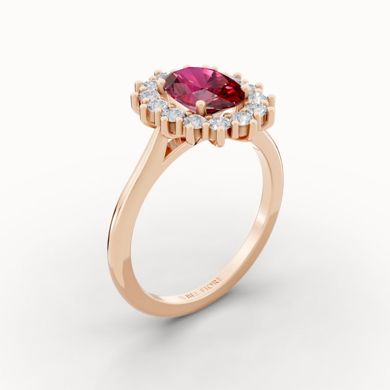 A captivating oval-cut ruby radiates passion and elegance, encircled by a sparkling halo of brilliant diamonds. The warm glow of rose gold enhances the rich red tones, creating a timeless symbol of love and sophistication.