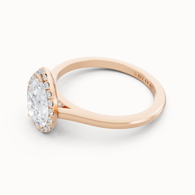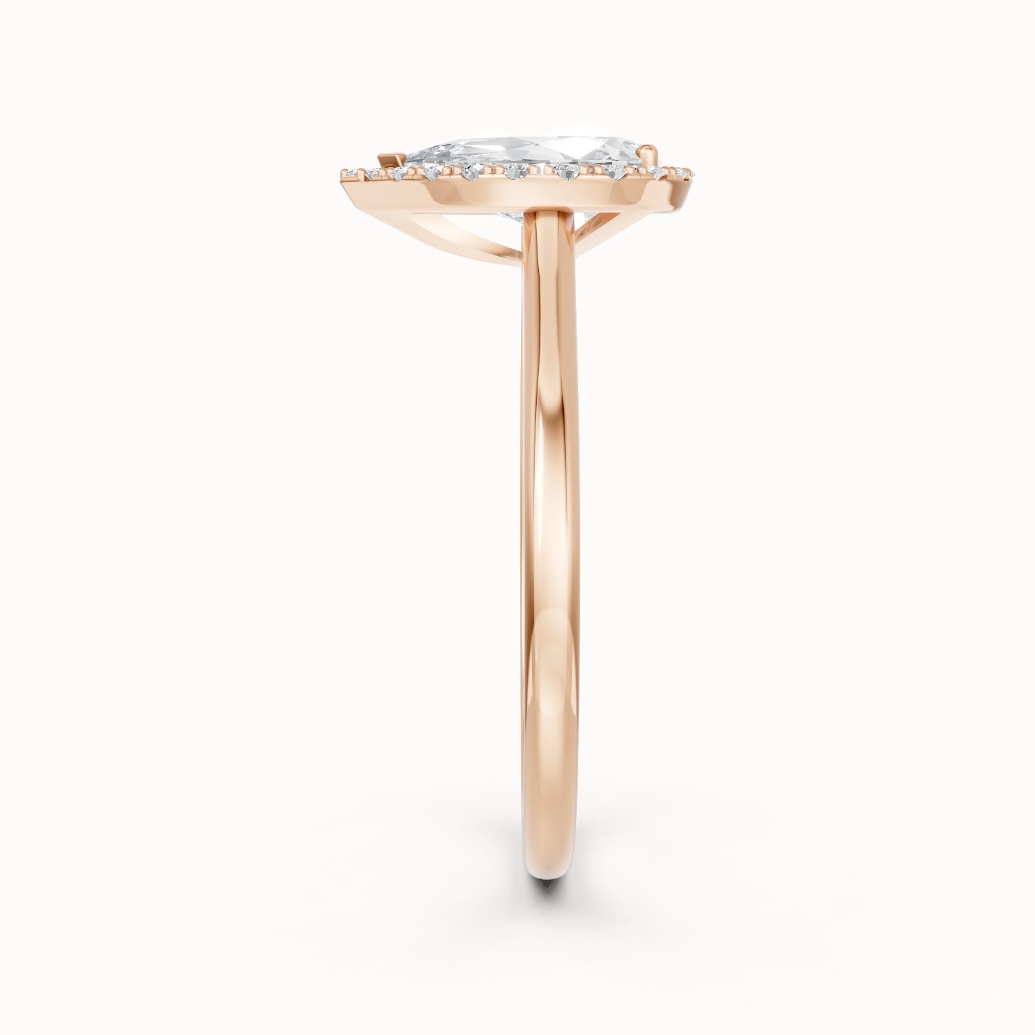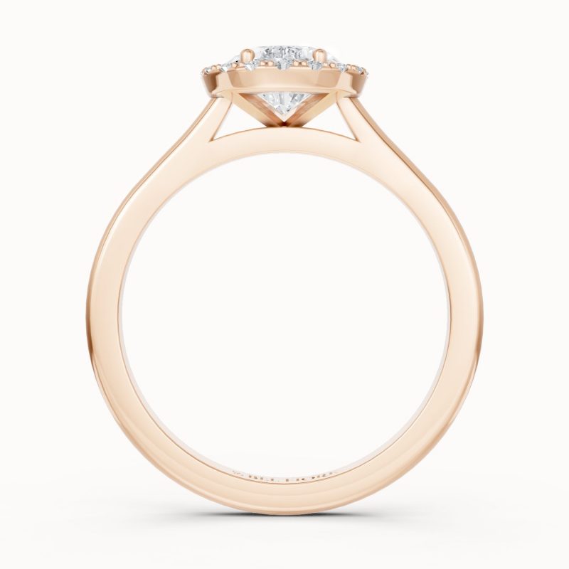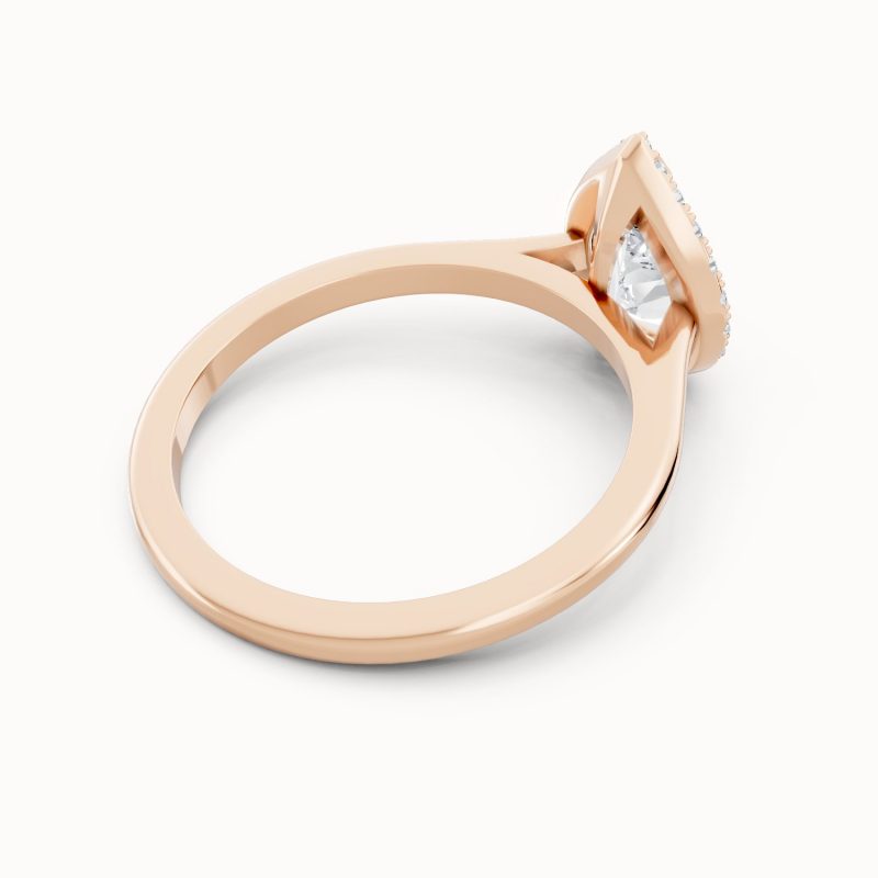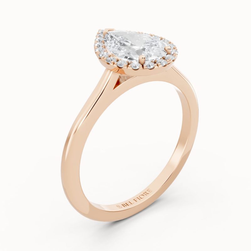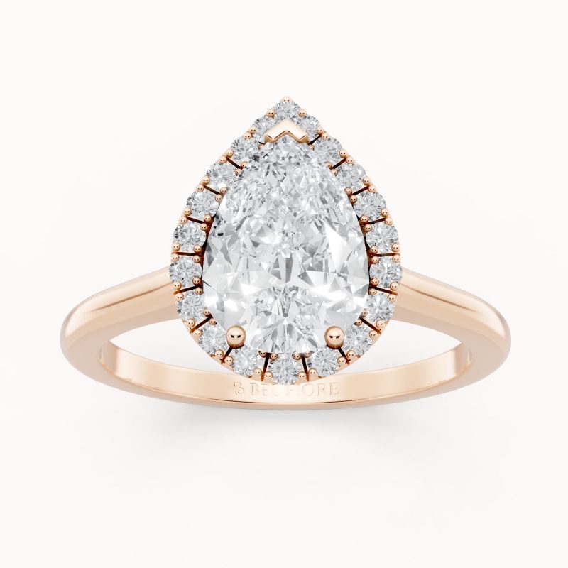 A pear-cut diamond takes center stage, embraced by a halo of shimmering pavé accents. Set on a blush-toned rose gold band, this ring radiates warmth and romance, making it a timeless symbol of love.