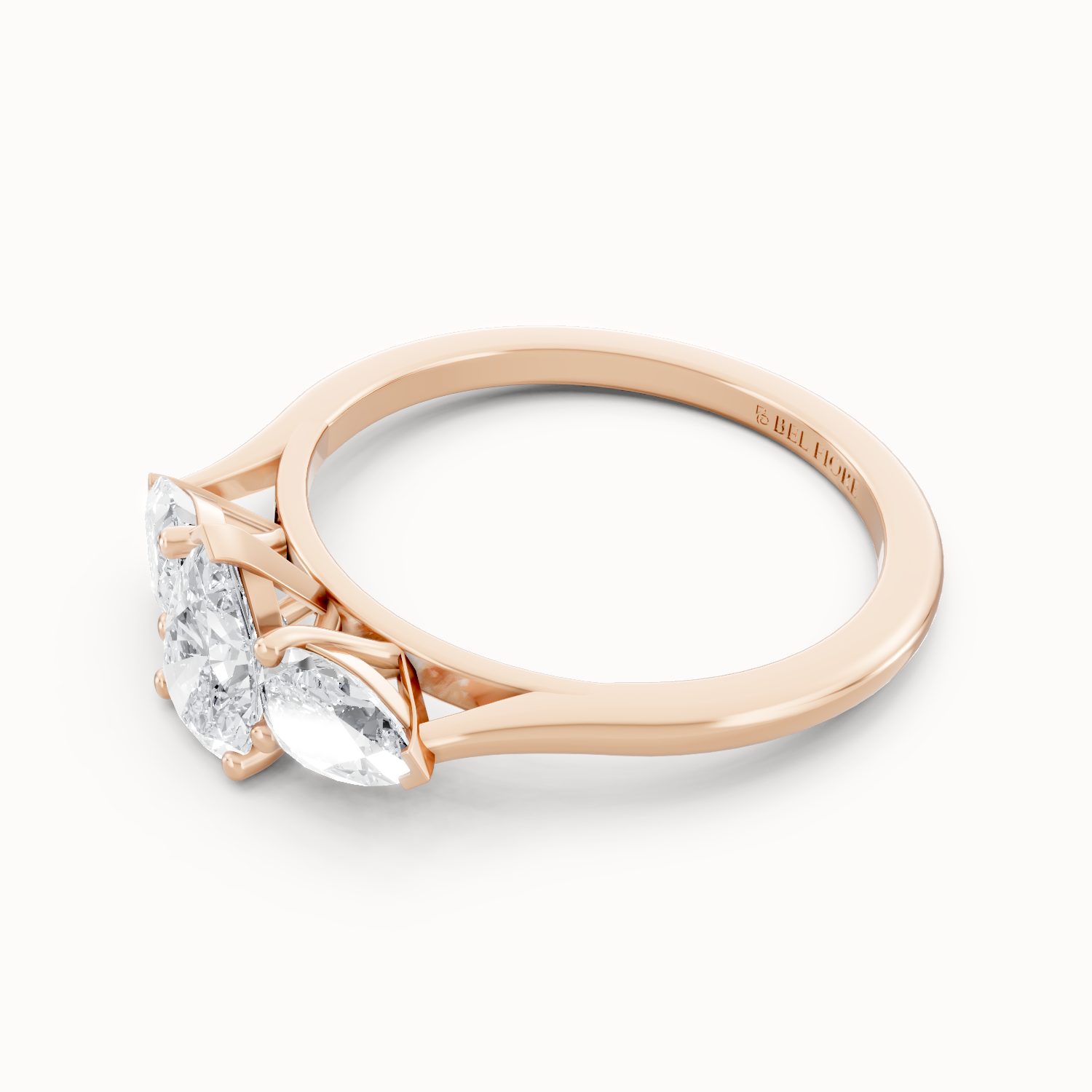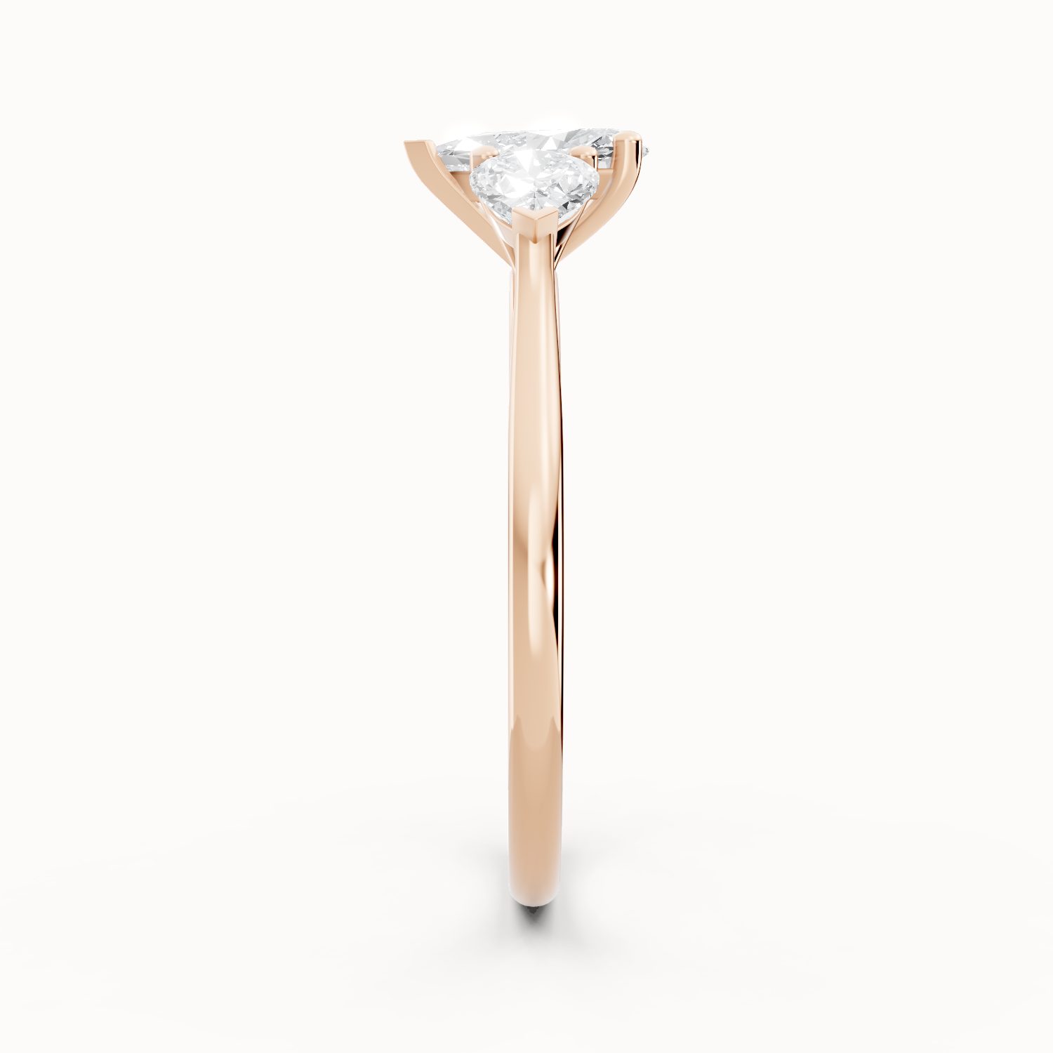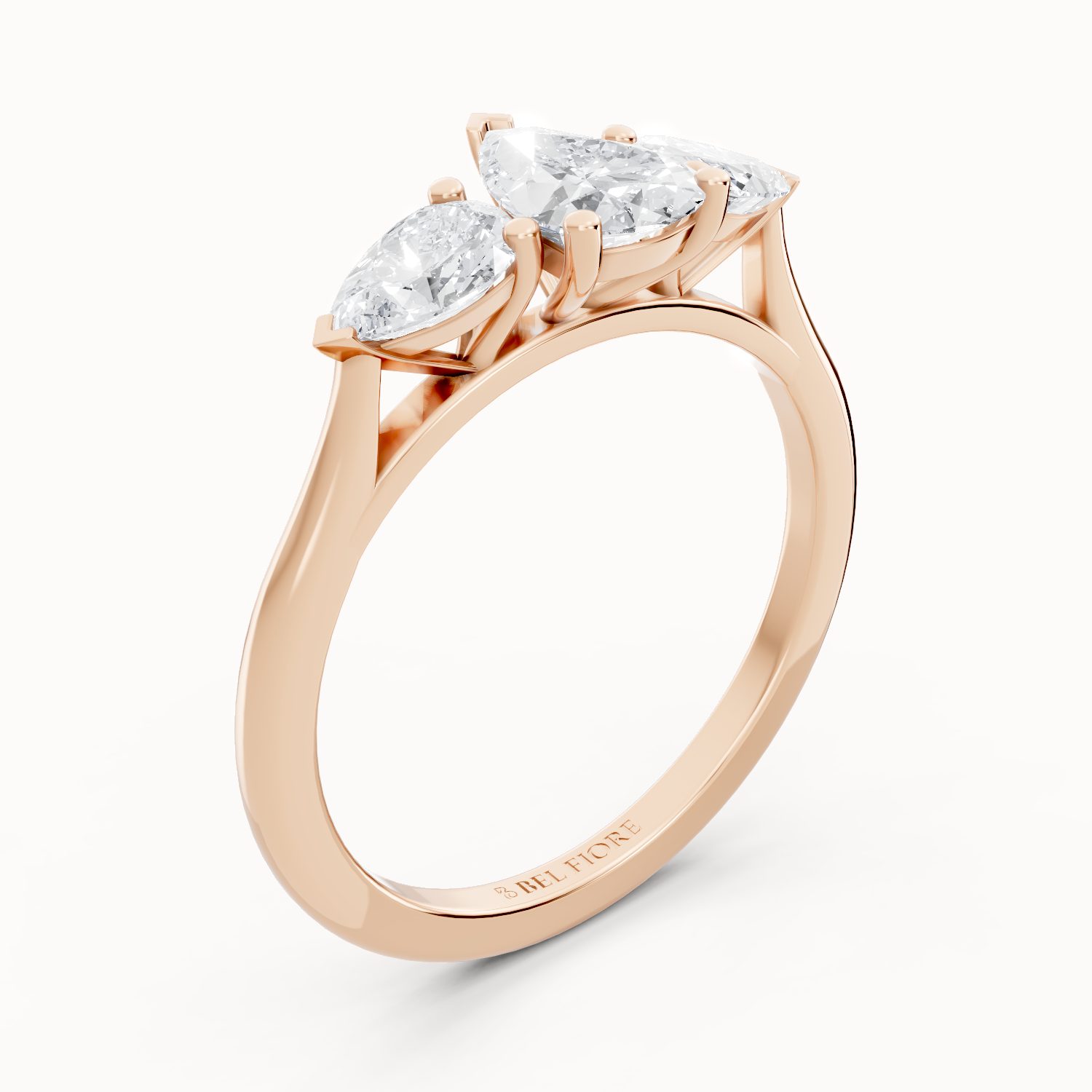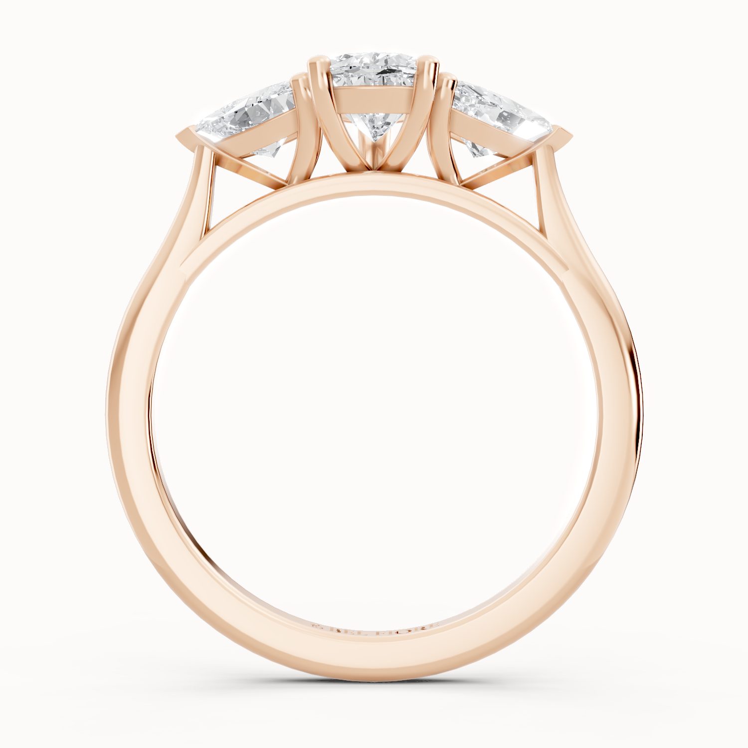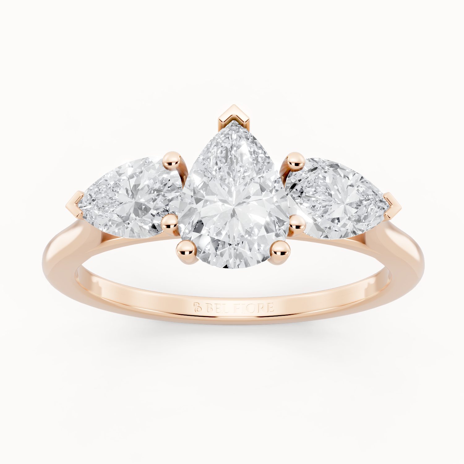 This three-stone ring in rose gold features a dazzling pear-shaped center diamond flanked by two side stones. The warm blush of rose gold enhances the brilliance of the diamonds, creating a timeless yet modern symbol of love. Perfect for brides who adore romance with a touch of sophistication.