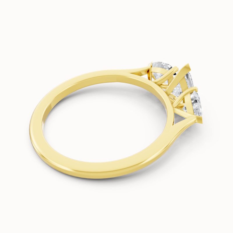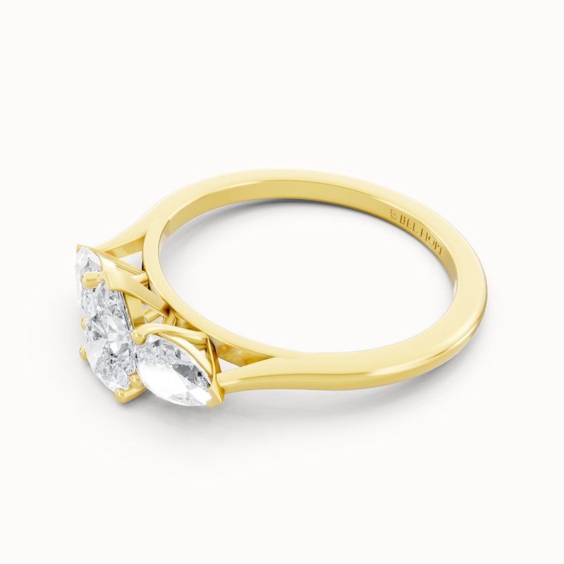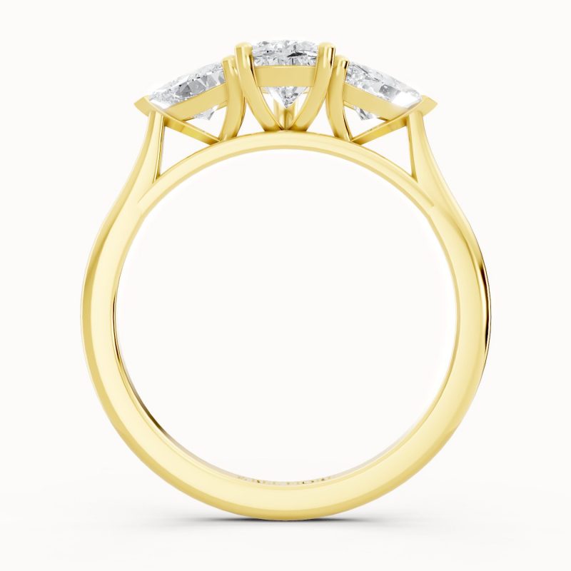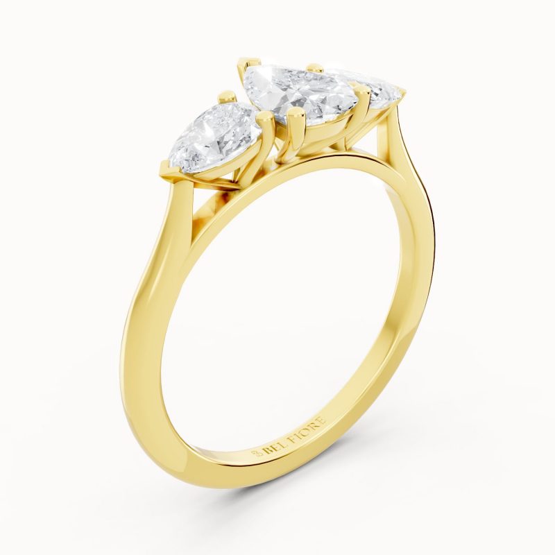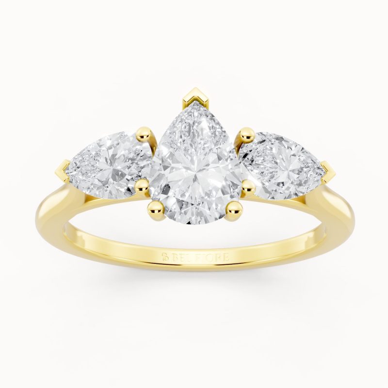 Crafted in vibrant yellow gold, this pear-shaped three-stone diamond ring exudes warmth and luxury. The glowing band perfectly contrasts the bright sparkle of the diamonds, making it an eye-catching piece that balances tradition with modern sophistication.