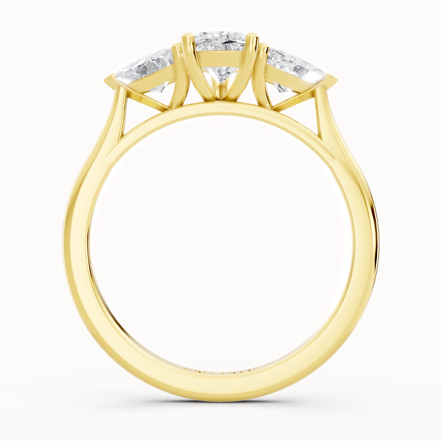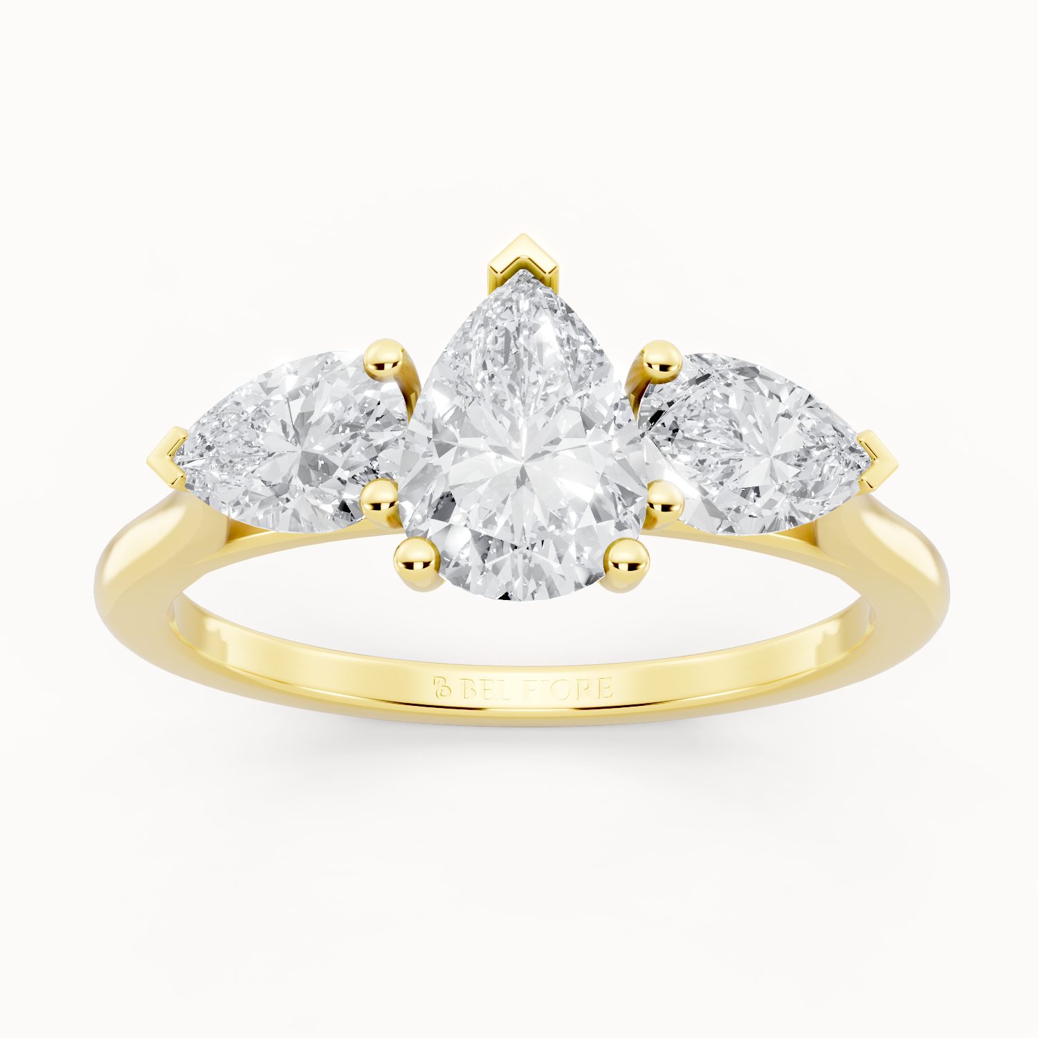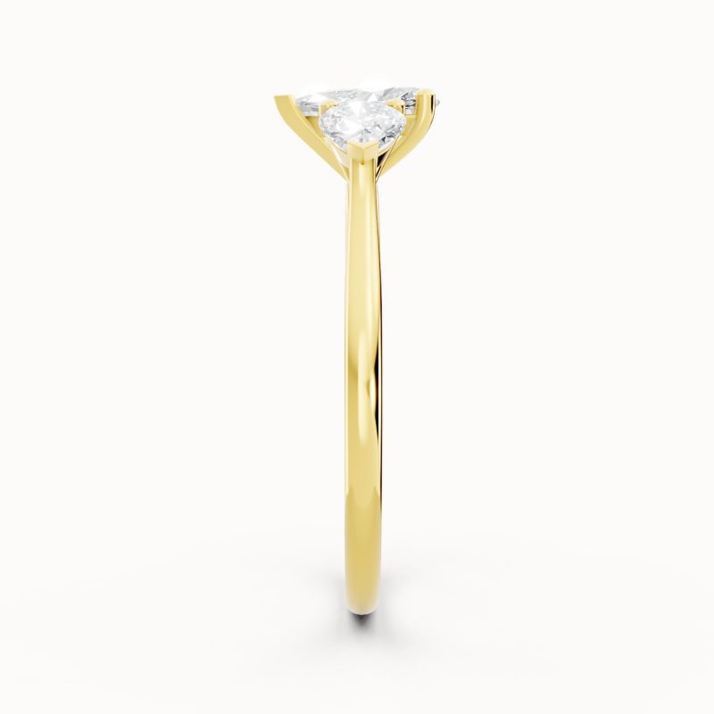 Crafted in vibrant yellow gold, this pear-shaped three-stone diamond ring exudes warmth and luxury. The glowing band perfectly contrasts the bright sparkle of the diamonds, making it an eye-catching piece that balances tradition with modern sophistication.