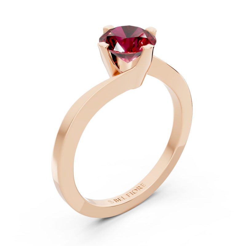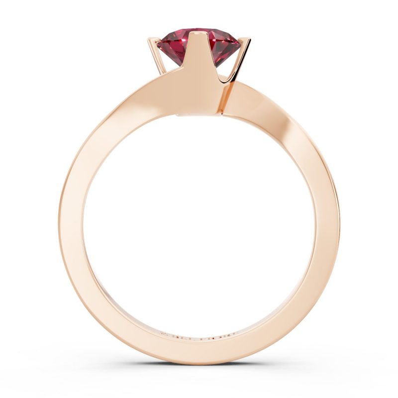 A bold statement of love and passion, this solitaire ring showcases a captivating round-cut ruby set in lustrous 18K rose gold. The twisted band adds a modern elegance, while the deep red hue of the gem evokes timeless romance.