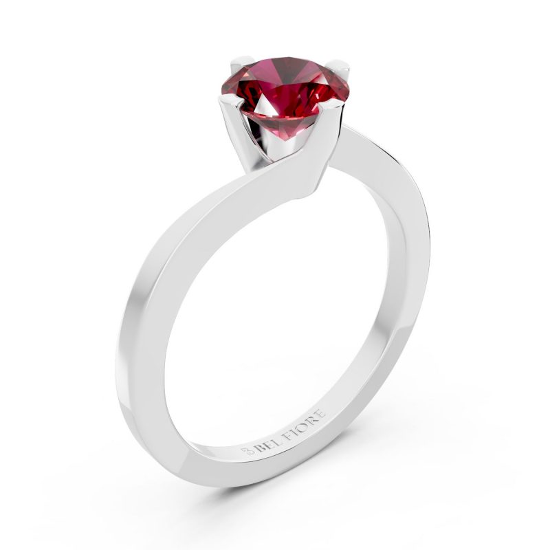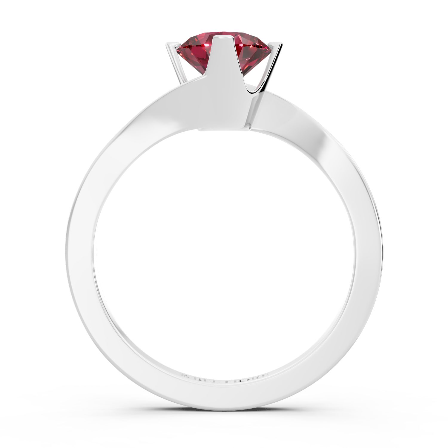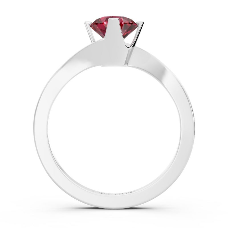 A masterstroke of modern elegance, this solitaire ring showcases a brilliant round-cut ruby ablaze in a pristine 18K white gold setting. The sleek twisted shank brings fluidity to the design, accentuating the deep red gem with bold contrast and refined sophistication.