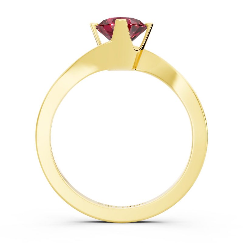 Radiating fiery elegance, this solitaire ring features a vivid round-cut ruby cradled in rich 18K yellow gold. The graceful twist of the band offers a contemporary silhouette, highlighting the stone’s deep scarlet brilliance with regal charm.