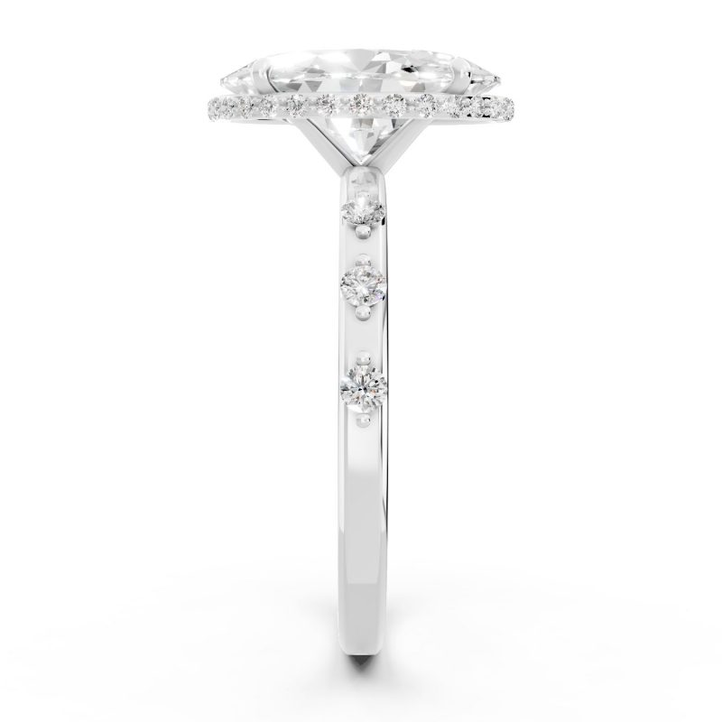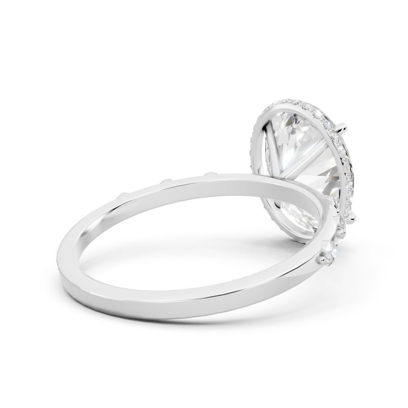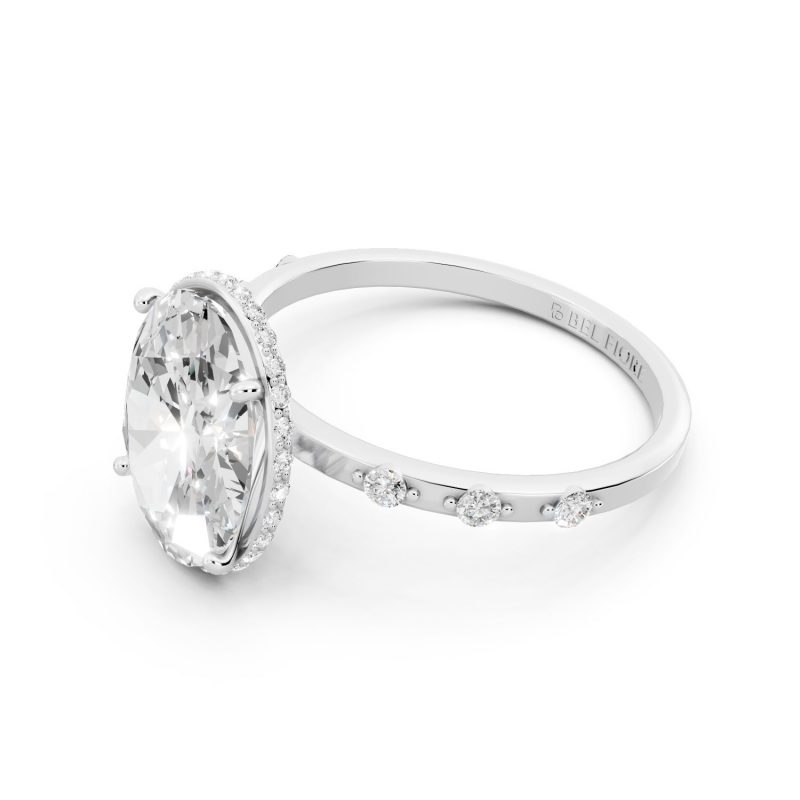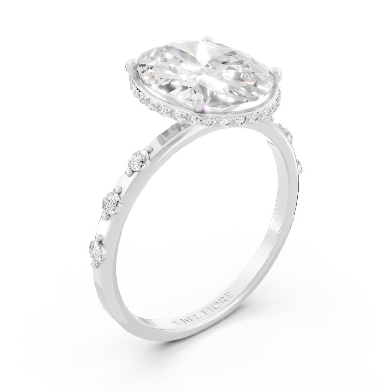 An icon of elegance, this Bel Fiore ring boasts a stunning oversized oval-cut diamond set in sleek 18K white gold. A halo of micro-pavé diamonds delicately frames the center stone, maximizing brilliance without overwhelming the silhouette.