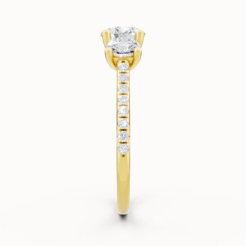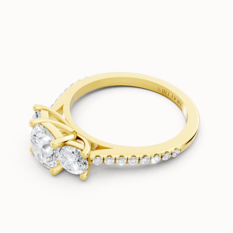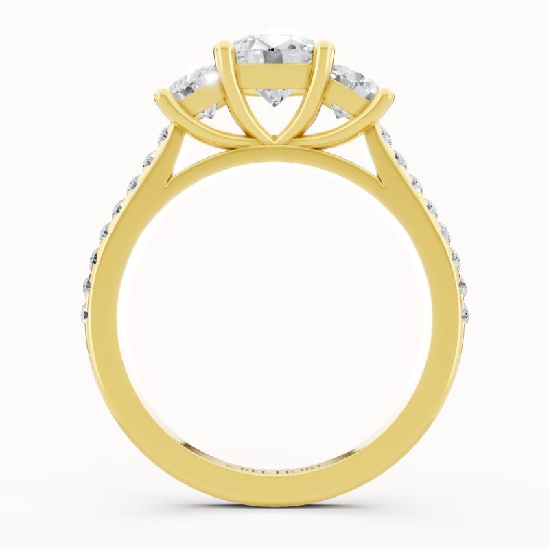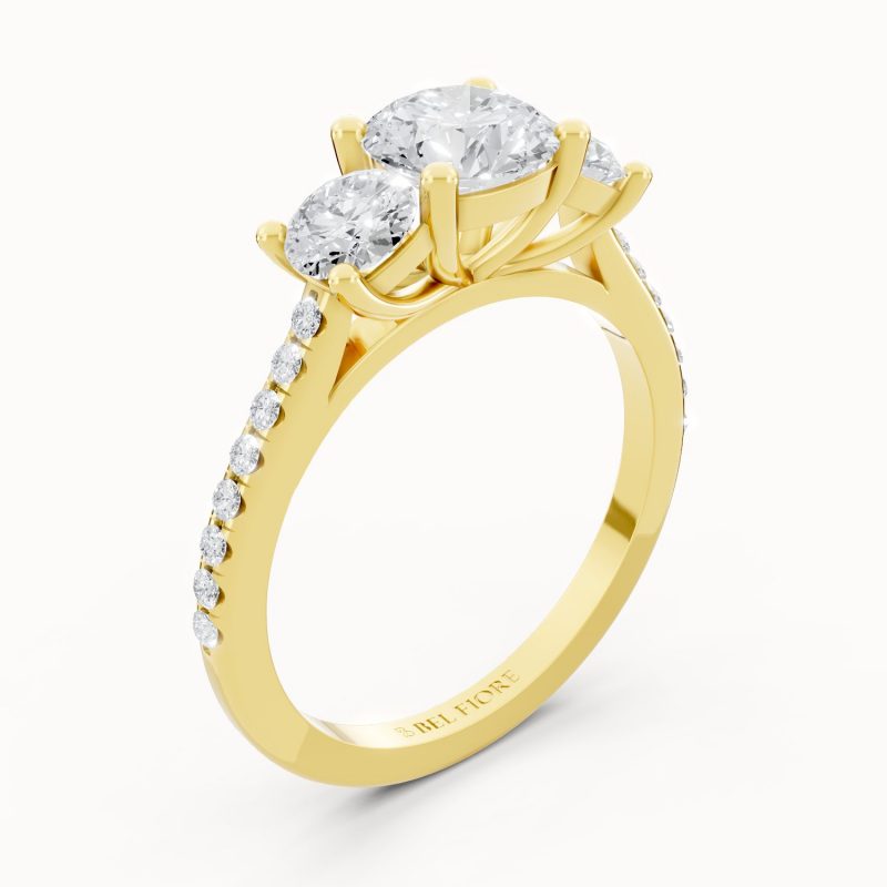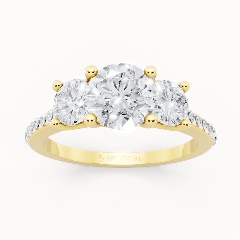 Set in rich yellow gold, this three-stone diamond ring radiates warmth and sophistication. The brilliant center diamond, accompanied by two sparkling side stones and a glittering pavé band, captures the essence of timeless romance and enduring beauty.