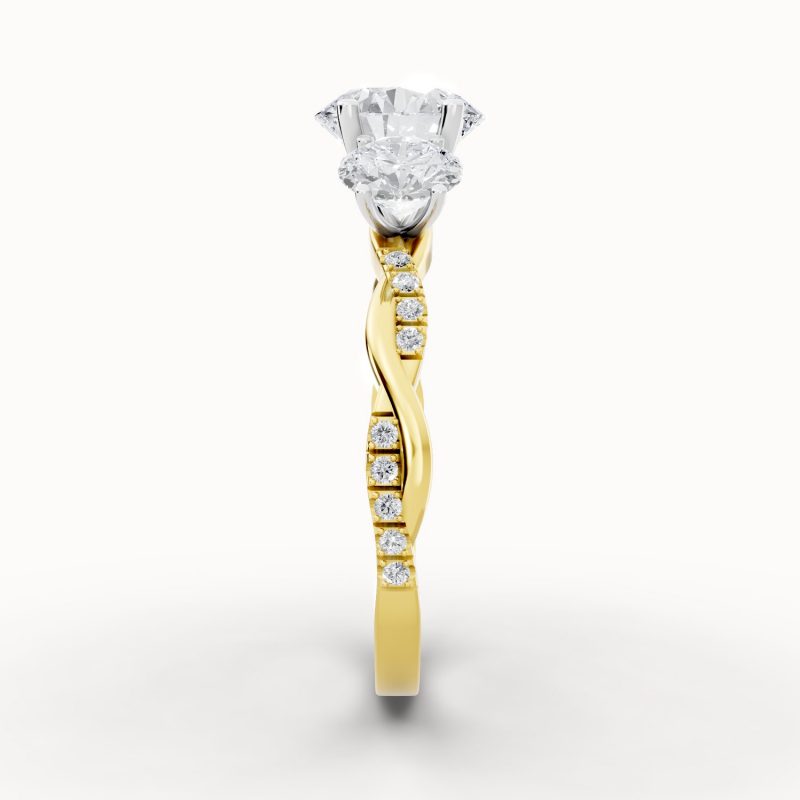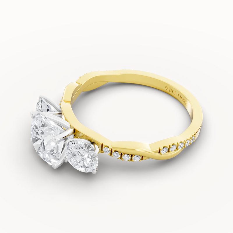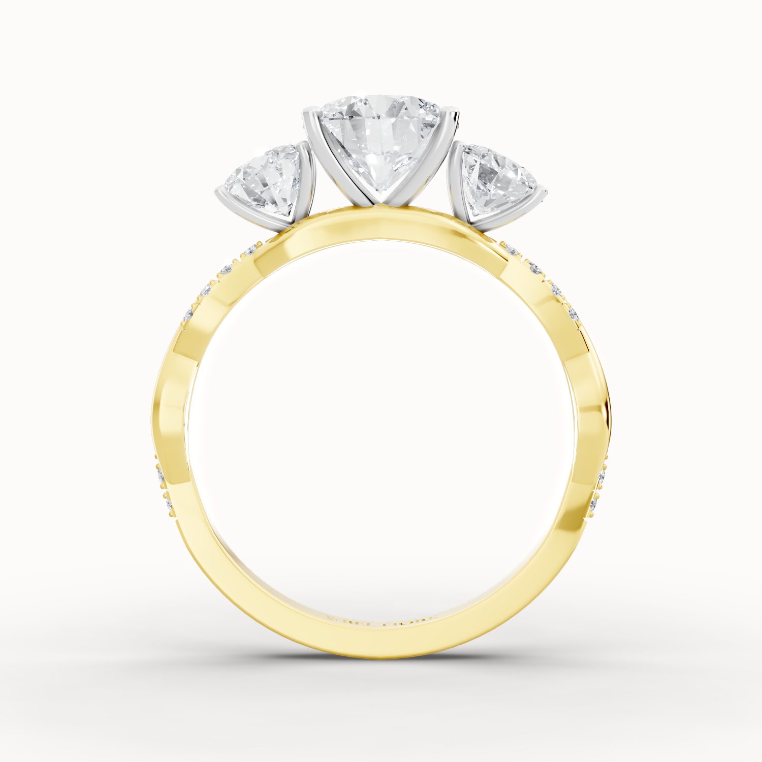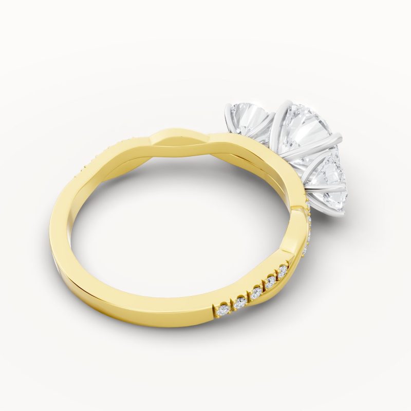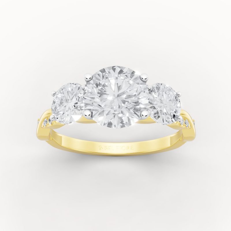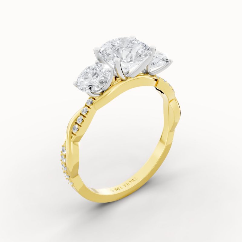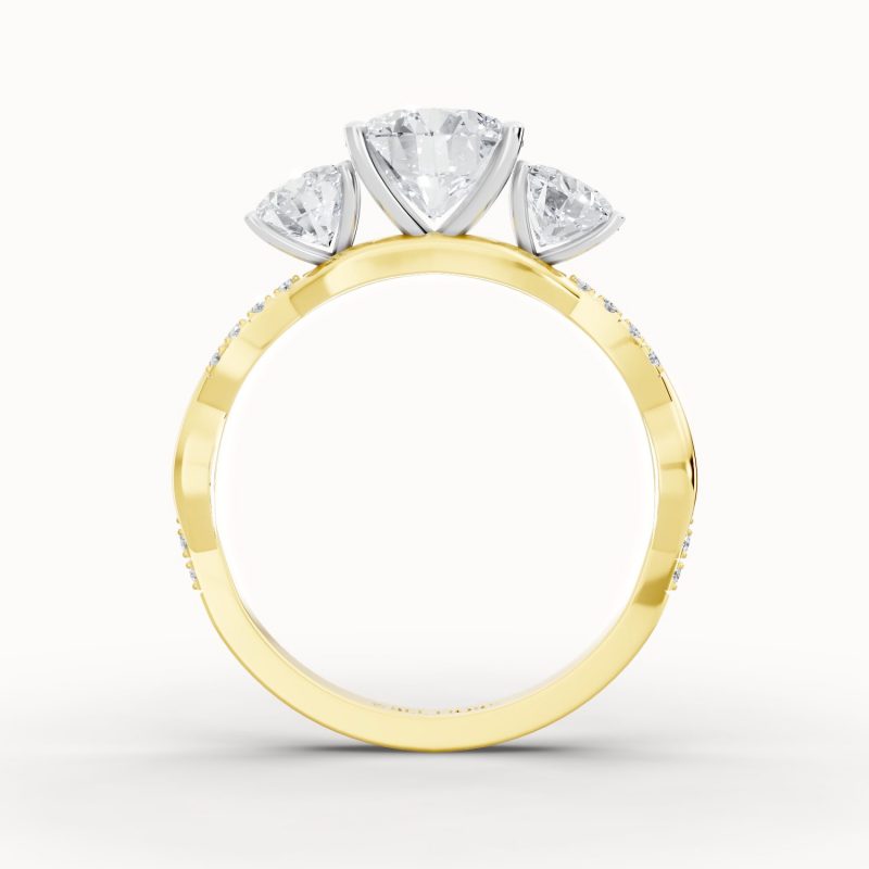 Featuring a stunning white head atop a golden shank, this three-stone diamond ring delivers a striking two-tone effect. The white head maximizes the fire and sparkle of the center and side diamonds, while the warm band — available in rose or yellow gold — adds contrast and depth. A modern masterpiece with timeless allure.