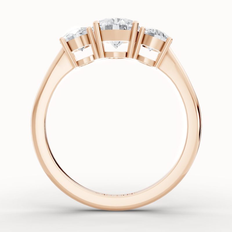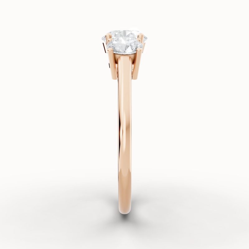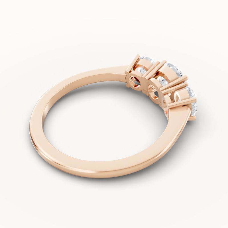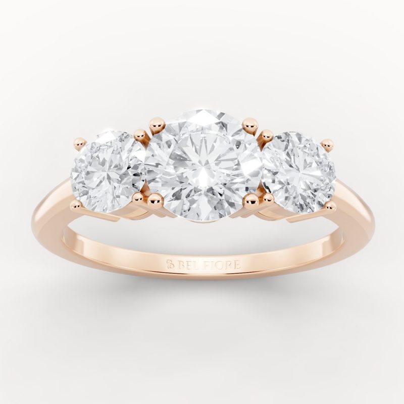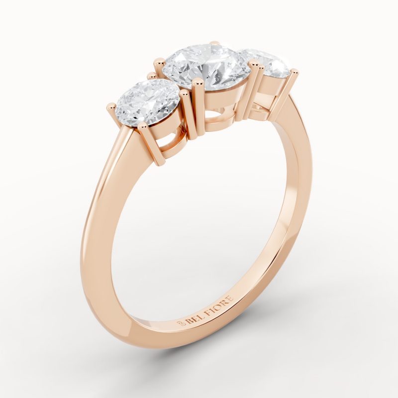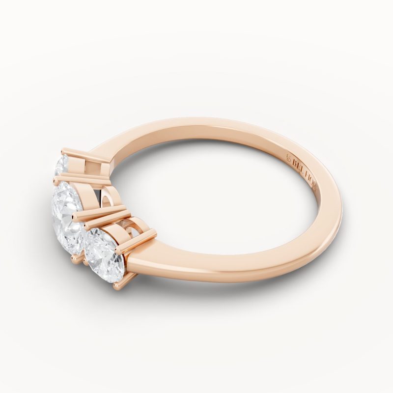 Crafted in warm rose gold, this three-stone ring celebrates love’s timeless journey. The central round brilliant diamond, flanked by two sparkling side stones, radiates brilliance and grace. The blush tones of rose gold enhance its romantic charm, making it a perfect symbol of everlasting devotion.