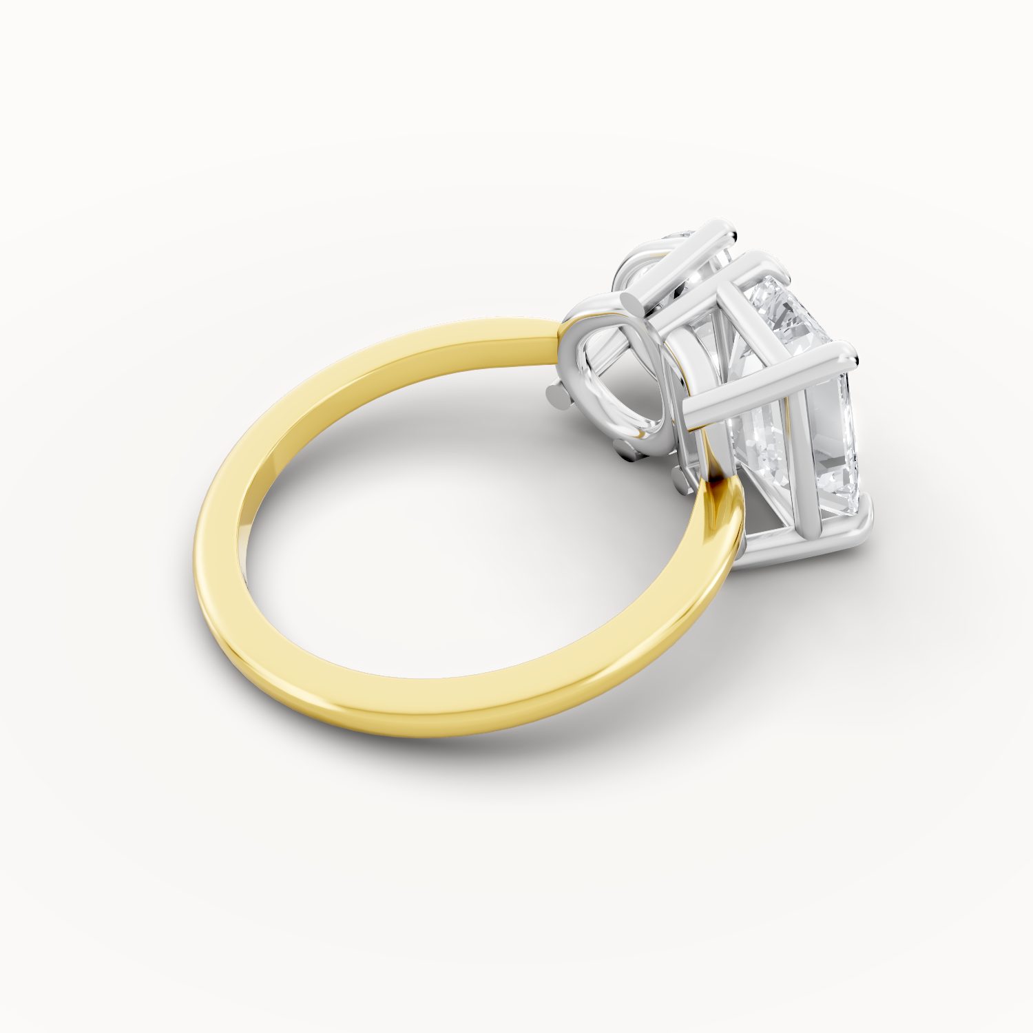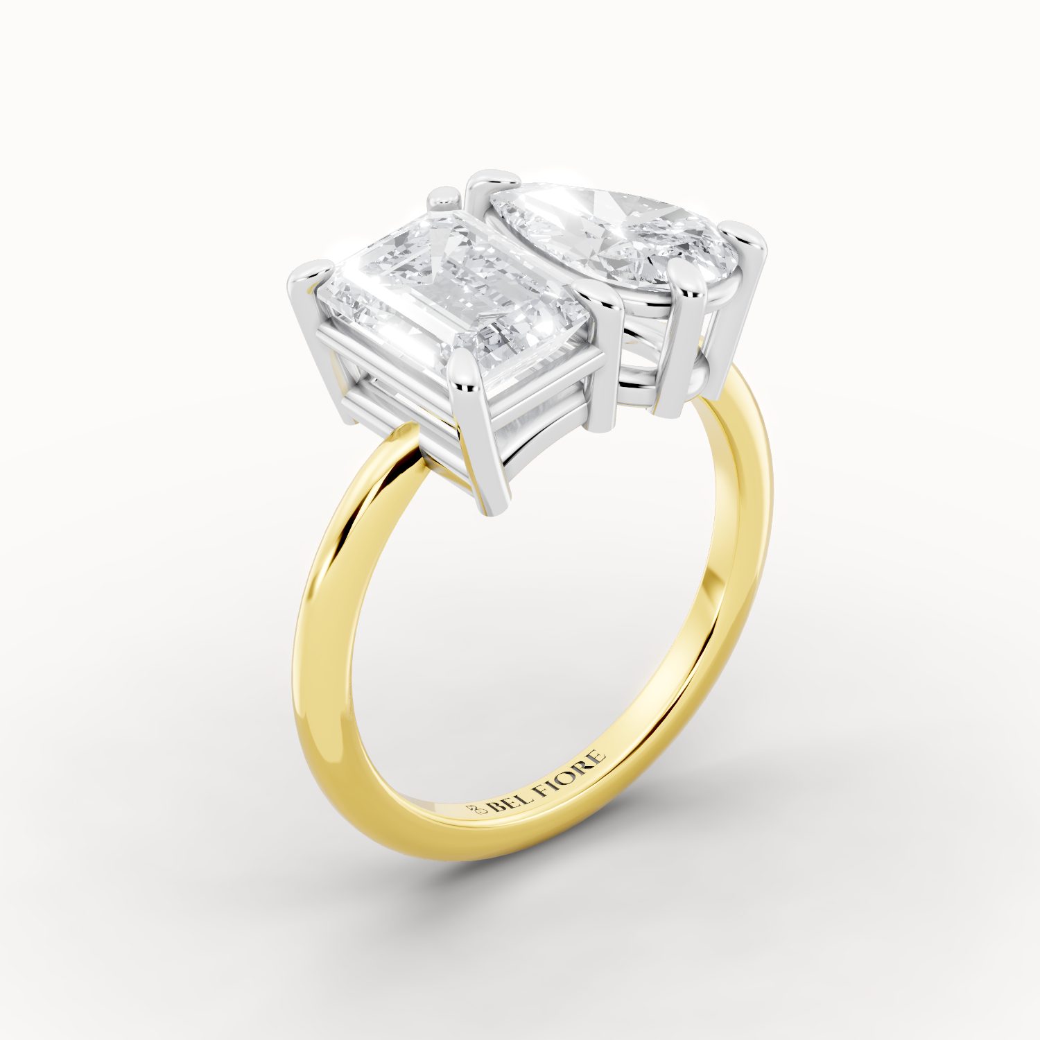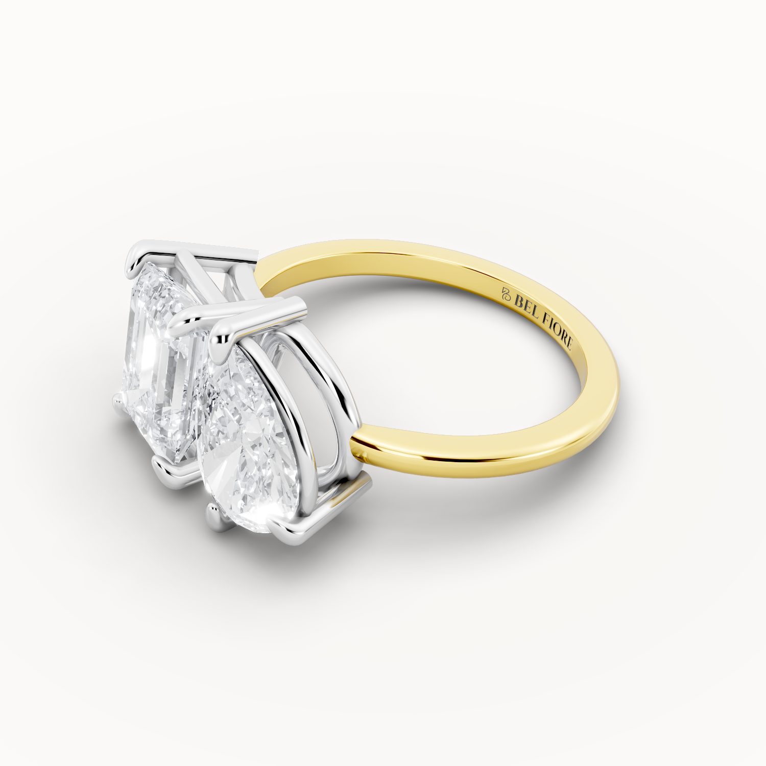 This captivating two-tone design features a white-gold head that intensifies the sparkle of the emerald and pear-shaped diamonds, complemented by a warm gold band. The blend of tones creates a perfect harmony of cool radiance and golden warmth — a symbol of balance, love, and individuality.