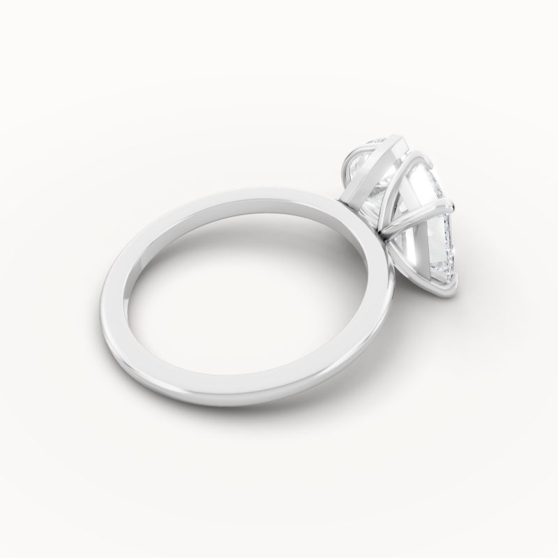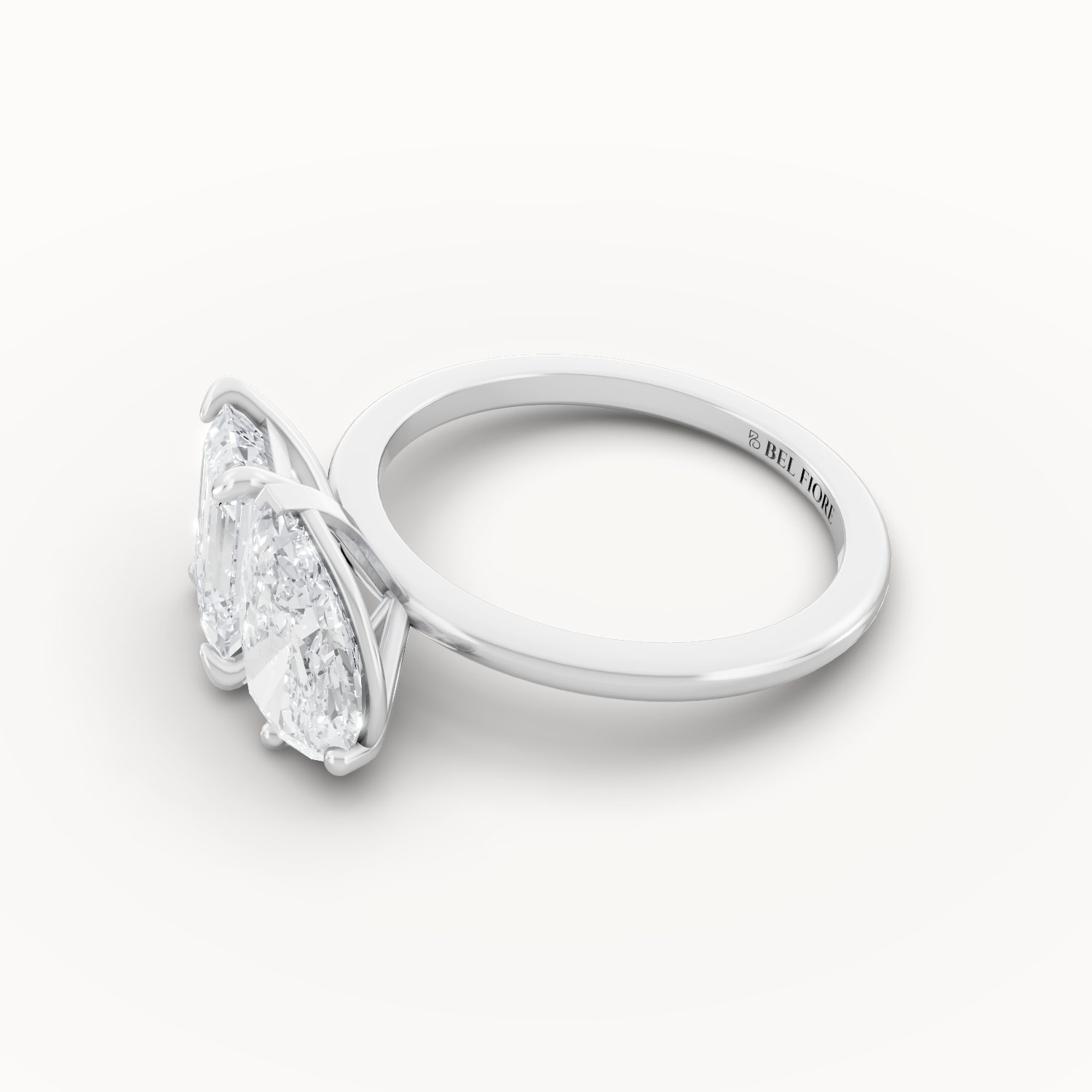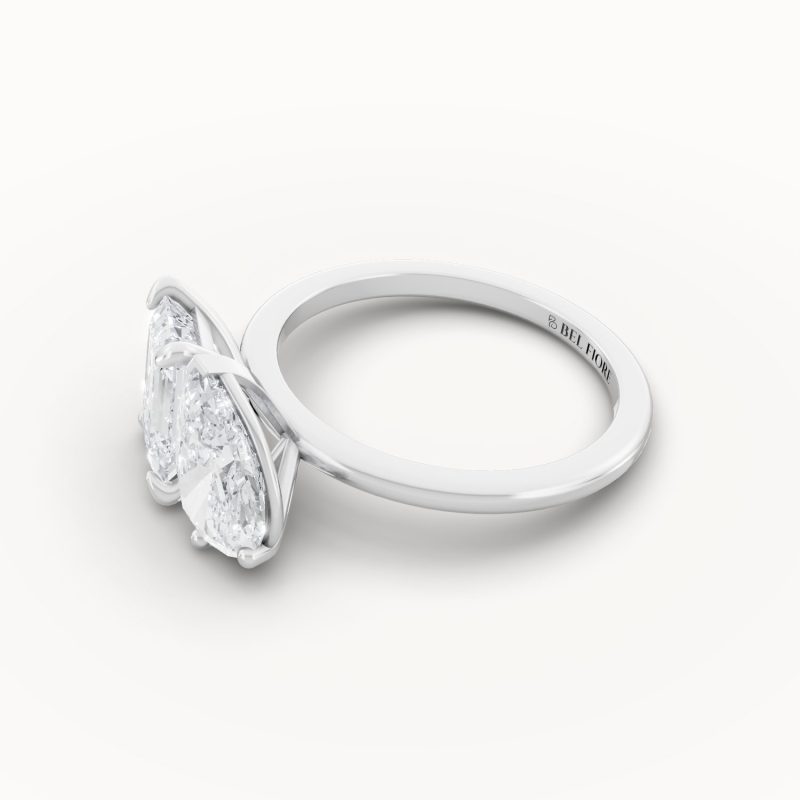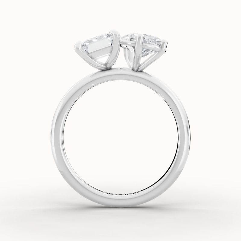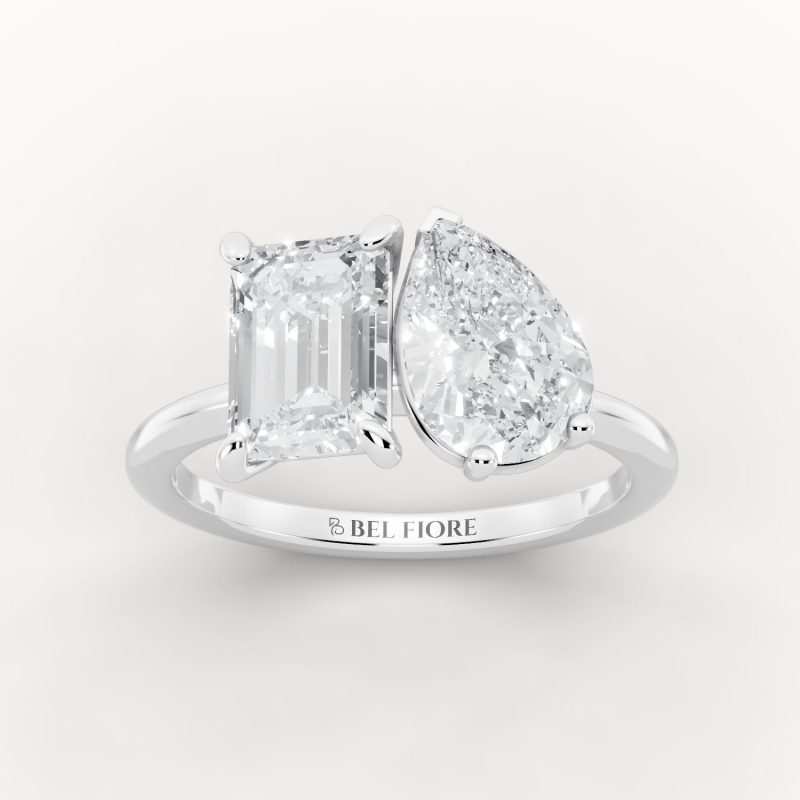 Crafted in luminous white gold, this two-stone ring presents a striking emerald-cut diamond paired with a pear-shaped diamond. The clean, radiant finish of white gold enhances the timeless beauty of the design, offering sophistication with a modern twist.