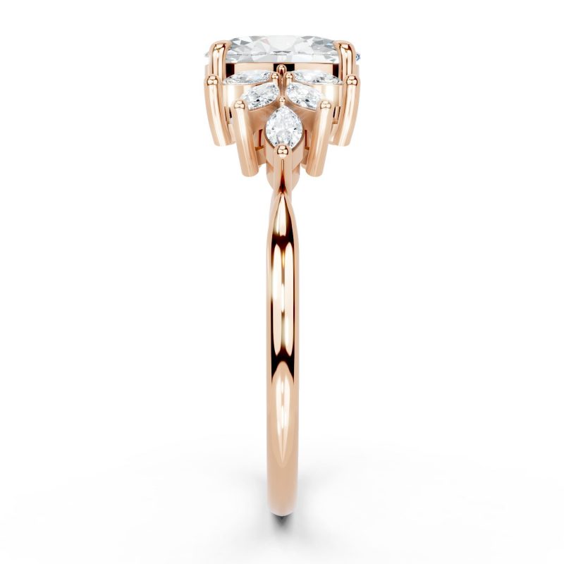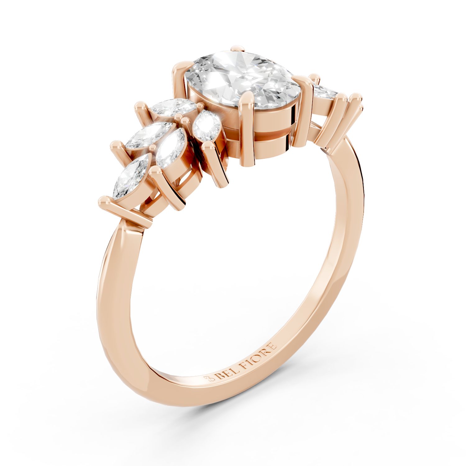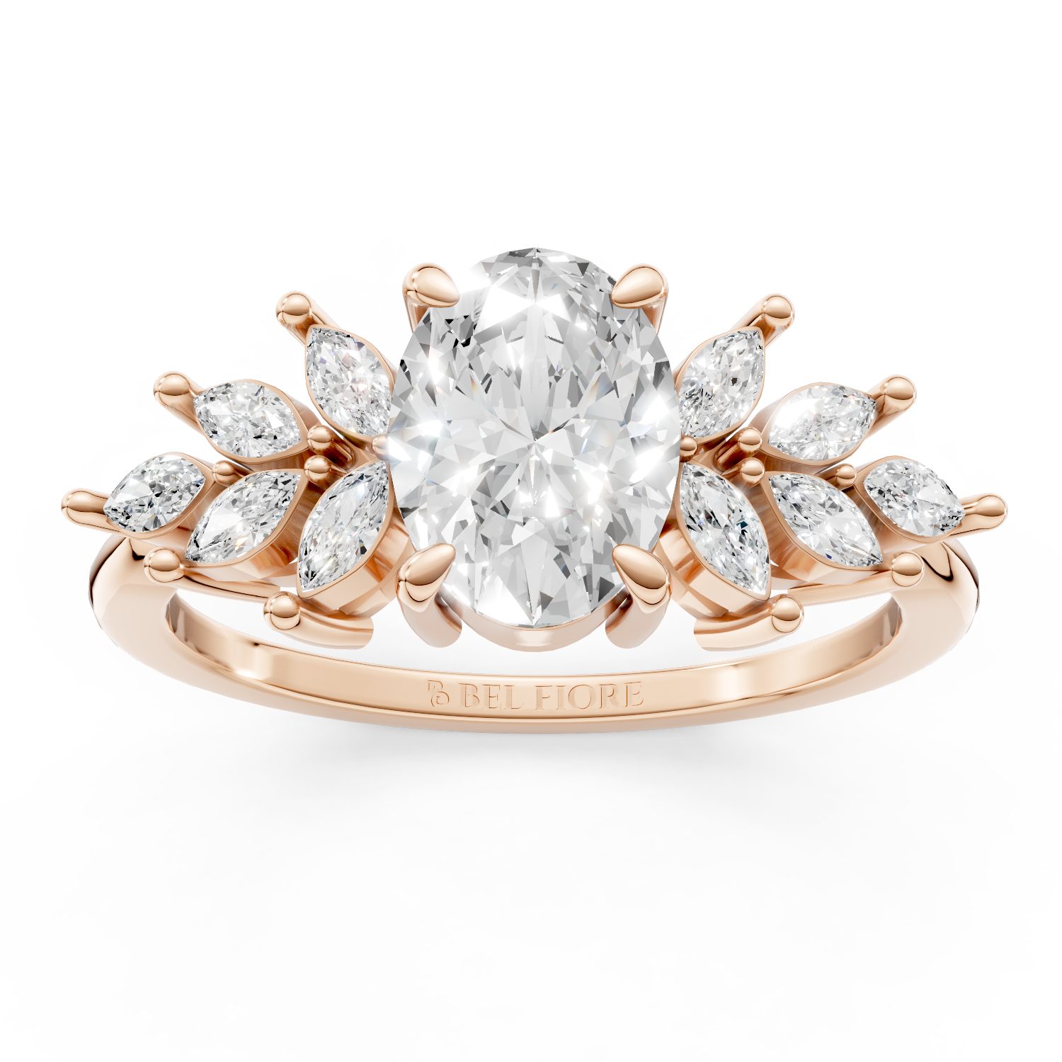 A dazzling oval-cut diamond takes center stage in this graceful rose gold ring, adorned with marquise-cut diamond accents in a floral-inspired arrangement. Elegant and timeless, it’s a breathtaking symbol of love and brilliance.