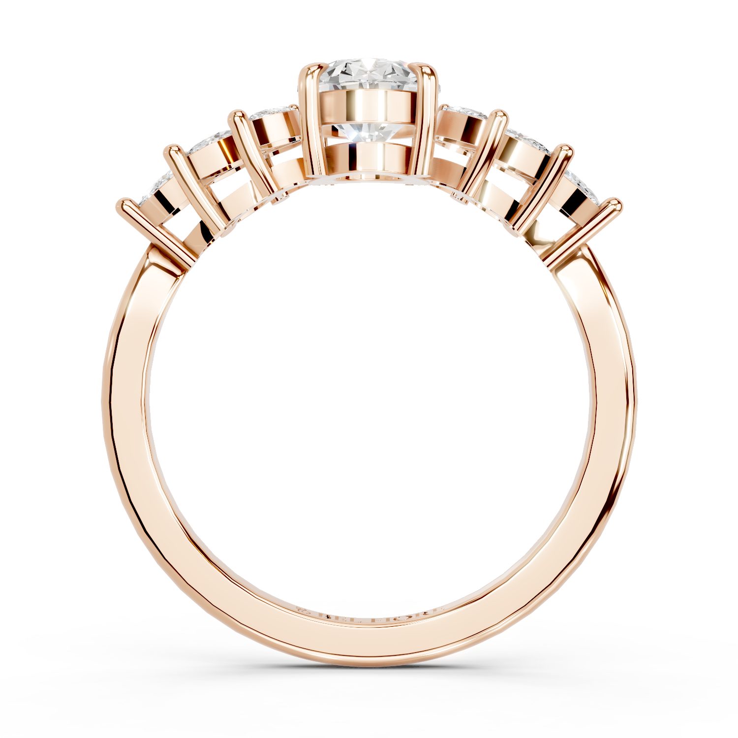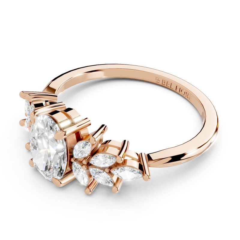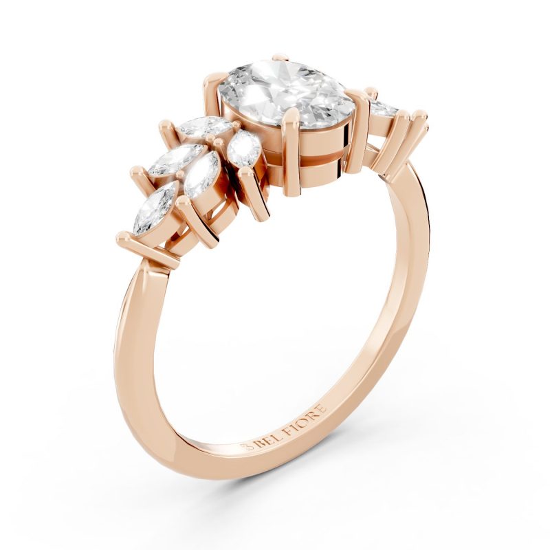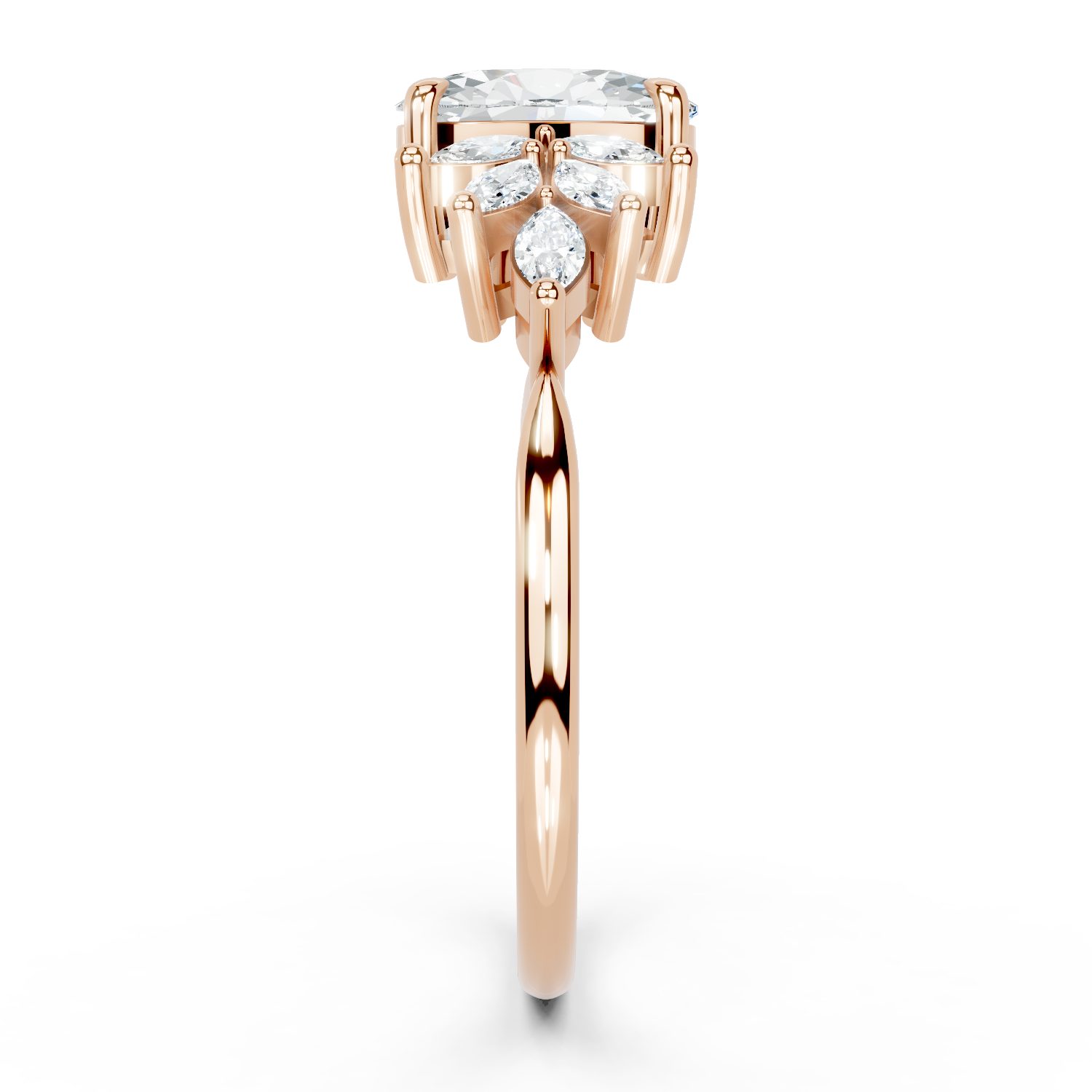 A dazzling oval-cut diamond takes center stage in this graceful rose gold ring, adorned with marquise-cut diamond accents in a floral-inspired arrangement. Elegant and timeless, it’s a breathtaking symbol of love and brilliance.