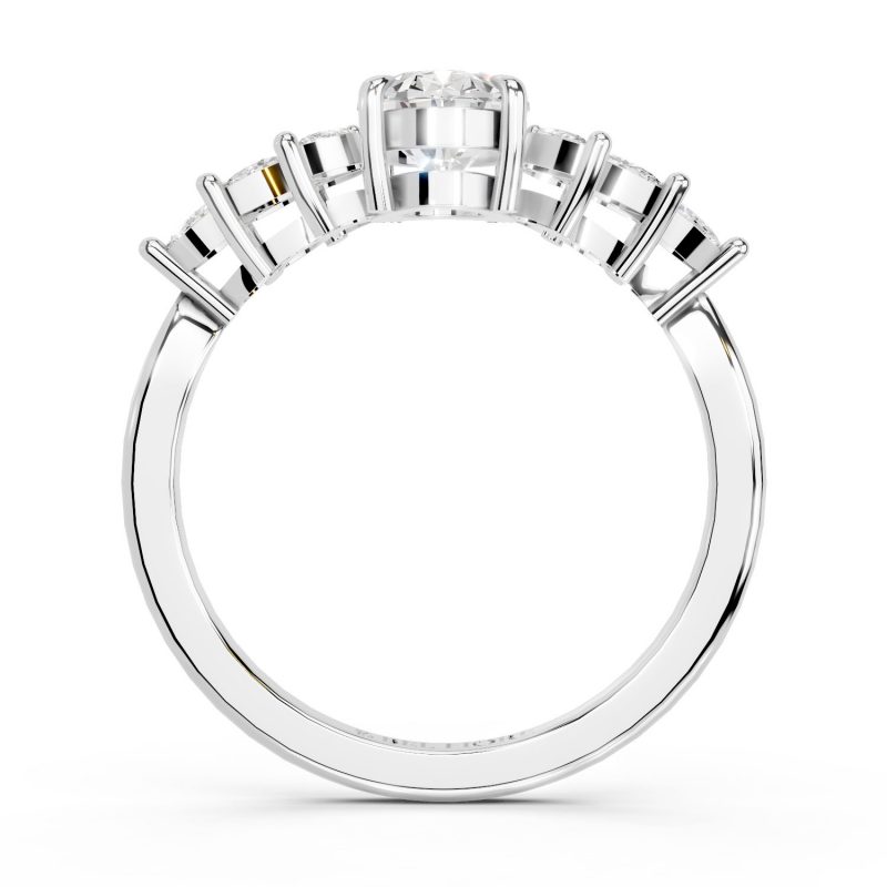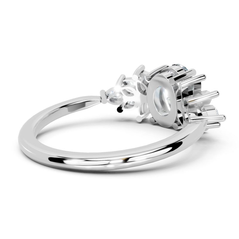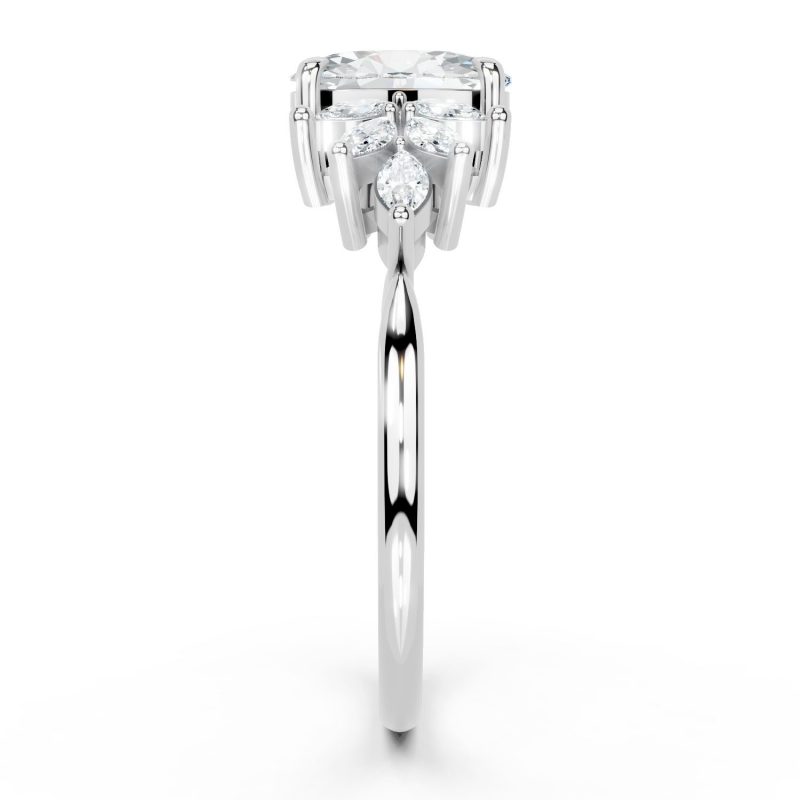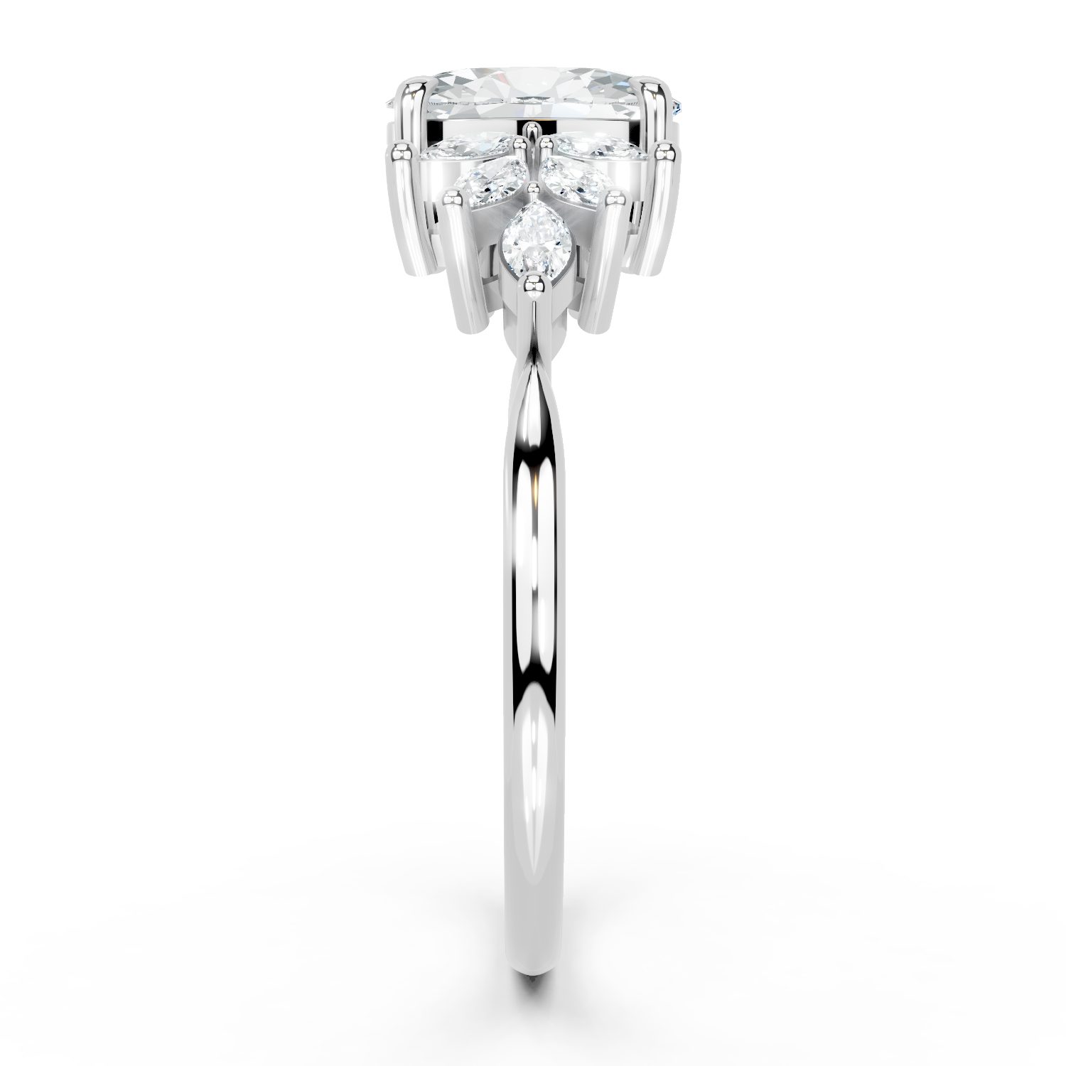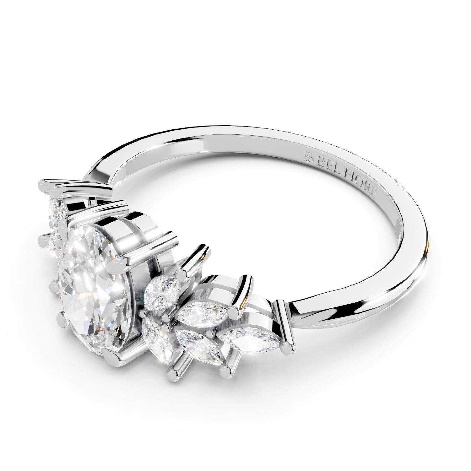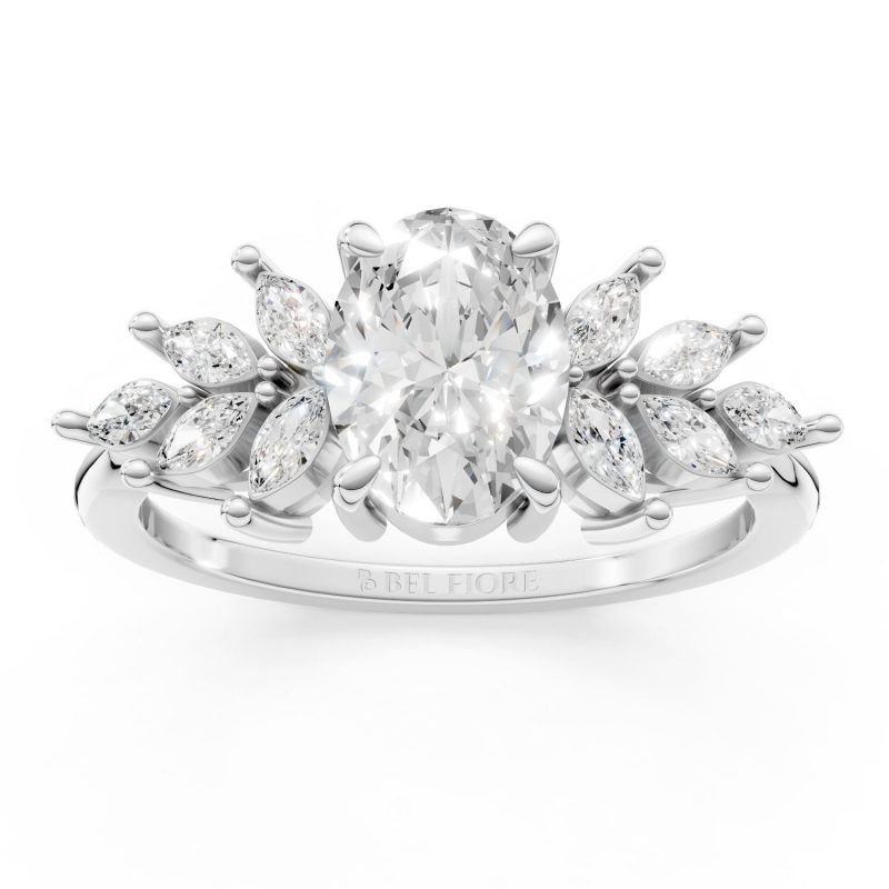 A brilliant oval-cut diamond glows at the heart of this refined white gold ring, surrounded by sparkling marquise diamonds in a graceful floral arrangement. Pure, timeless elegance designed to dazzle forever.